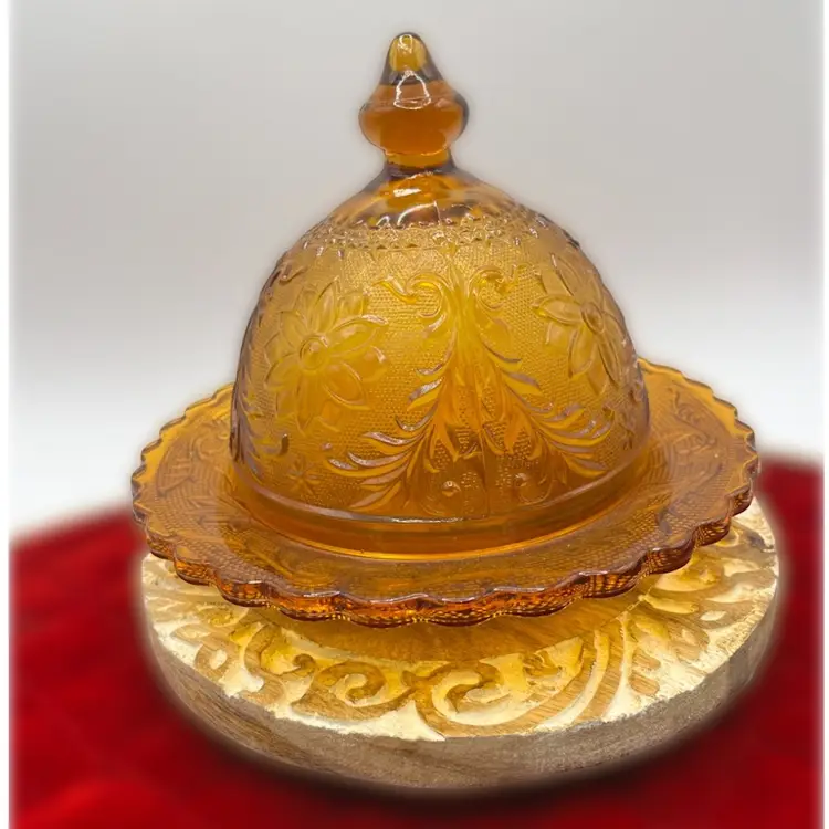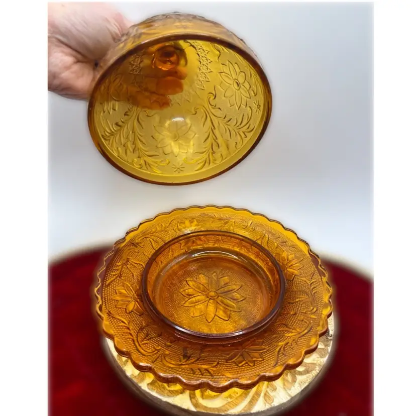 The Vintage 7.25” diameter Indiana Glass Tiara Sandwich Amber Covered Round Butter Dish with Lid is a charming piece of decorative cookware made of pressed glass. Featuring a floral pattern and a glossy finish, this original butter dish was manufactured in the United States during the 1970s.