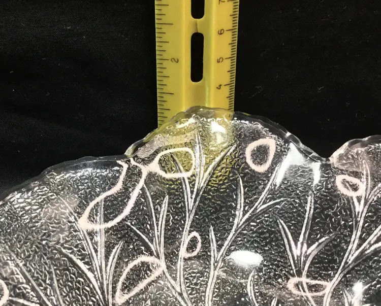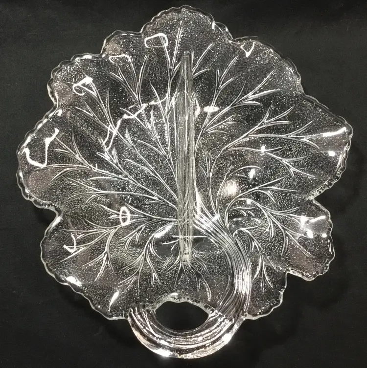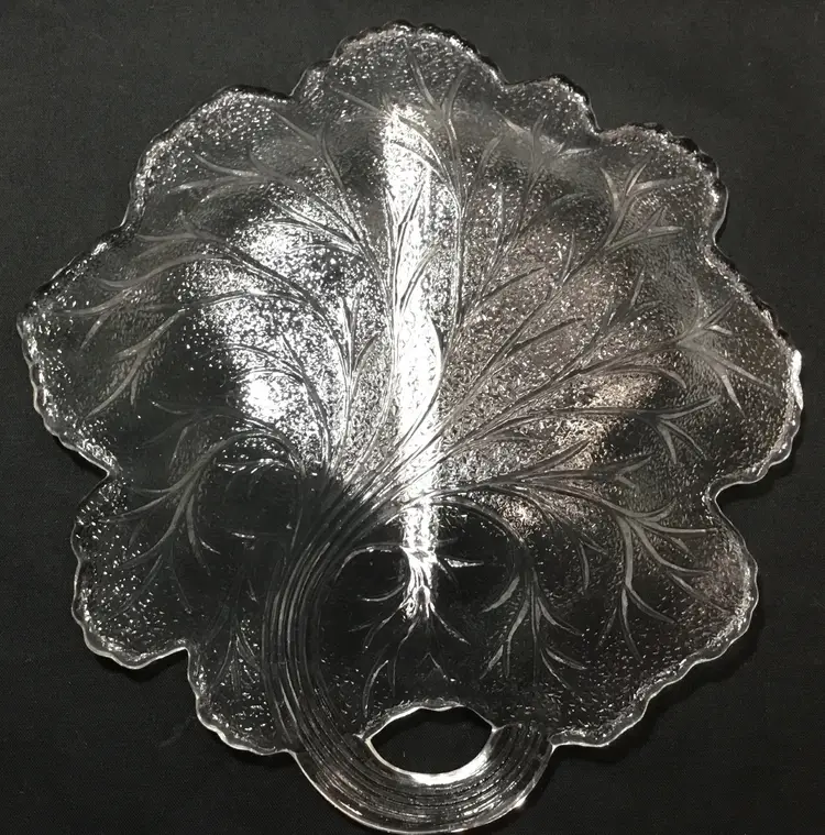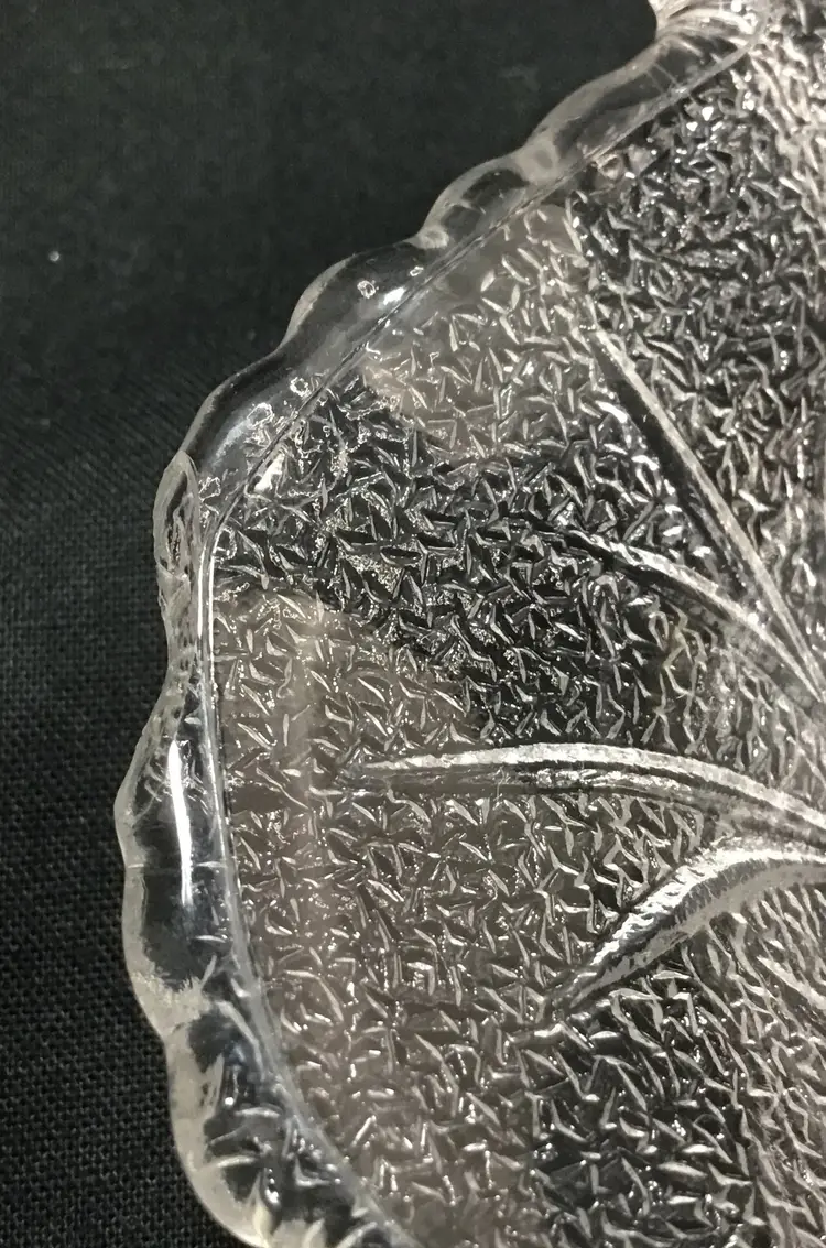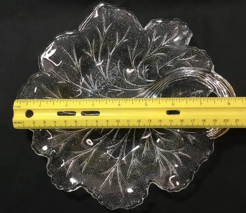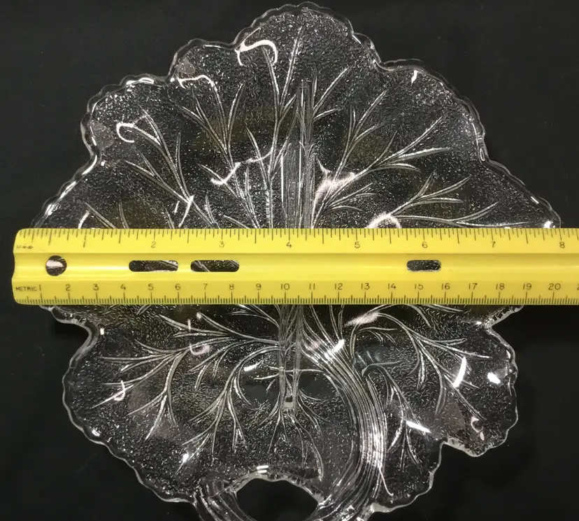 8.5 inches tall by 8 inches wide, 1.5 inches deep. Pressed glass, textured (pebbled, embossed) on the back side, tree with trunk swirled into a handle, many bare branches. Dish is shaped like a multi-lobed leaf with a clear scalloped rim. Straight, clear divider runs down the middle of the dish. 1/2 inch long chip off left edge. (See all photos)
