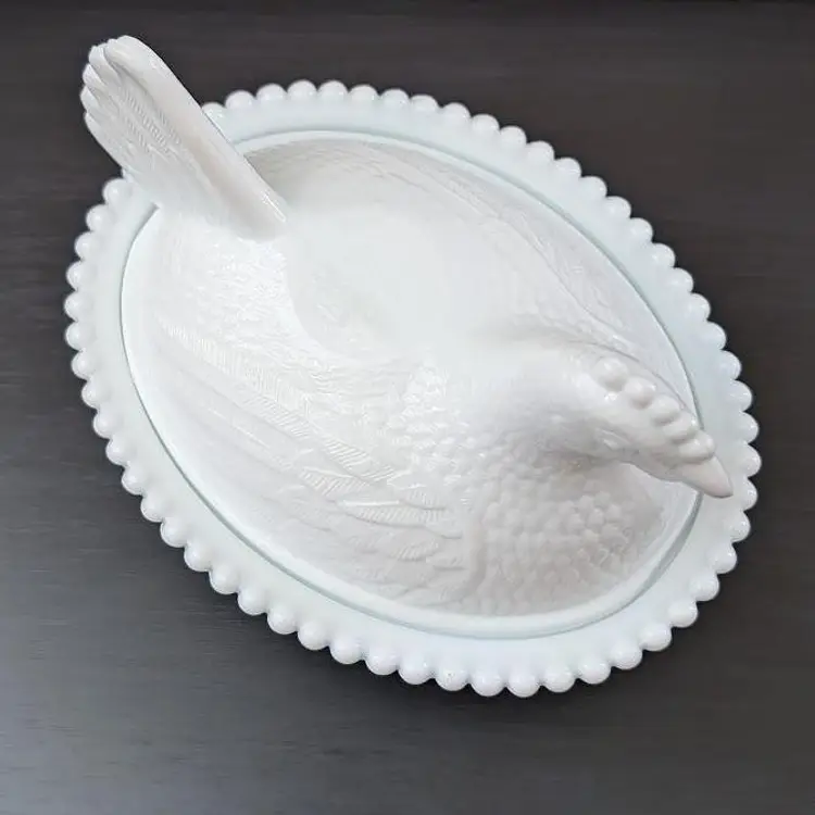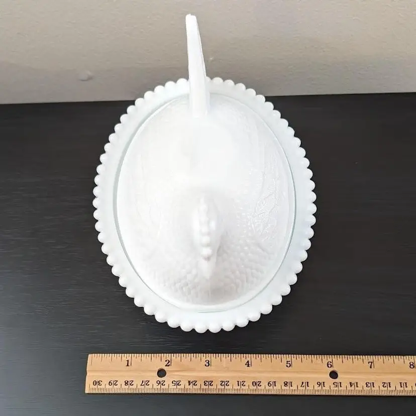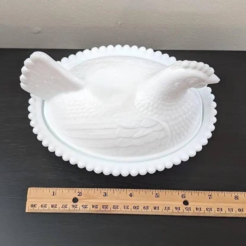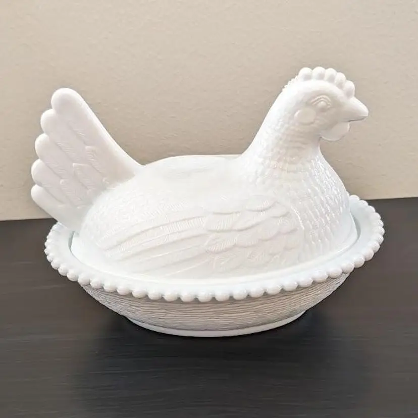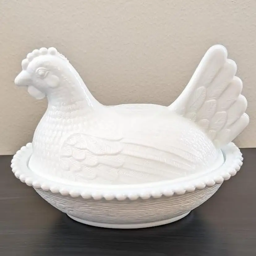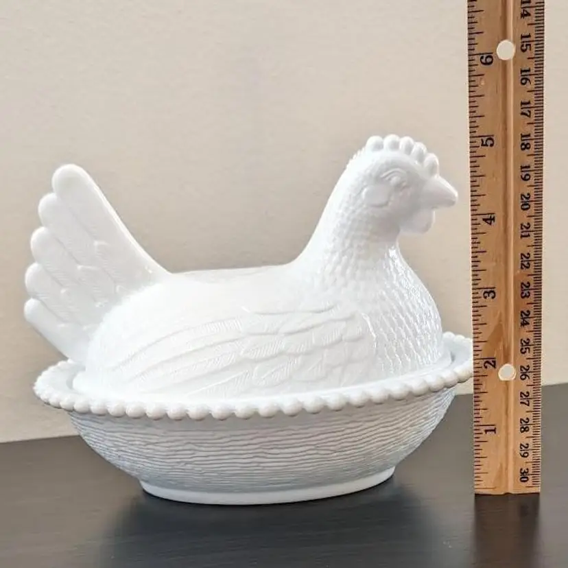 Large hen on nest. There is a swirl in the glass on the bottom of the nest seen from the inside (see pictures). Measurements ~ 7 x 5.5 x 5"
