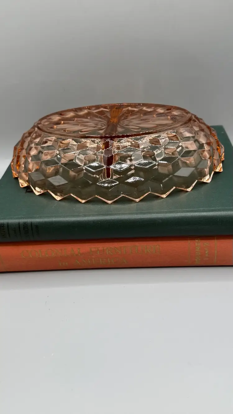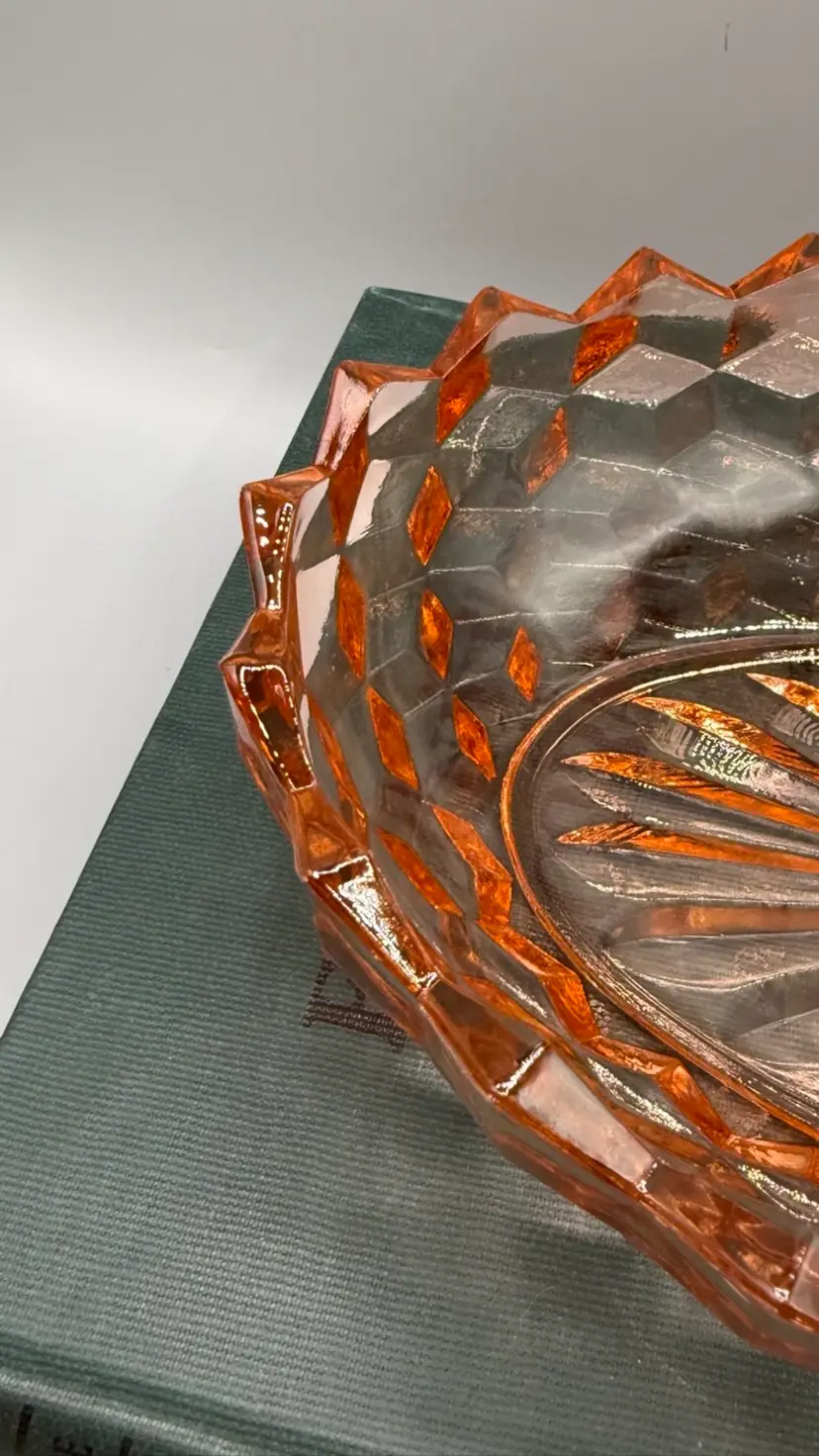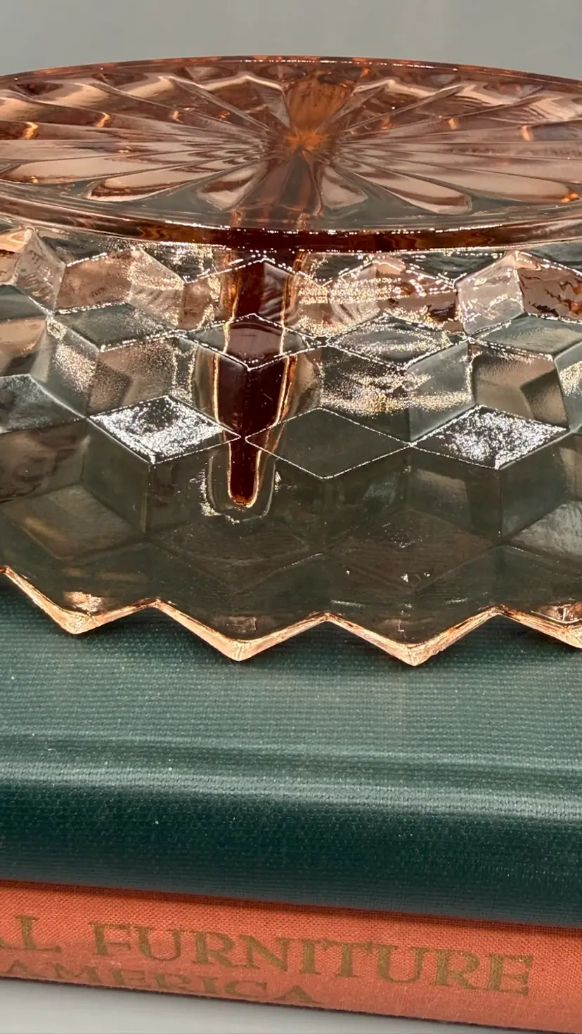 Whitehall pattern by Indiana Glass (Colony division). It features a heavy, pressed-glass construction with a striking geometric cubed or diamond-cut design and a 20-ray sunburst pattern on the base. Excellent condition with a couple of buffed out to smooth flea bites.