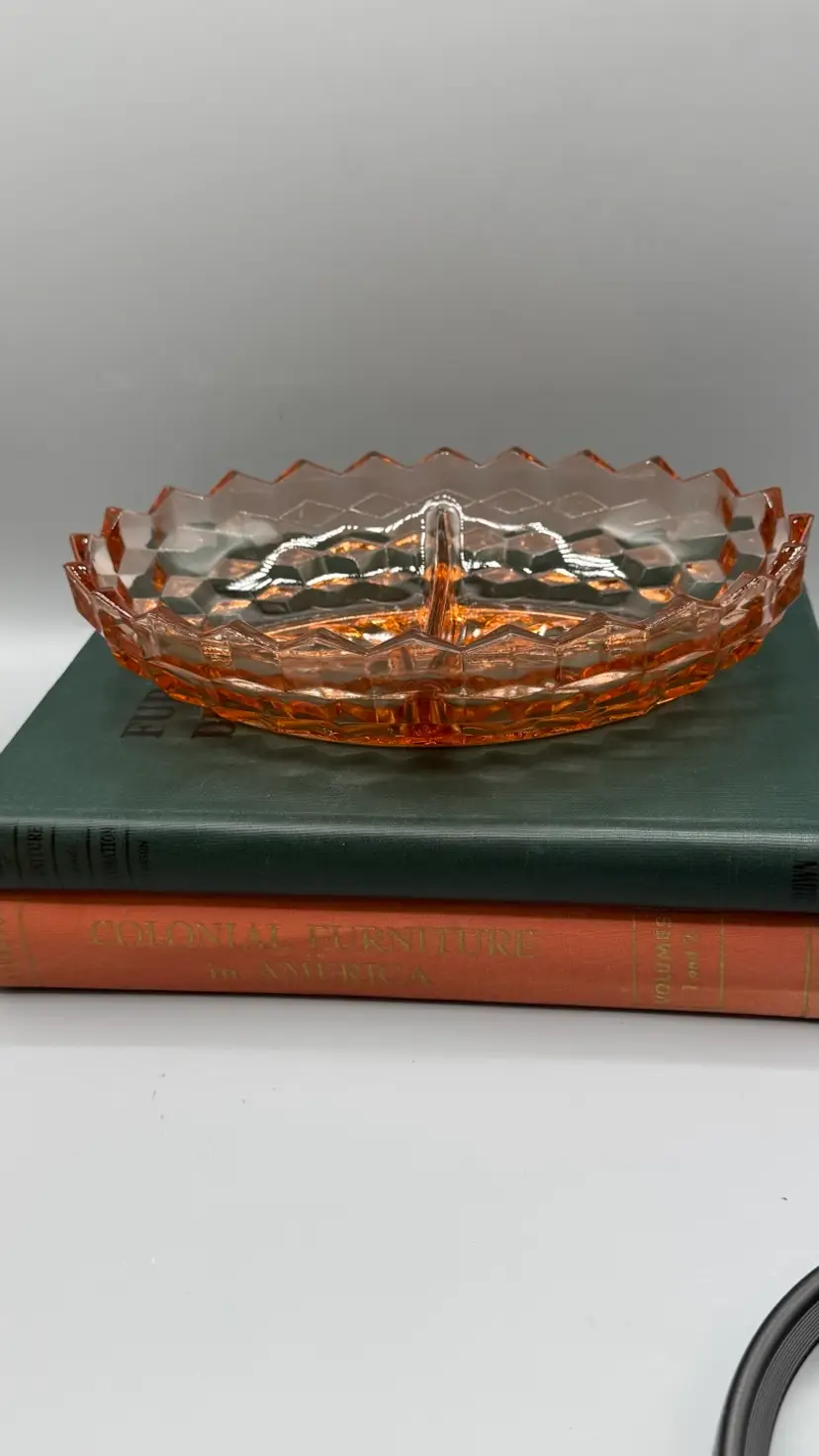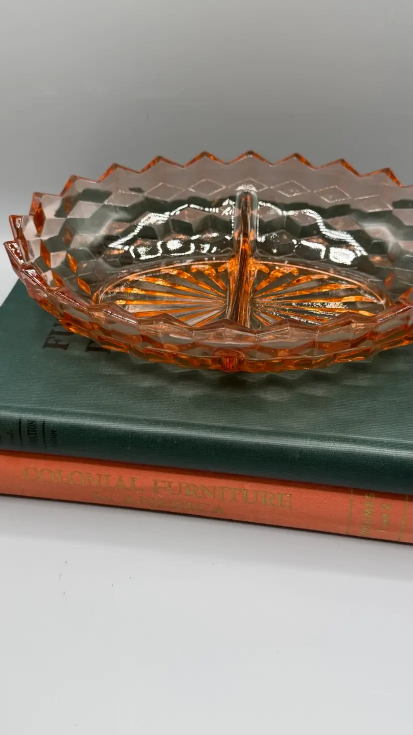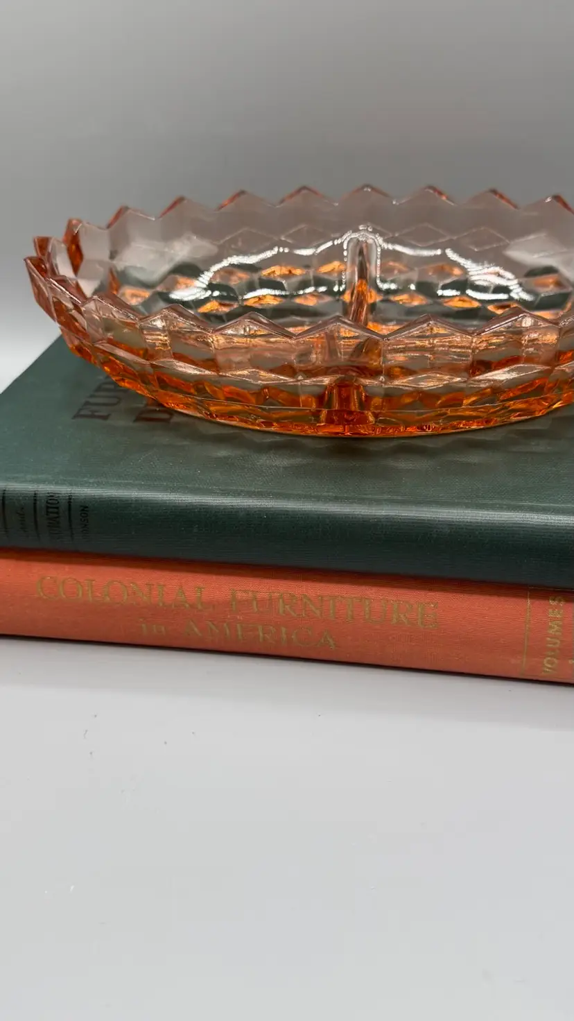 Whitehall pattern by Indiana Glass (Colony division). It features a heavy, pressed-glass construction with a striking geometric cubed or diamond-cut design and a 20-ray sunburst pattern on the base. Excellent condition with a couple of buffed out to smooth flea bites.