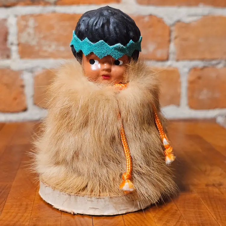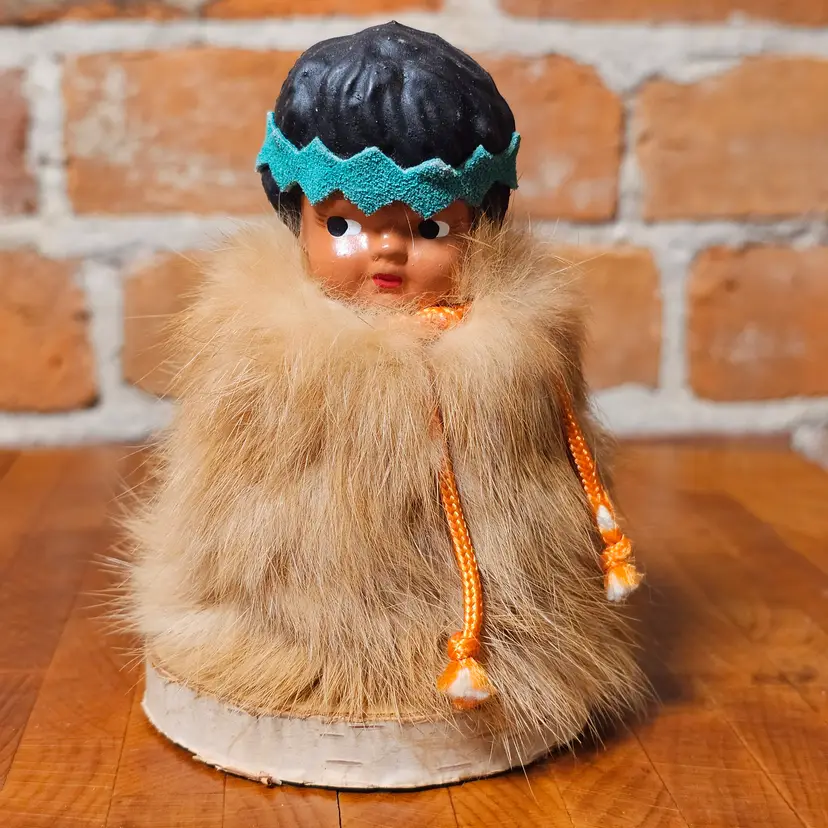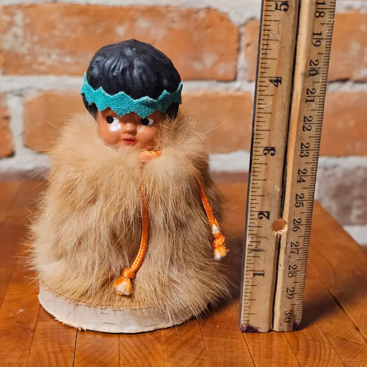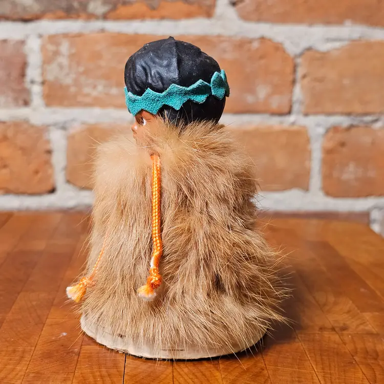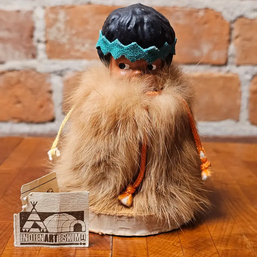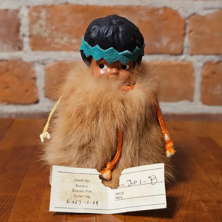 Details: • Marked Indien Arteskimo • Style 201-B • Made in Japan • Real fur trim garment • Molded head with painted facial details • Original attached paper tag and multilingual greeting booklet