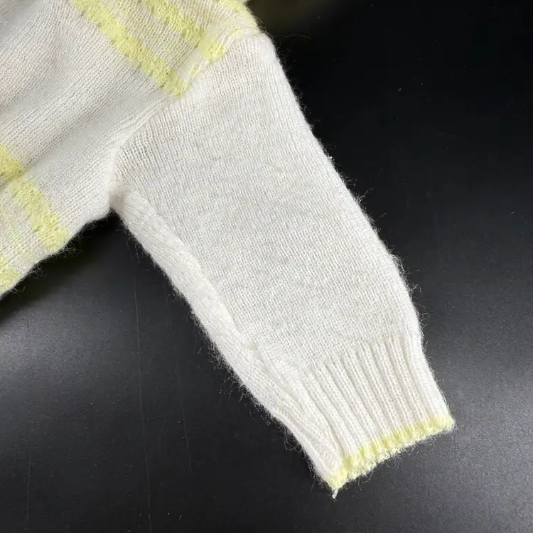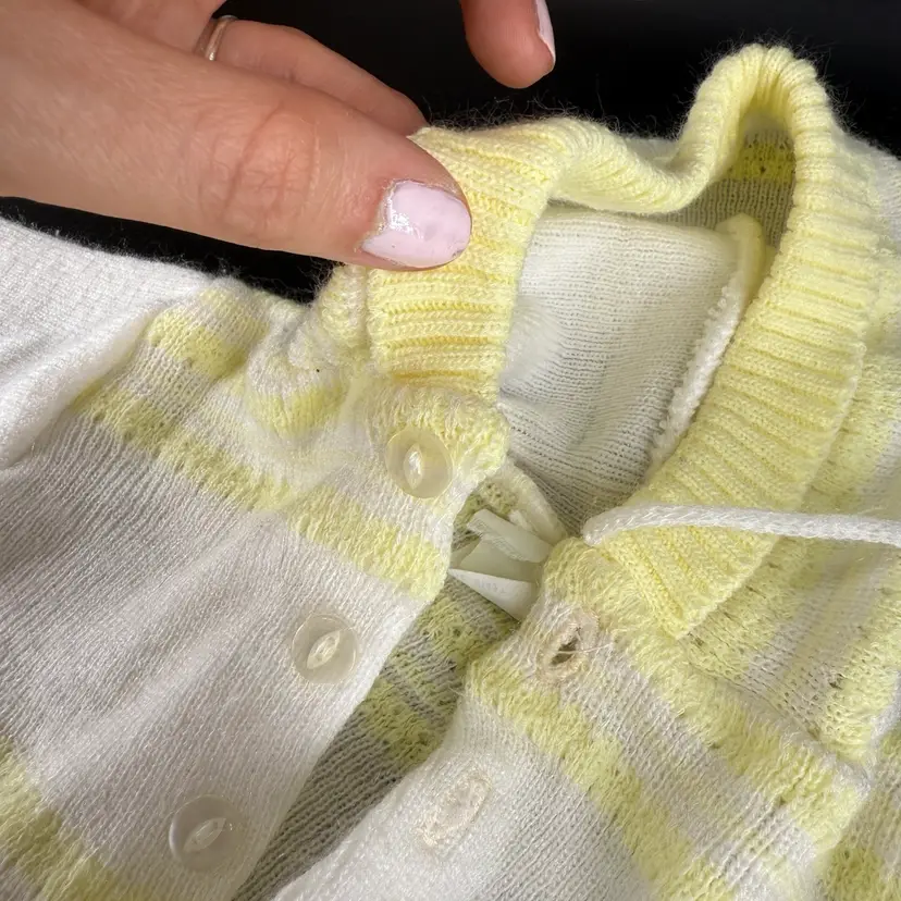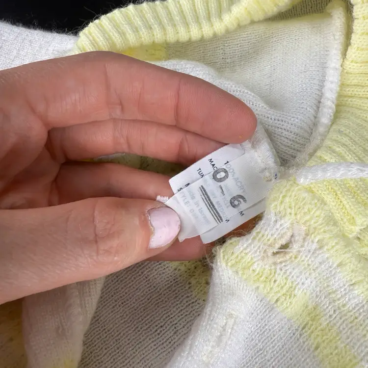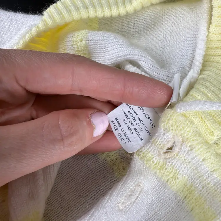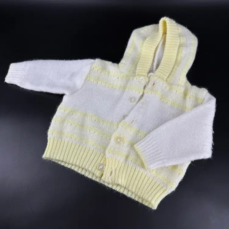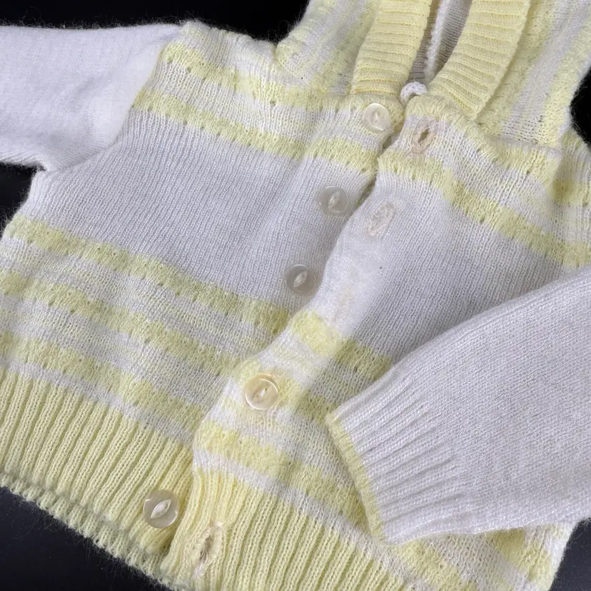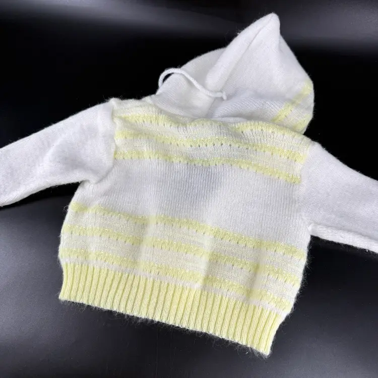 This sweater was made in Israel. It is marked Infant 0-6. There is some light discoloration and one string is missing as shown.
