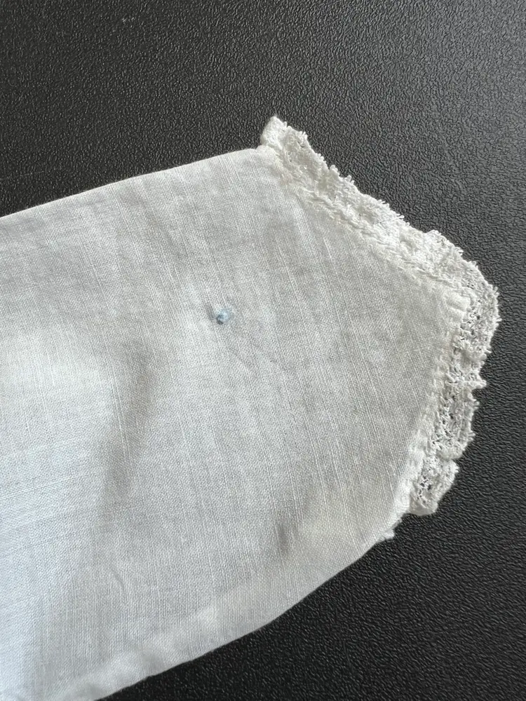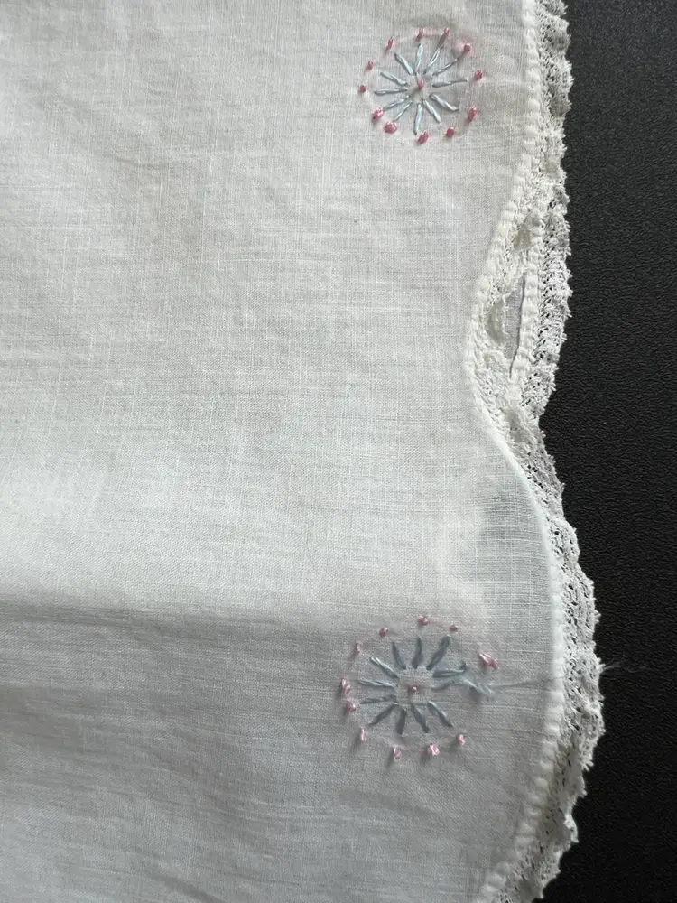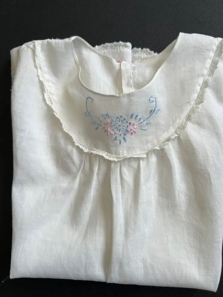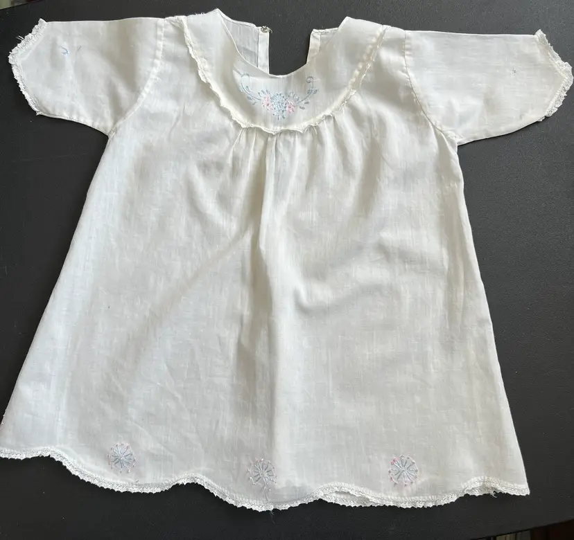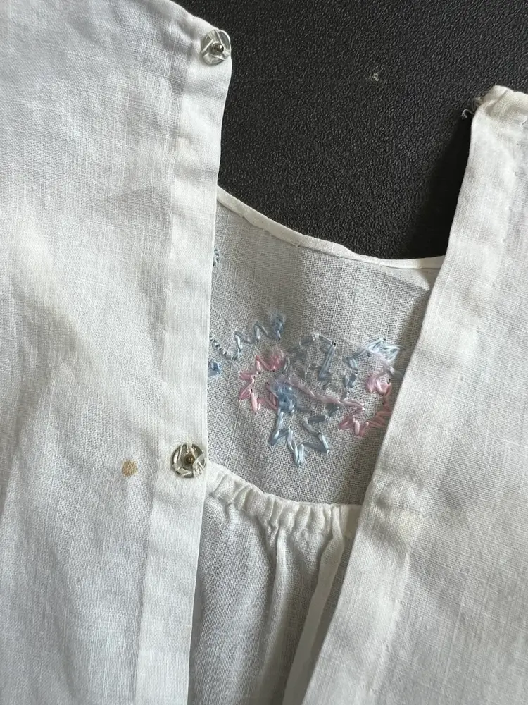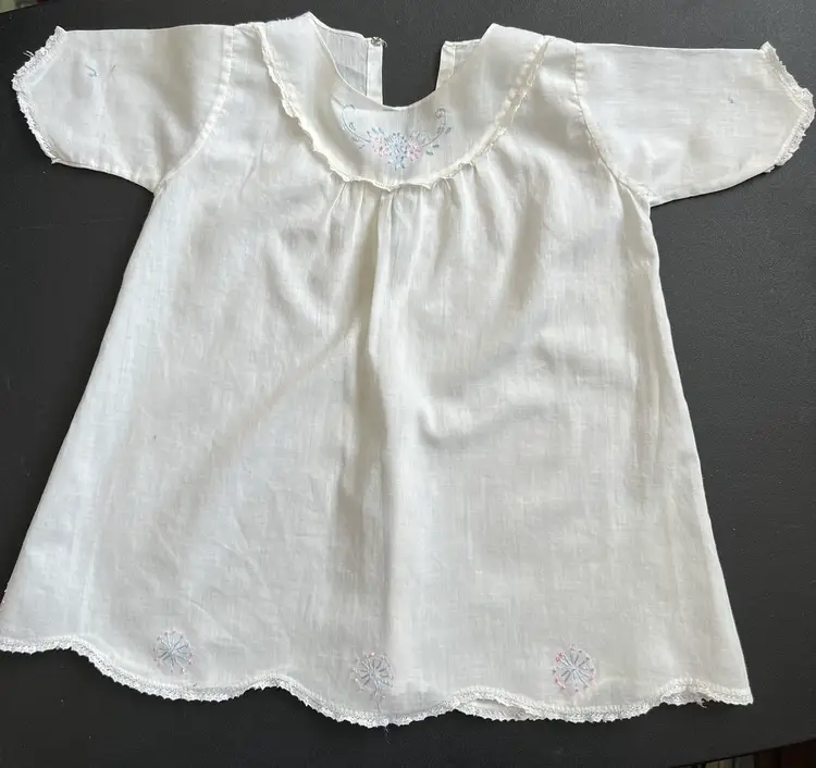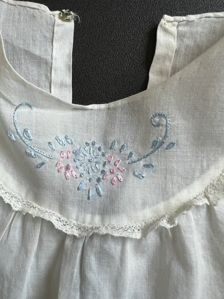 This tiny handmade dress is too cute for words! Whether someone wears it or displays it or repurposes it there’s no denying its appeal. Delicate blue and pink hand embroidery at the yoke and hem, the lace trim, unique sleeve shape, scalloped lace hem, and snap closure all add up to precious!