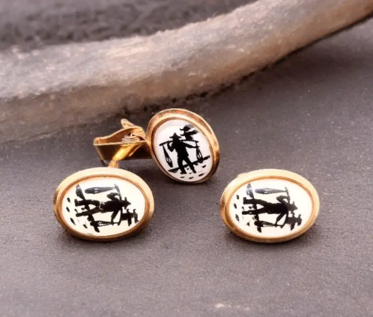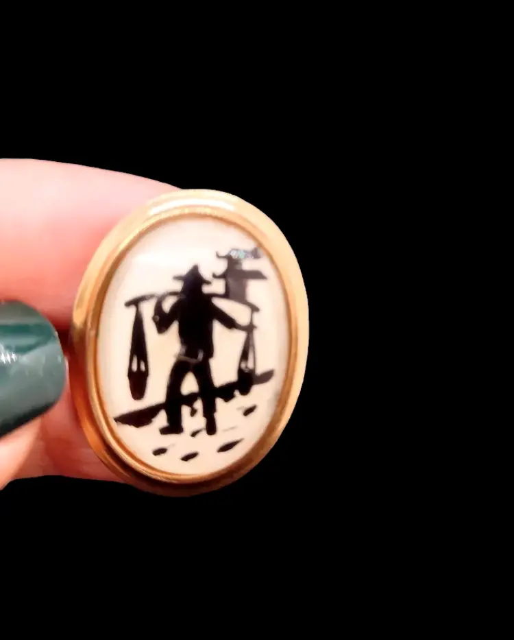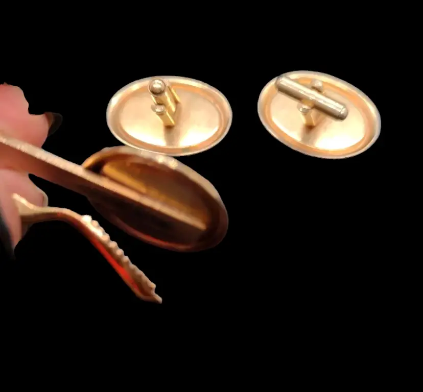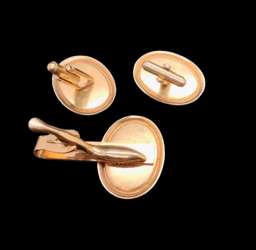 These are very nice well done cuff links & a tie with an Intaglio scene under glass. In the last picture you can see the shiny part around the silhouette, but this was very hard to capture great in the pictures. Cuff links measure 1.25" long x 1" wide. Tie clip measures 2.75" long x 1.25" wide.