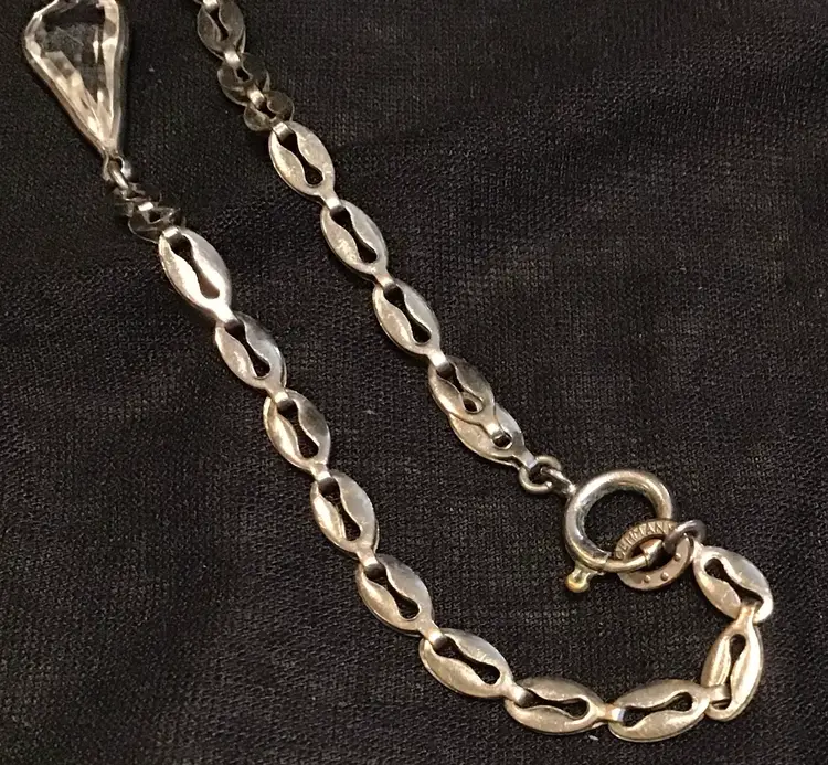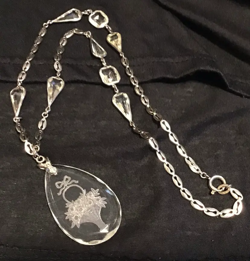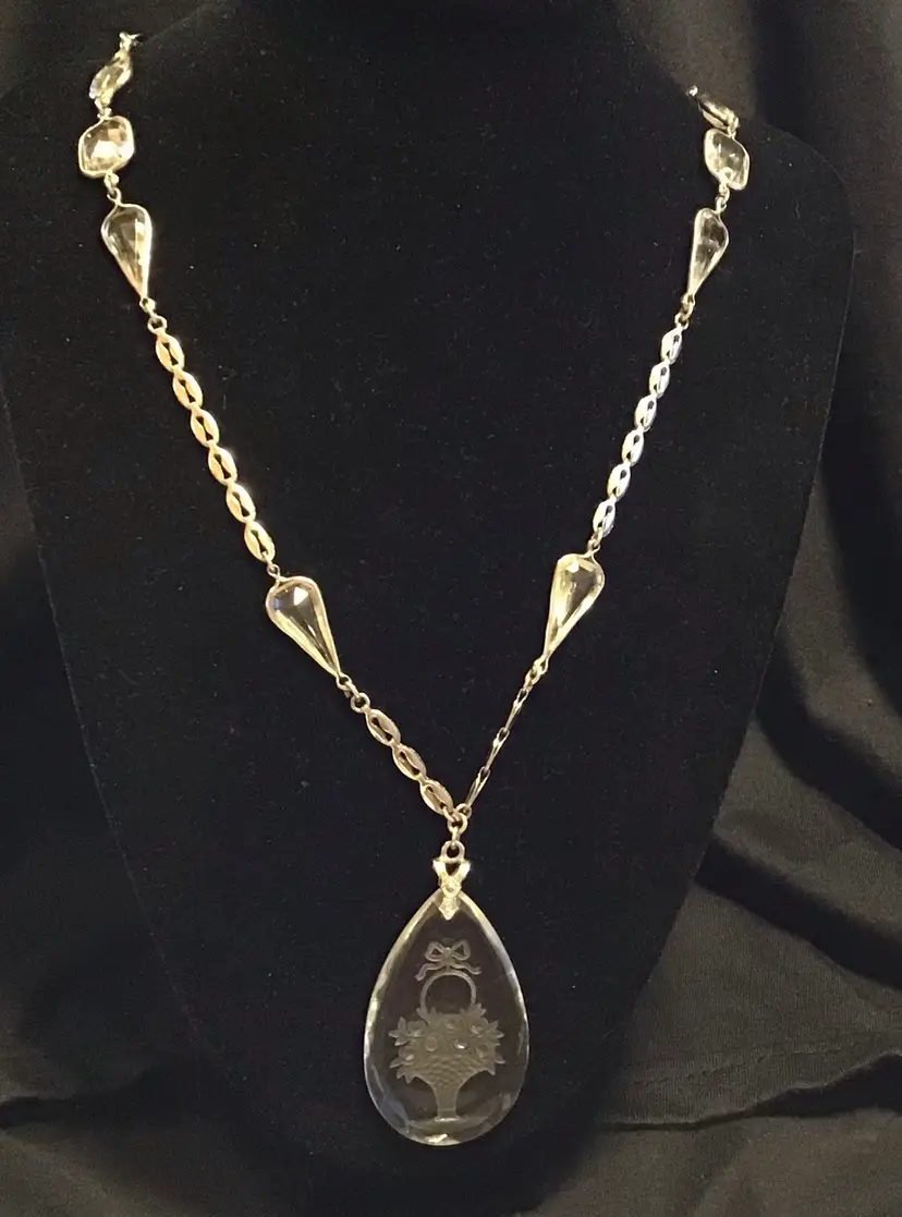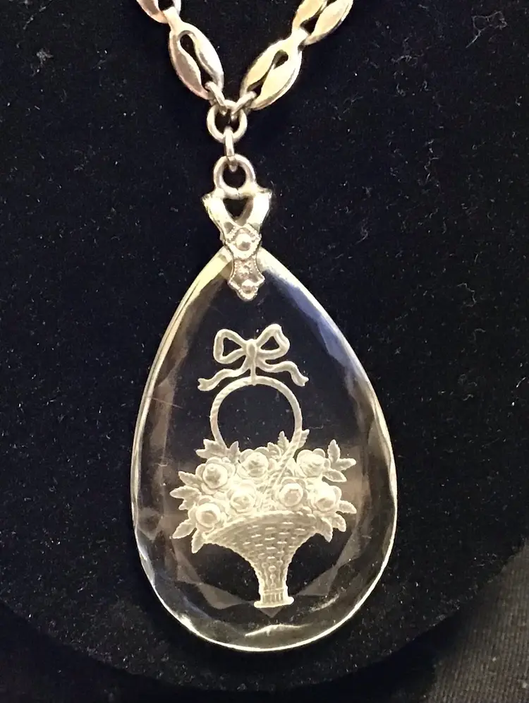 Flower basket reverse carved (intaglio) on 2” glass pendant, silver tone oval chain link with faceted glass stations, marked ‘Germany’ 22” early 1940s. Pendant has a very small scratch as seen in photos. # 244