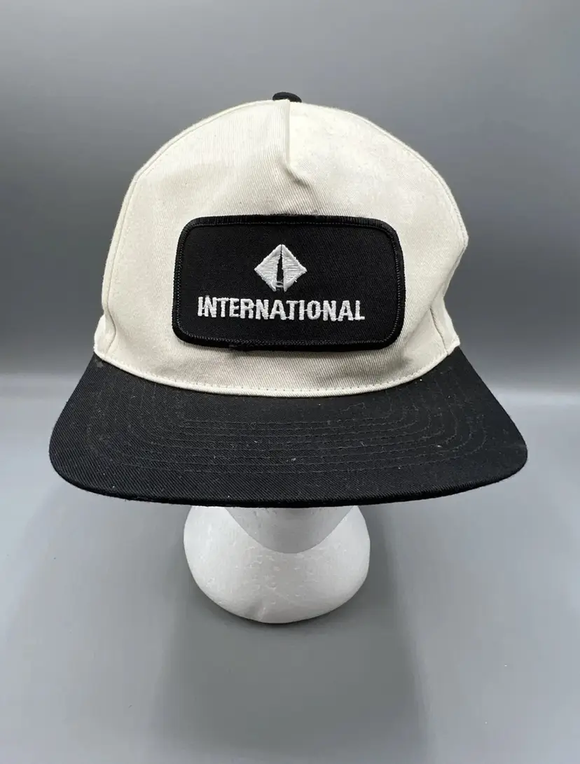 This is RARE Vintage International Navistar Patch Black & White SnapBack Trucker Hat by San Sun. It is in excellent clean condition as seen in the accompanying photos.