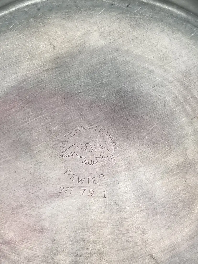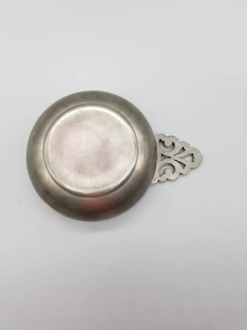 Vintage International Pewter Porringer Nappy is 6 3/4" wide including handle x 1 3/4" tall. This bowl has lots of character as seen in the few bumps, dents and signs of wear. In good vintage condition.