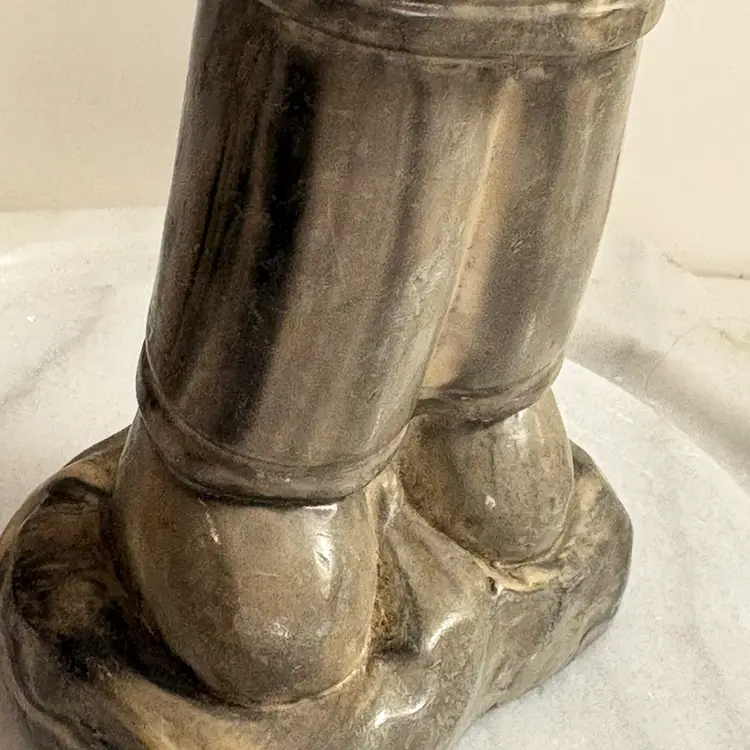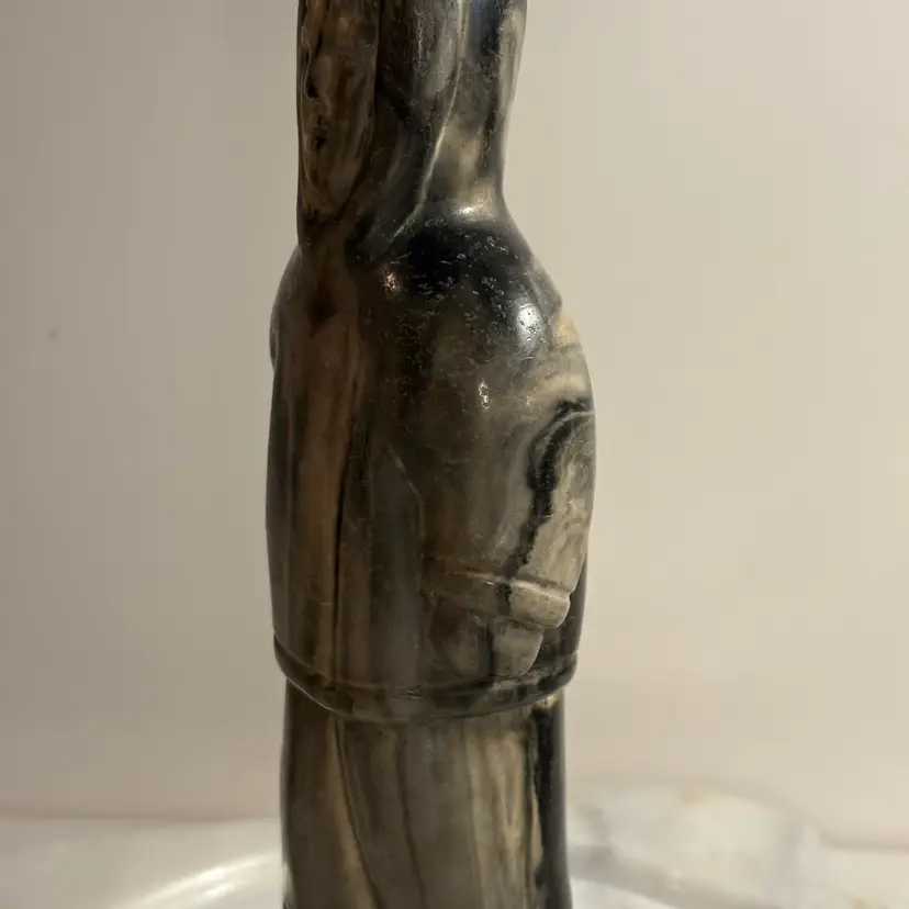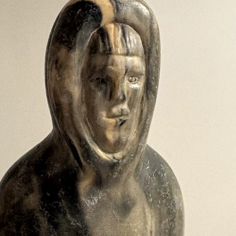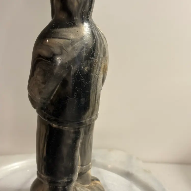 This vintage Inuit soapstone hunter figure is a 7 3/4" carving that is likely crafted by Thorn in Canada. The piece captures the essence of Canadian Inuit culture and tradition, making it a unique and valuable collectible item for those interested in Inuit art and history. The intricate details and craftsmanship of this carving reflect the rich cultural heritage of the Inuit people and their connection to the natural world