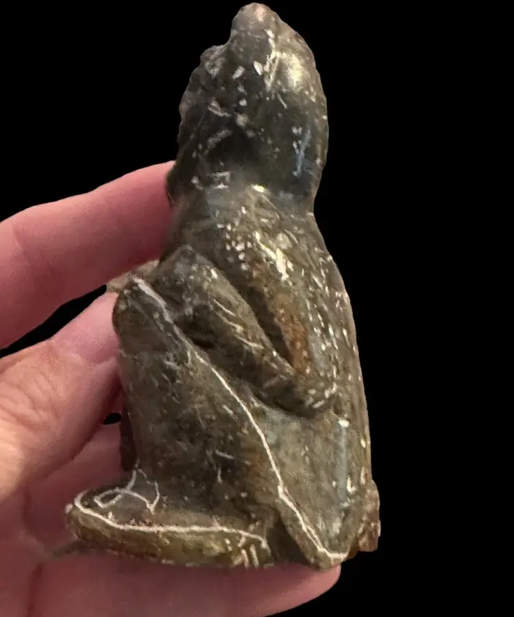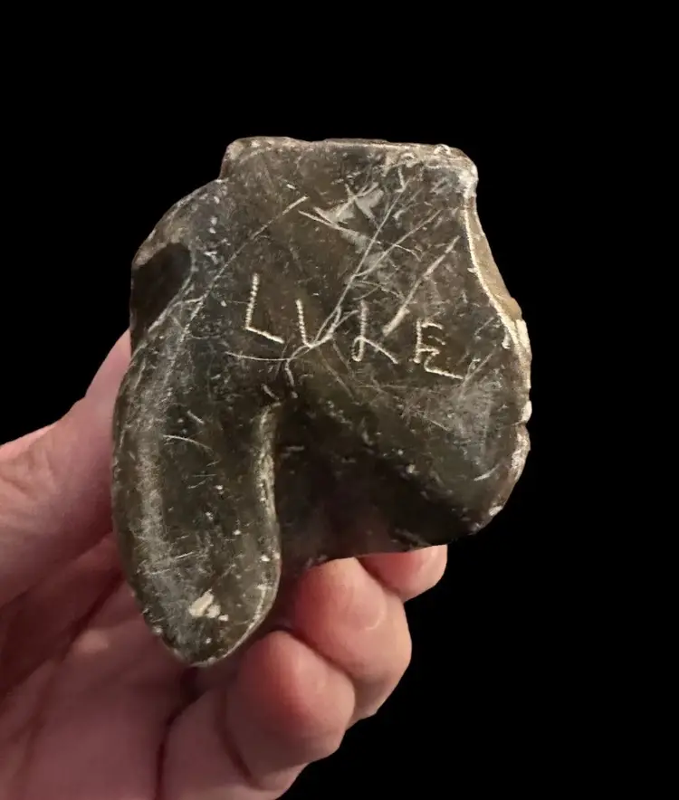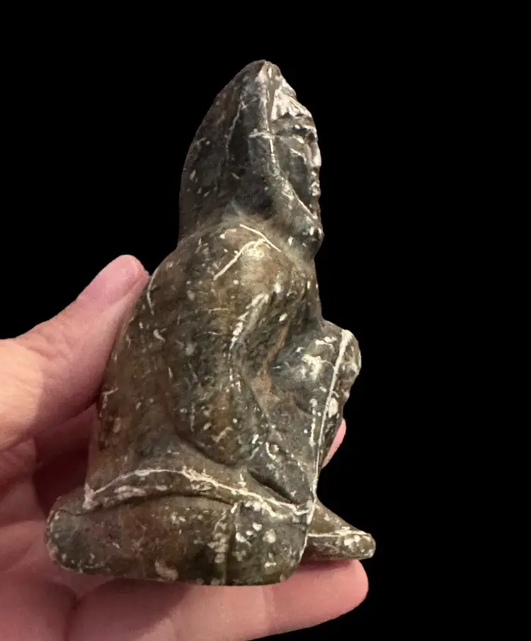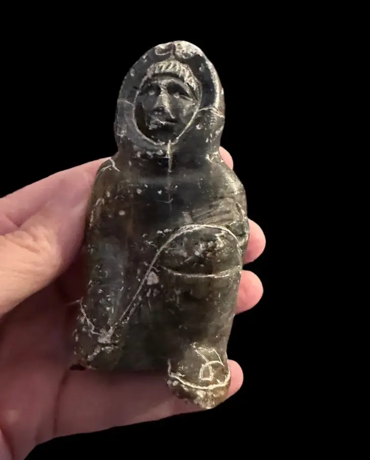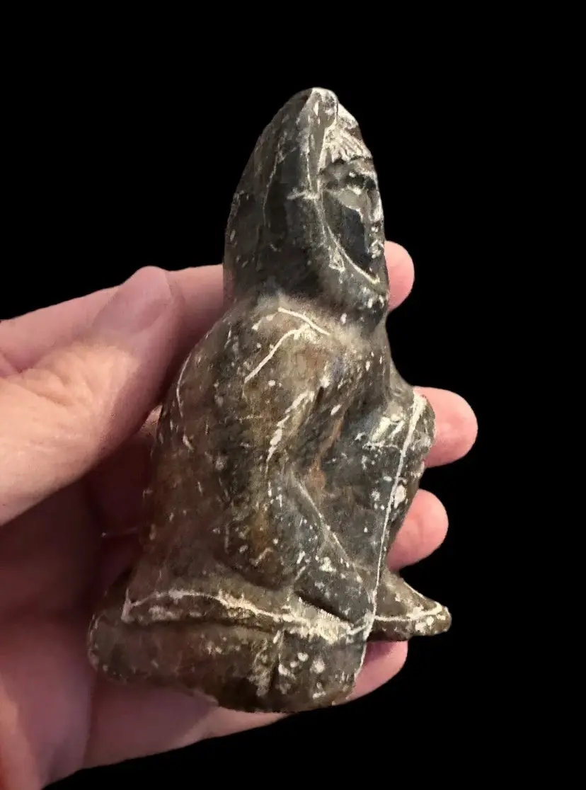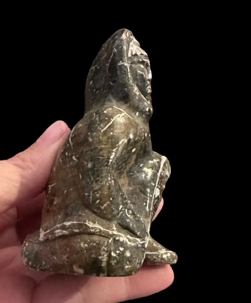 This is a terrific Vintage Inuit Soap Stone Carving, Signed Luke, William Luke. This stone sculpture of a kneeling man was done with terrific, intricate details. From the drape of his parka, his winter hat and the detail on his boot, the attention to detail is remarkable. Piece is signed “Luke” on the bottom.