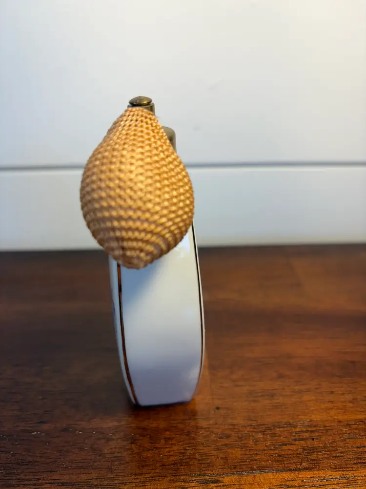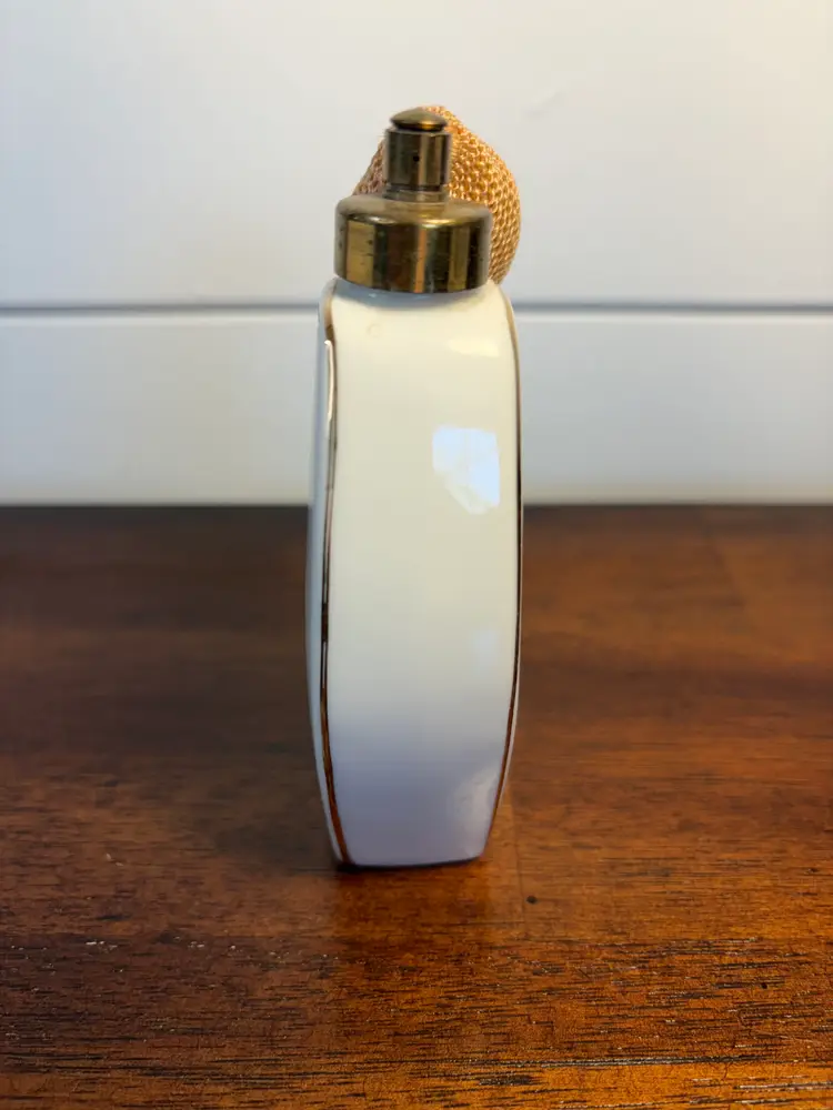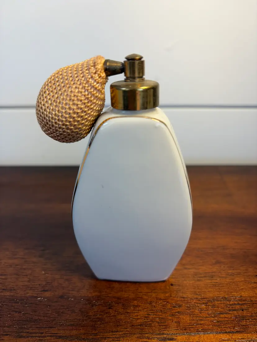 Charming vintage perfume atomizer with delicate floral design. Stands 5 inches tall. Perfect for adding a touch of elegance to your vanity. The bulb is hardened. It stands 4 inches tall and 2 inches wide. There are no chips or cracks.