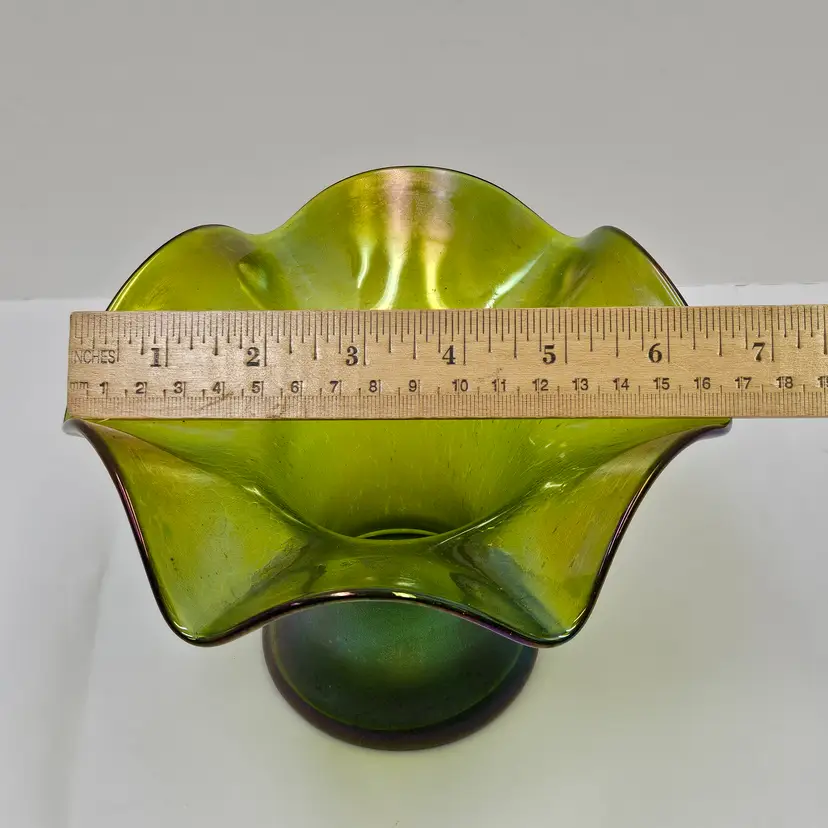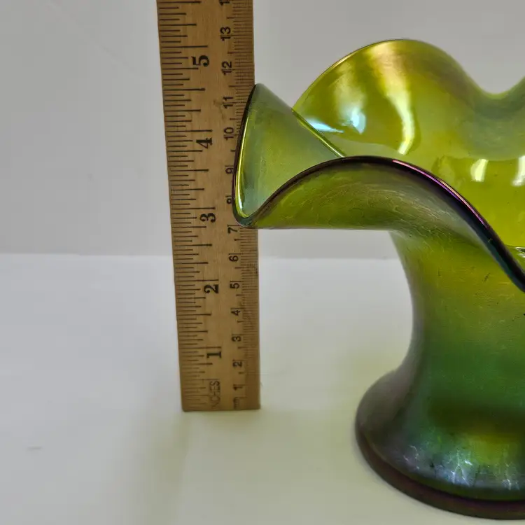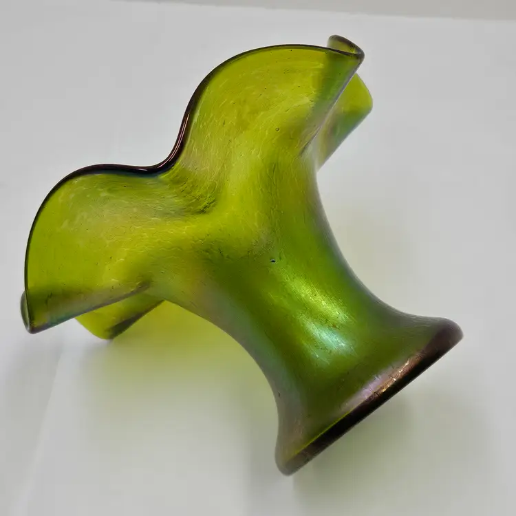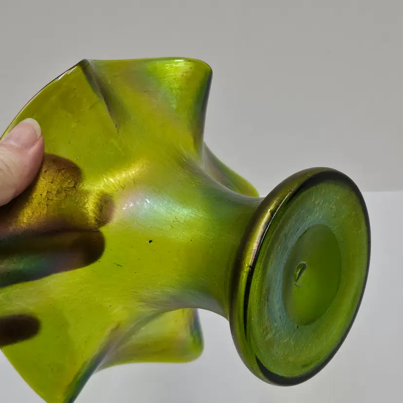 Lovely hand blown iridescent green glass vase, Bohemian Style, possibly Kralik/Rindskopf/Poschinger?, 4.5"x6.75", NO damage.