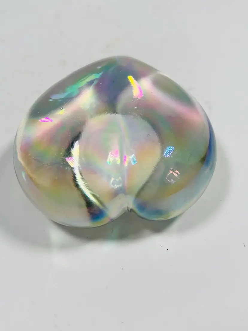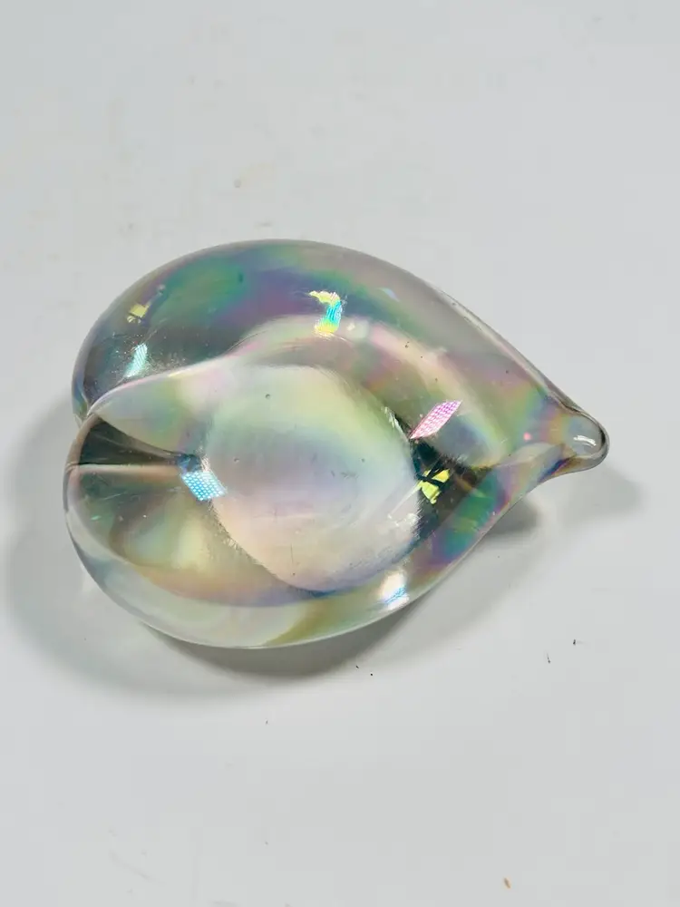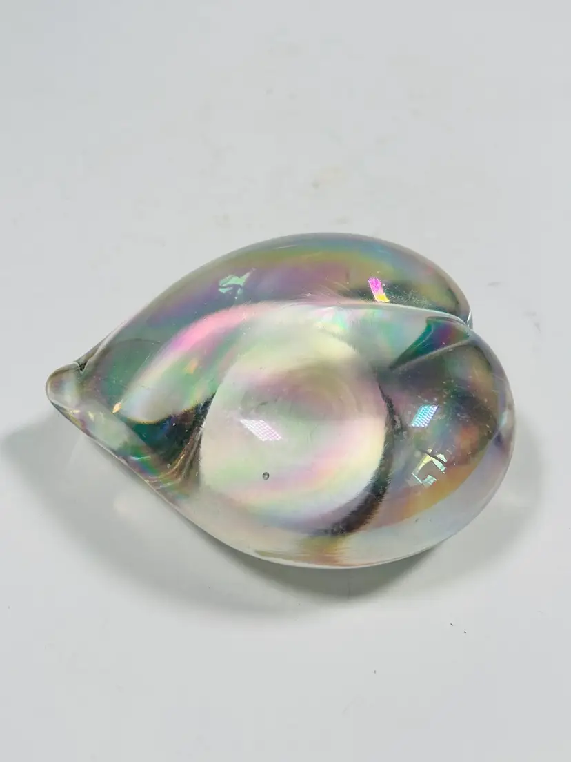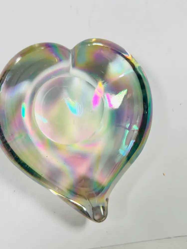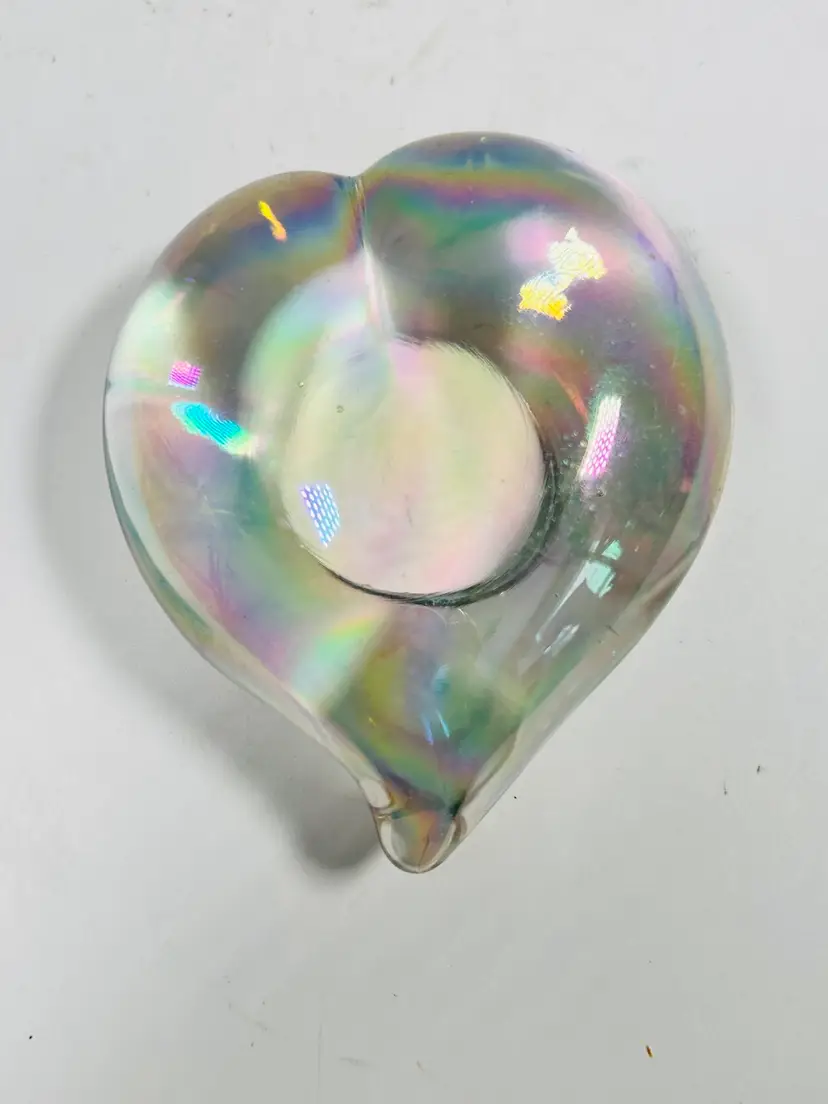 Add a touch of elegance to your desk or bookshelf with this stunning heart-shaped paperweight. Crafted from high-quality, hand-blown glass, this piece features a beautiful iridescent finish that catches the light beautifully. The clear color and heart pattern make it a timeless addition to any collection.