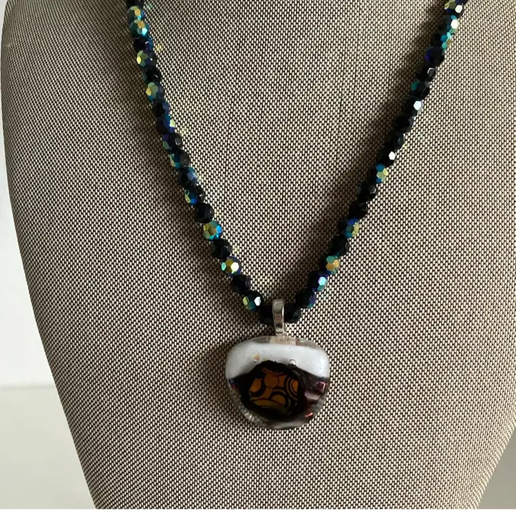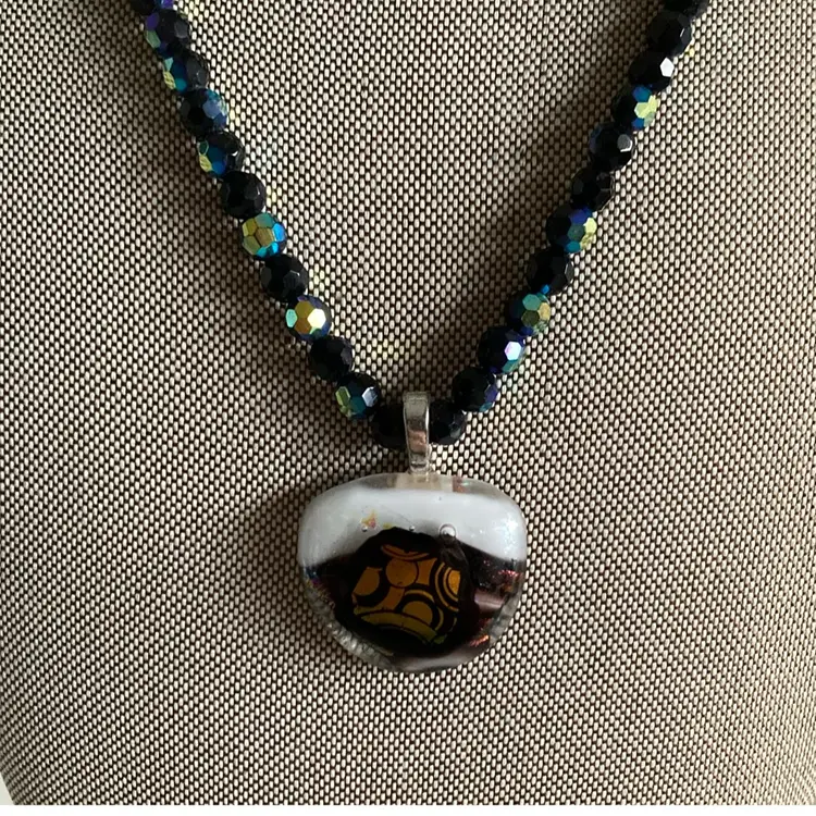 Vintage iridescent faceted bead neckalce with fuzed glass pendant. This is an upcycle designed with vintage beads and findings. The necklace measures 19” long and has a barrel closure.