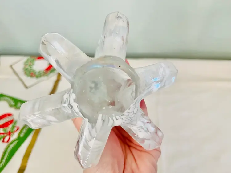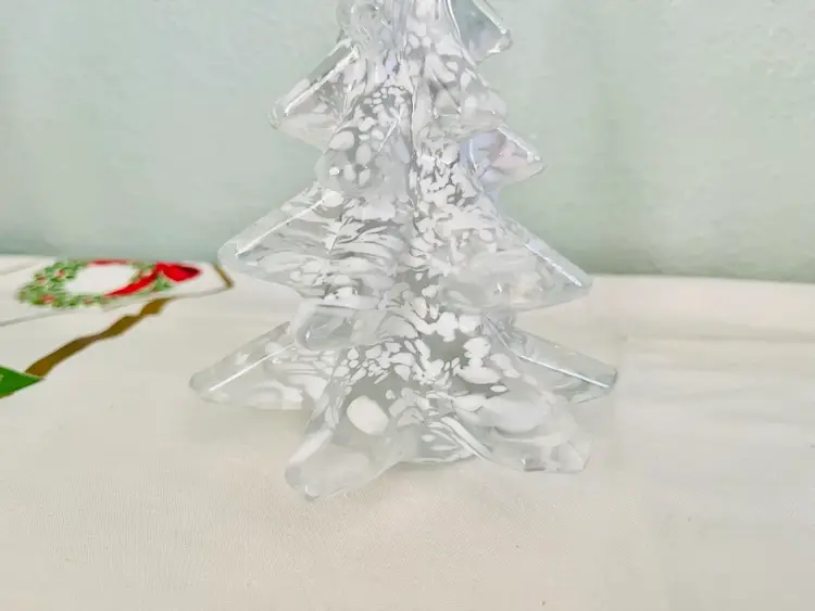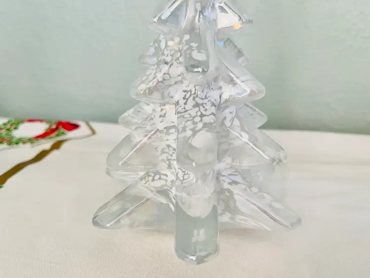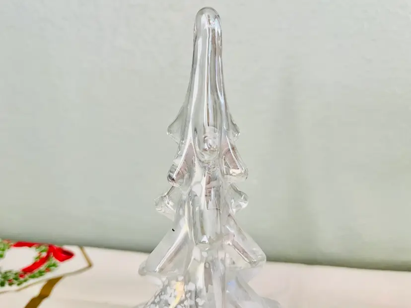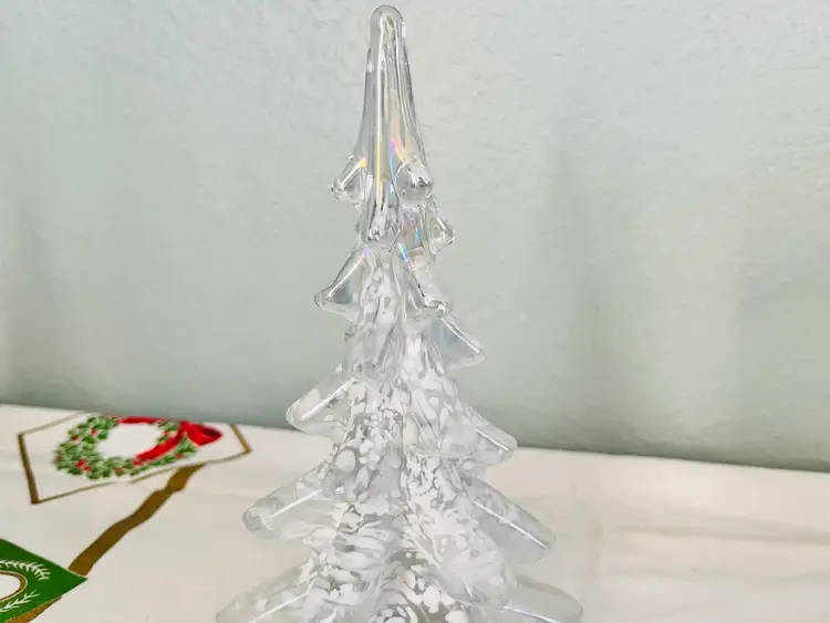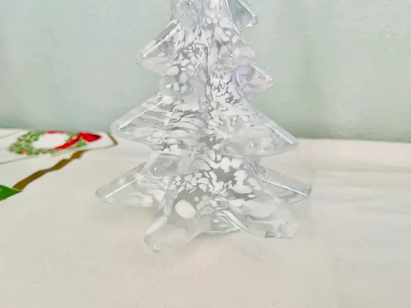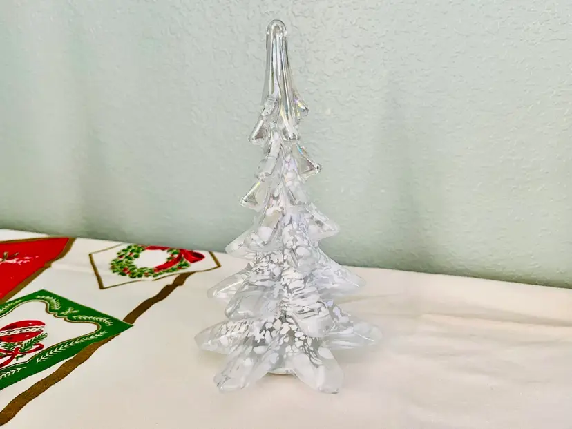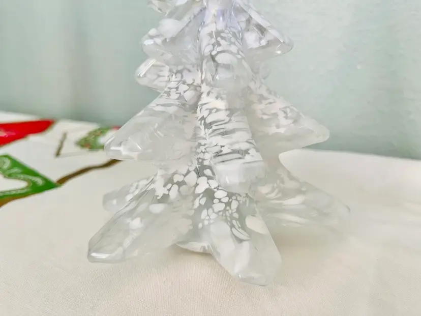 Gorgeous glass Christmas tree! It has a beautiful iridescence, and I love the swirly snow effect! In great condition, with no chips or cracks. Measures approx 7.5” tall.
