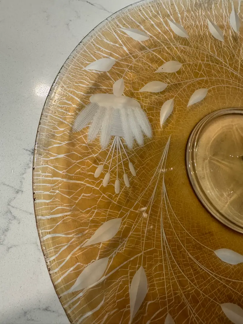 A beautiful piece perfect for entertaining. This elegant tray features intricate etchings and a convenient center handle, making it ideal for serving appetizers, desserts, or small treats. The design complements any decor, adding a touch of vintage charm to your table setting. Excellent pre-owned condition.