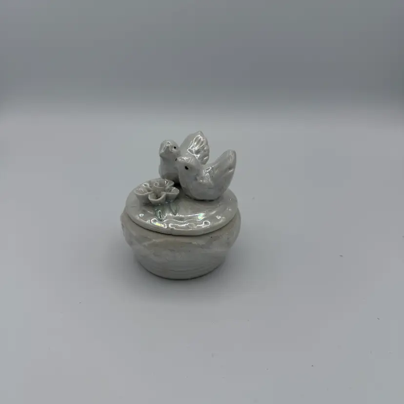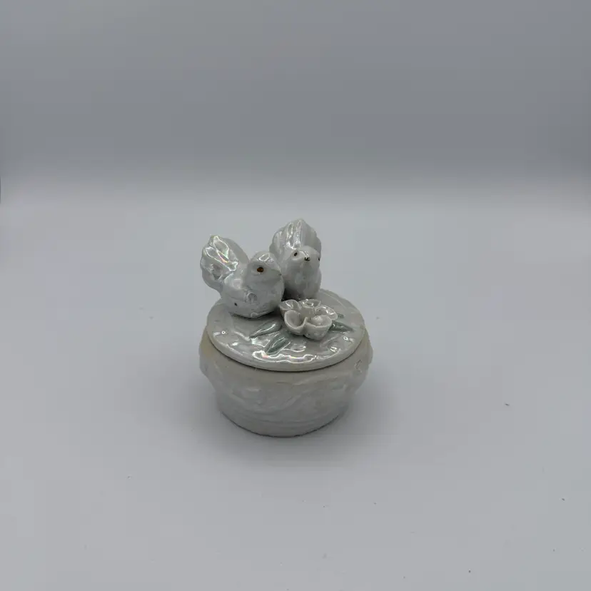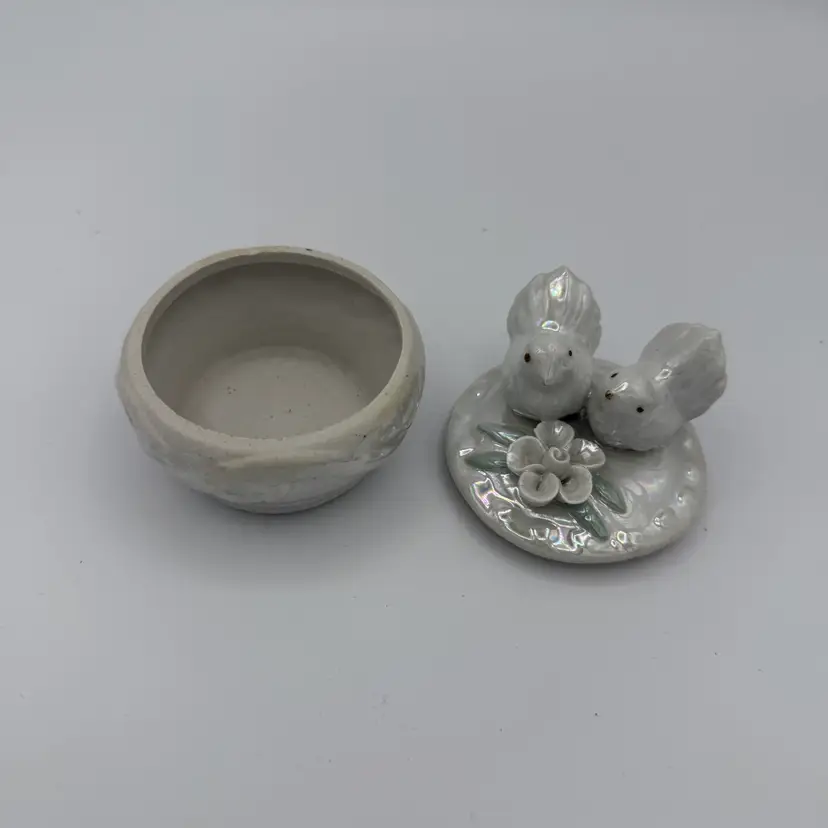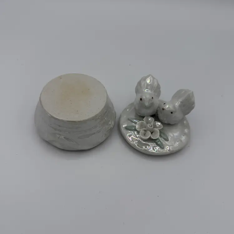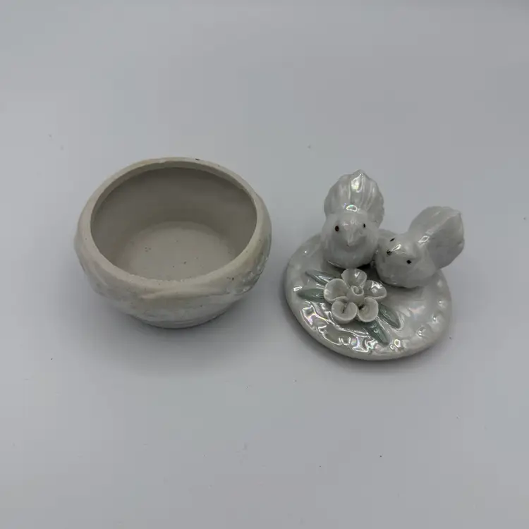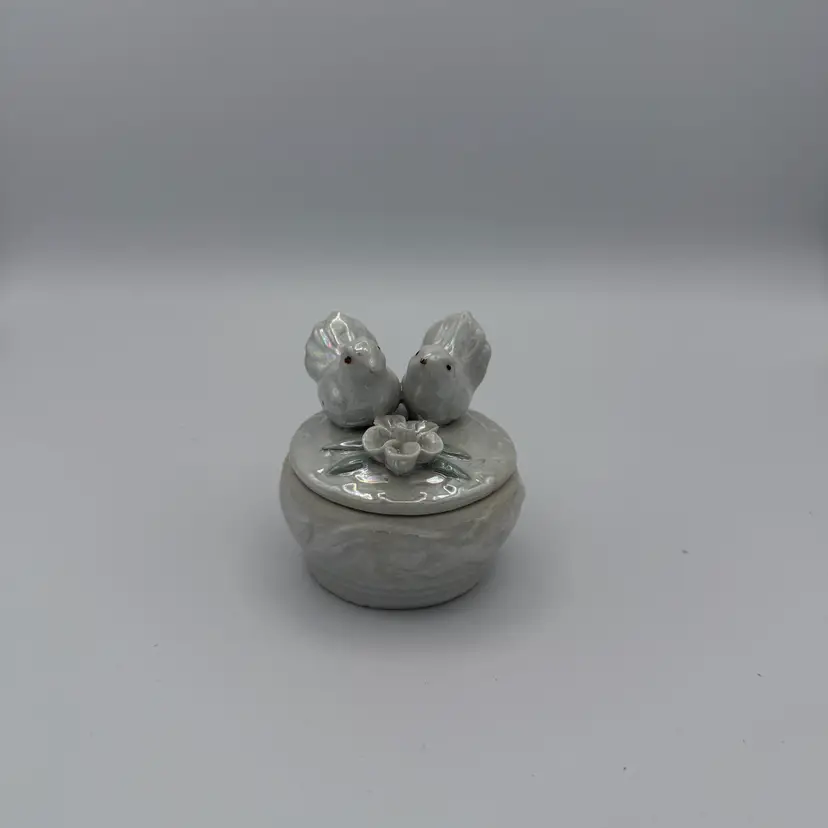 Vintage Iridescent Glaze Love Birds Trinket Box. Featuring Two Love Birds and a Floral Design on Lid. No Chips/Cracks.