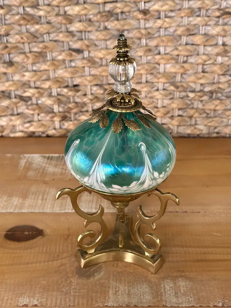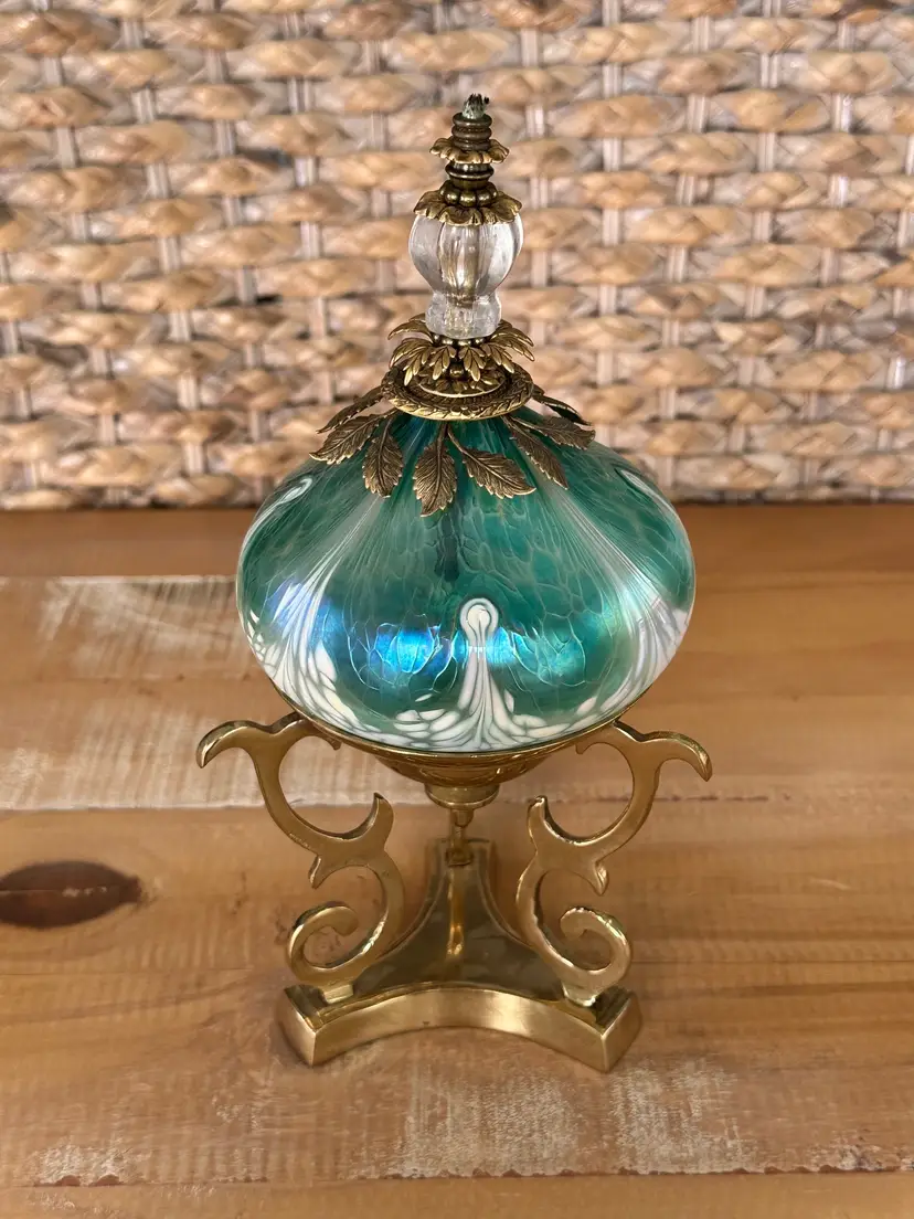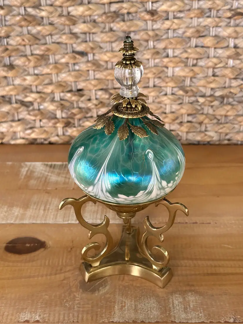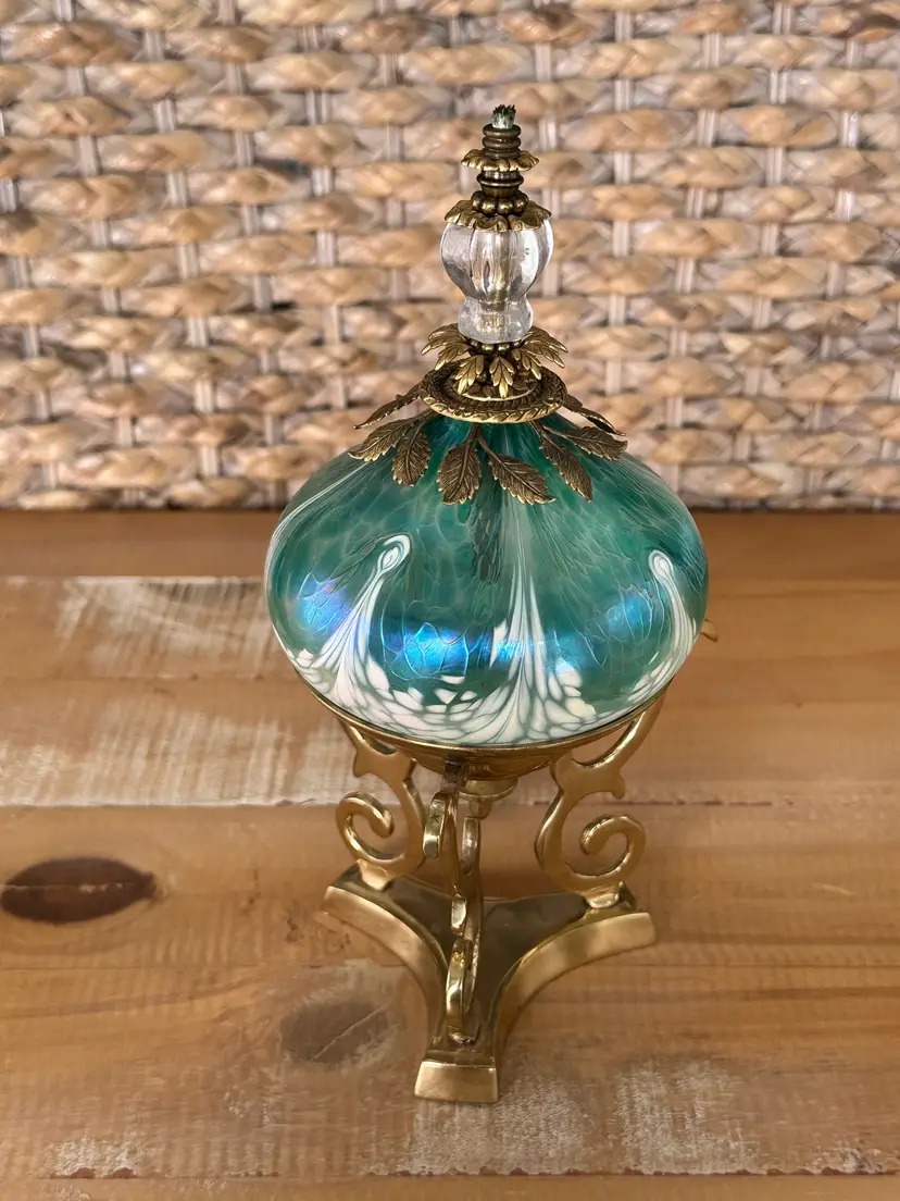 The product is a vintage iridescent possibly Mt. St. Helen's ash glass blown glass oil lamp with a stand. It is a unique and collectible item that features a multicolor iridescent finish, adding a touch of vintage charm to any room. The oil lamp is made from glass and blown by hand, making it a rare and special addition to any collection of lamps or lighting fixtures. Stunning piece for any home. W: 4.5” H: 9”
