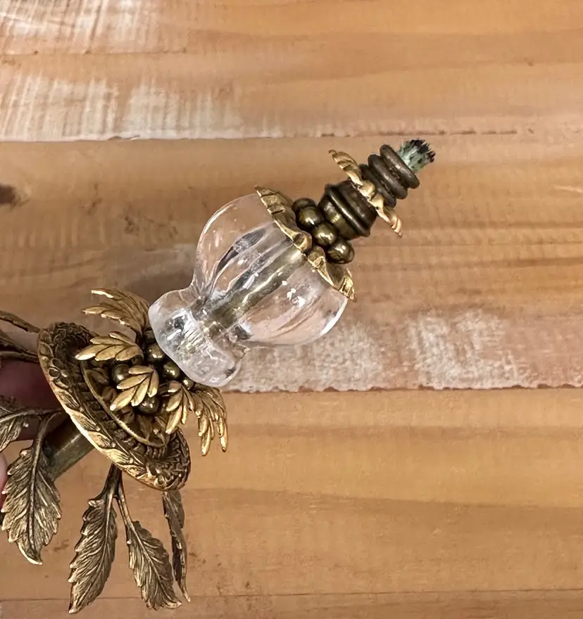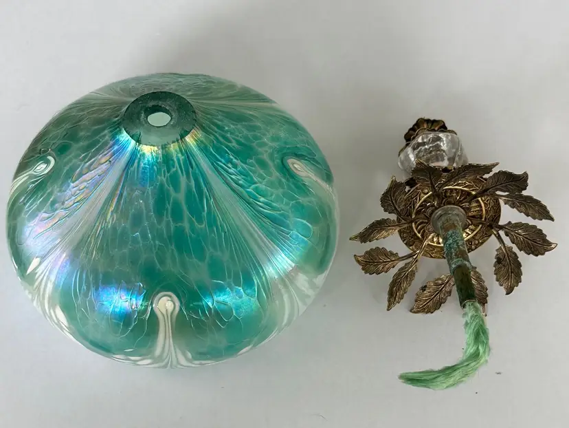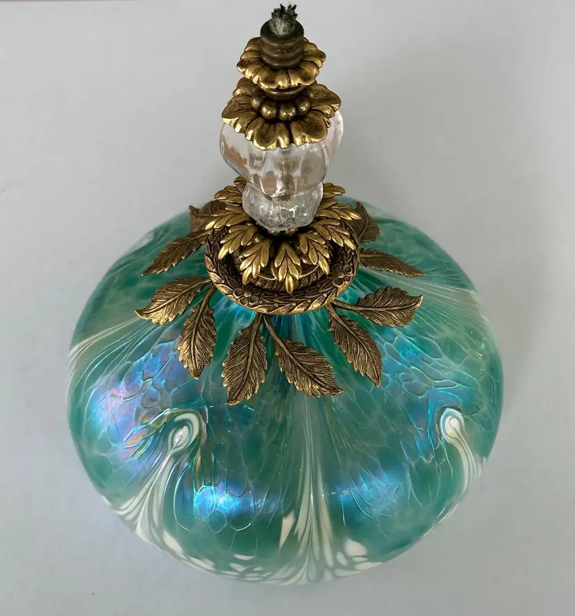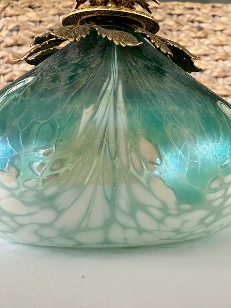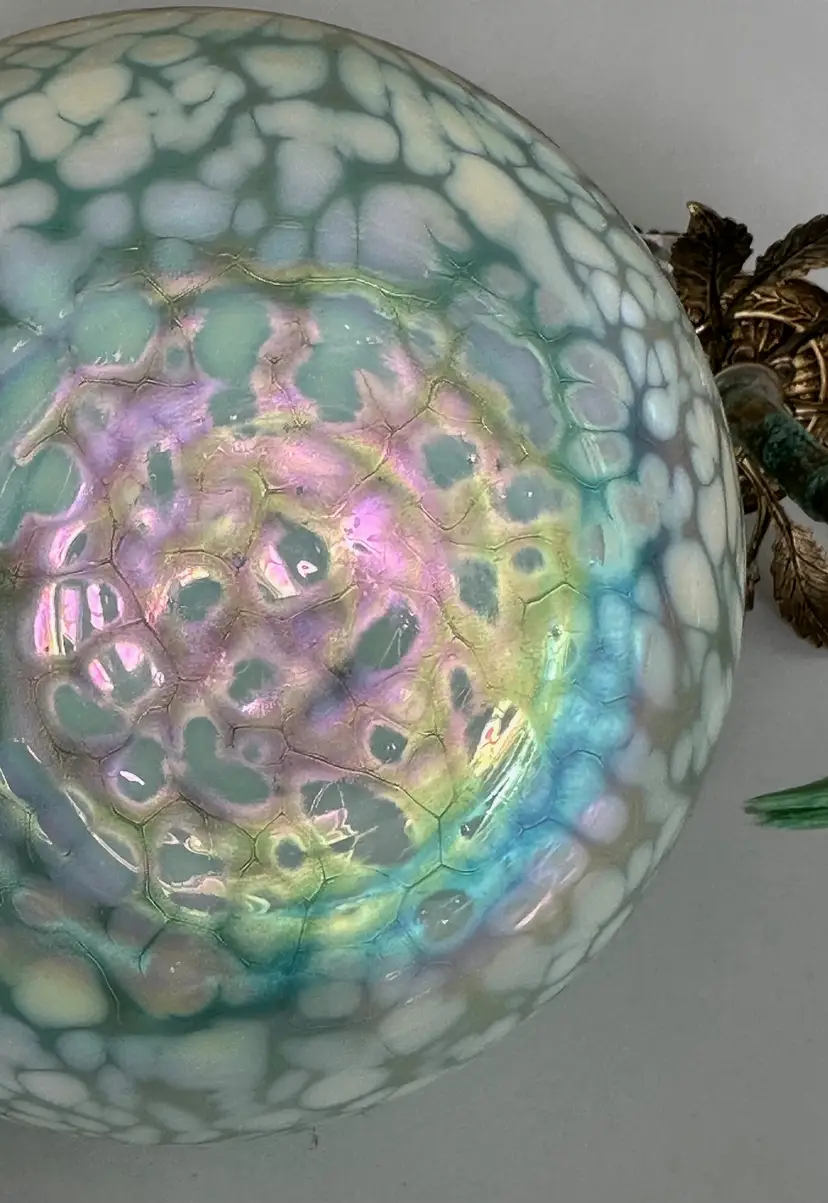 The product is a vintage iridescent possibly Mt. St. Helen's ash glass blown glass oil lamp with a stand. It is a unique and collectible item that features a multicolor iridescent finish, adding a touch of vintage charm to any room. The oil lamp is made from glass and blown by hand, making it a rare and special addition to any collection of lamps or lighting fixtures. Stunning piece for any home. W: 4.5” H: 9”