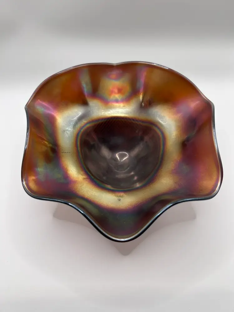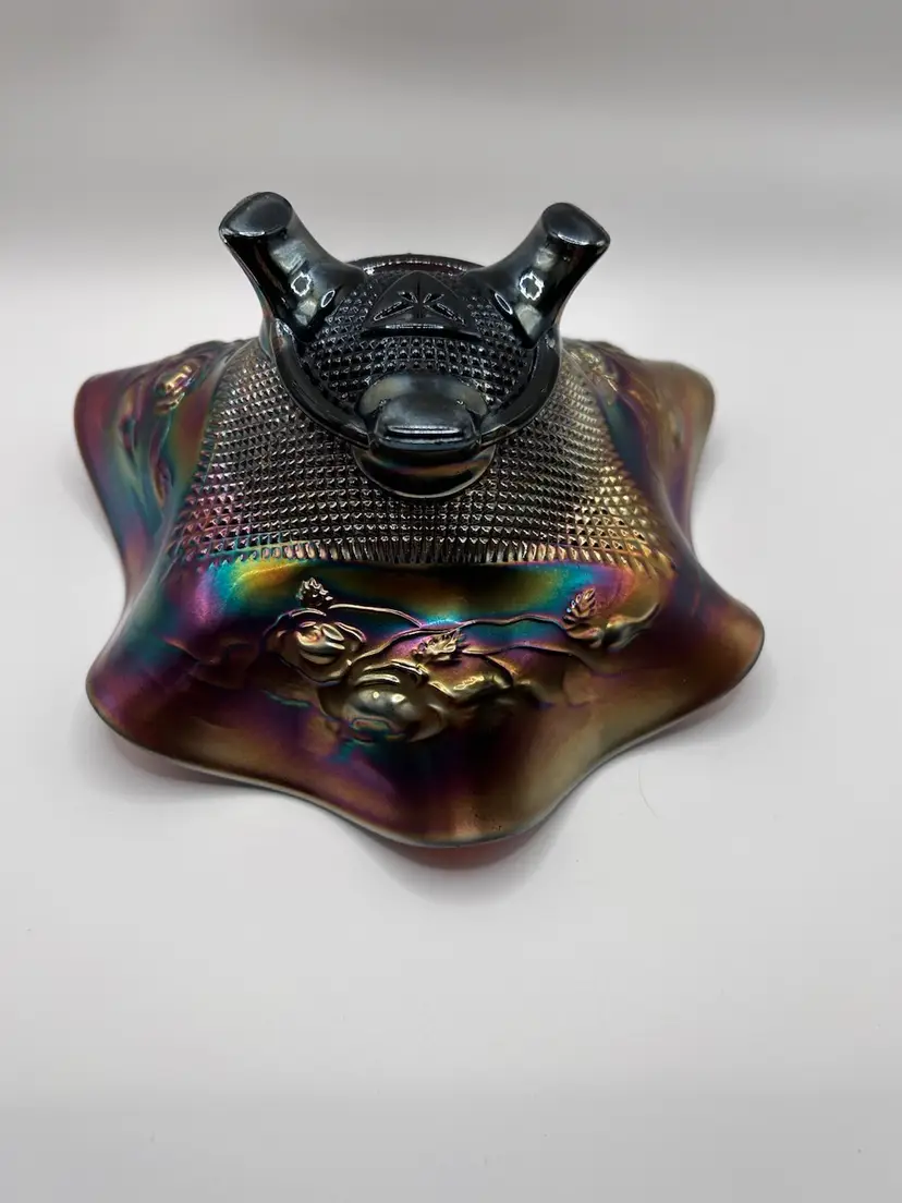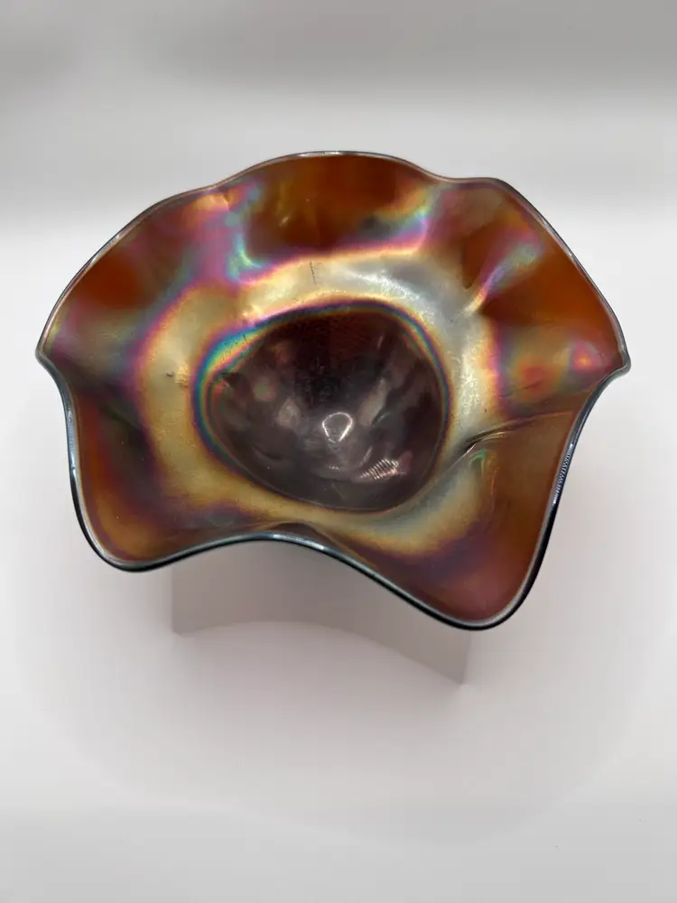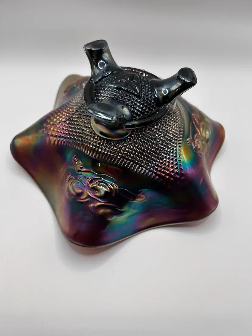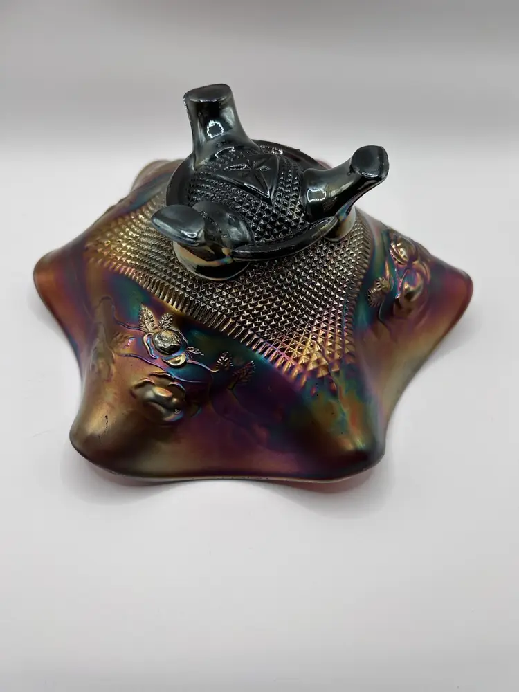 Beautiful vintage iridescent carnival glass footed bowl in very good used condition. Bowl has some minor signs of cosmetic wear but no major fall outs.