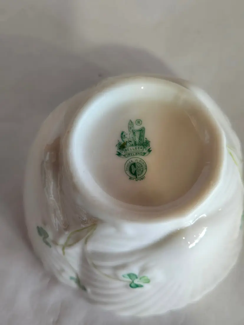 This vintage Irish Belleek creamer and sugar dish set features the iconic shamrock motif, symbolizing good fortune and heritage. Crafted with delicate porcelain, it offers a refined texture and subtle translucency typical of Belleek pottery. Perfect for collectors or those seeking to enhance their tea service, this set combines timeless elegance with traditional Irish craftsmanship. Its graceful design and detailed shamrock accents bring an authentic touch to any table setting.