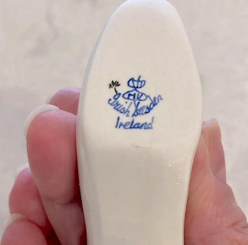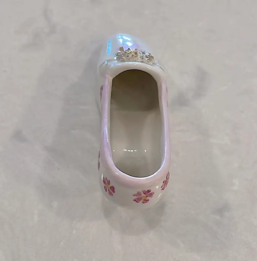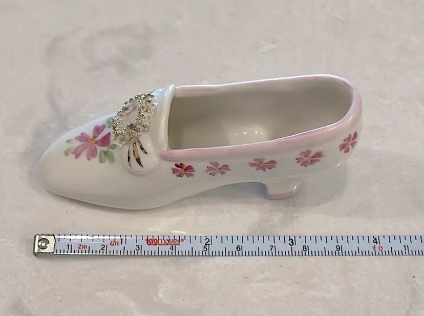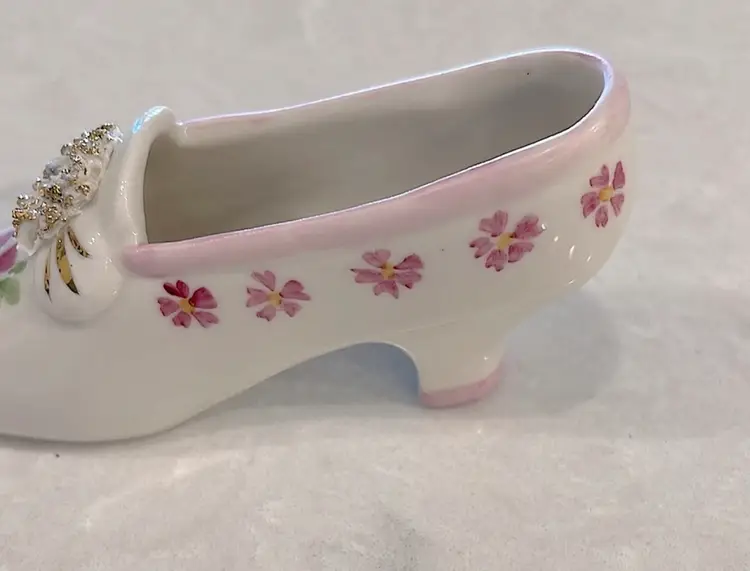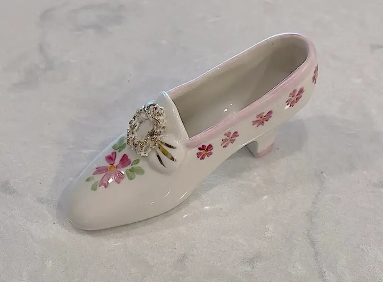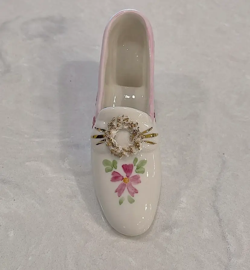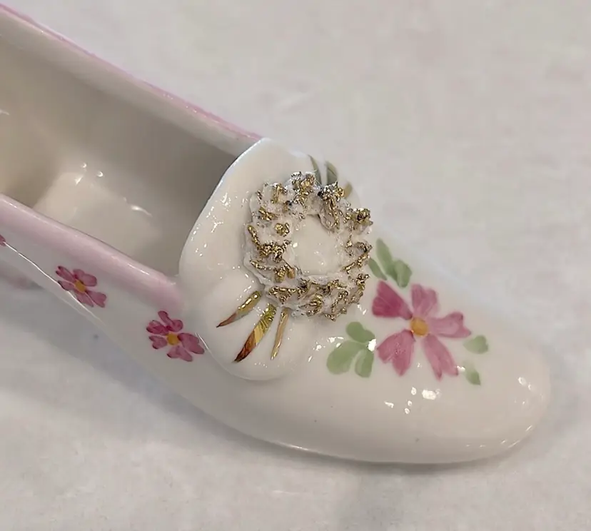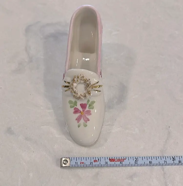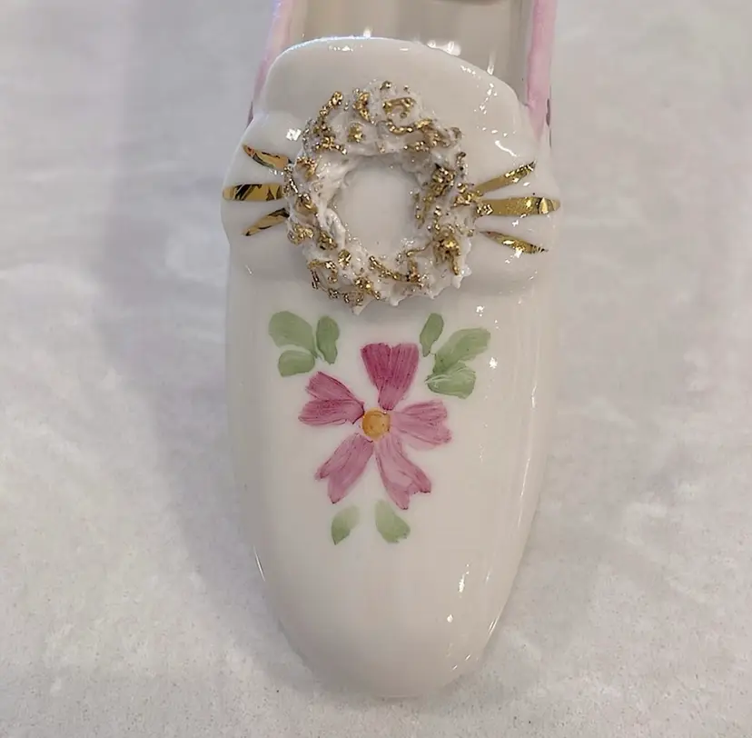Vintage, Irish Dresden, porcelain, “Pink Lady” shoe with Cinderella heel! “Spaghetti” detail on little wreath design! Please see pictures for measurements.