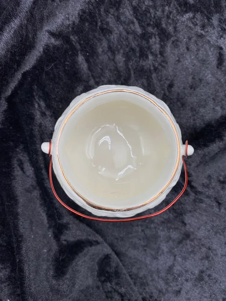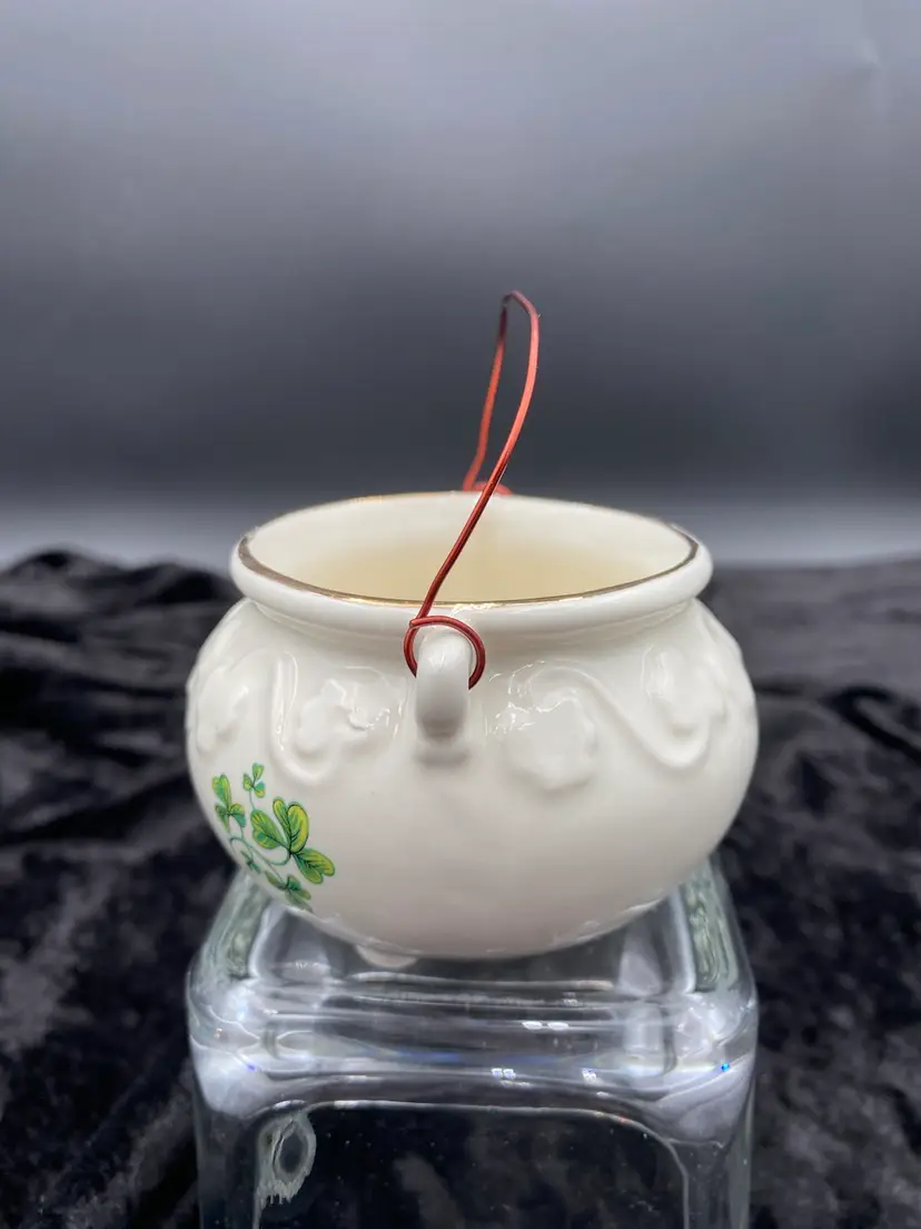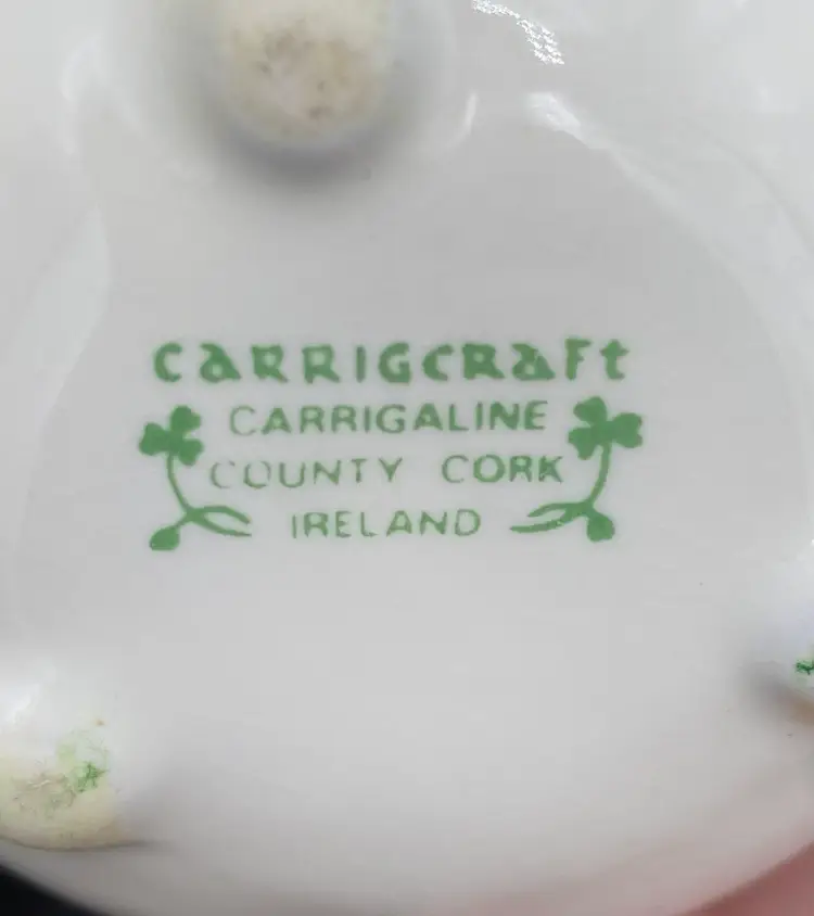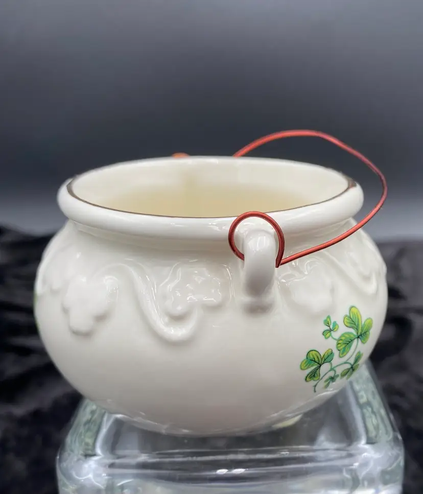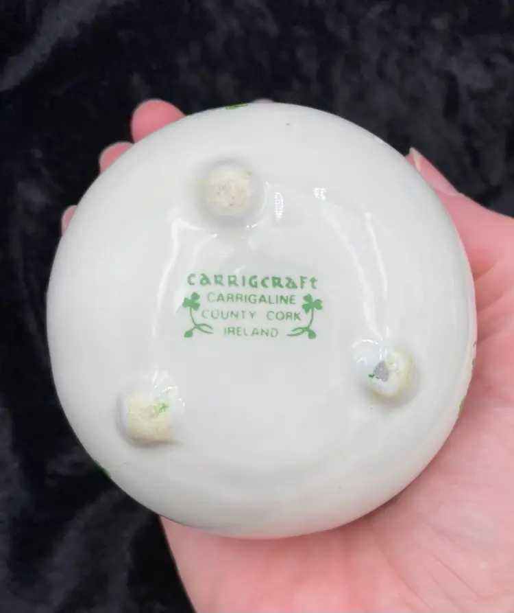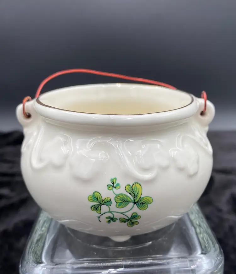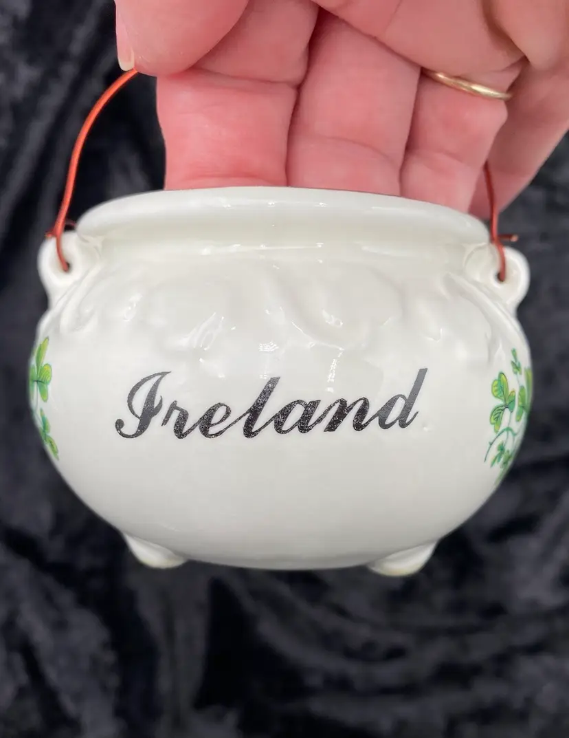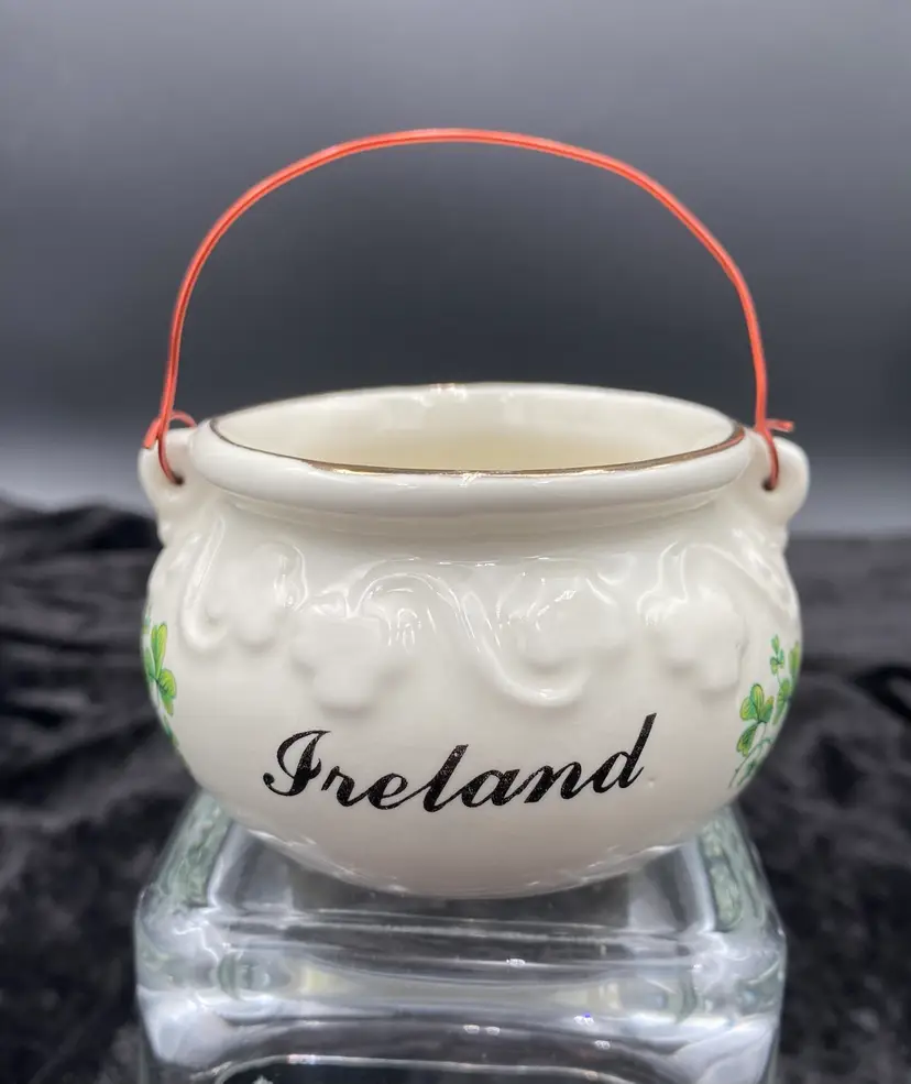 This cute little Irish 'Pot 'o Gold' features a beautiful shamrock pattern with a gold gilt finish with 'Ireland' printed on one side. It is a small, handmade piece of porcelain that measures 3.4 inches in length, 3.3 inches in width, and 2.25 inches in height (without the copper wire handle). The pot is marked and authentic, and it weighs 2.5 ounces. The shamrock design symbolizes the beauty of Ireland, and this pot is a perfect addition to any collection of decorative collectibles. It is suitable for all occasions and can be placed on any tabletop or shelf. The Carrigcraft brand from Carrigaline, County Cork, Ireland, is known for its high-quality, handmade pottery, and this piece is no exception. Add some Irish charm to your home with this original pot.