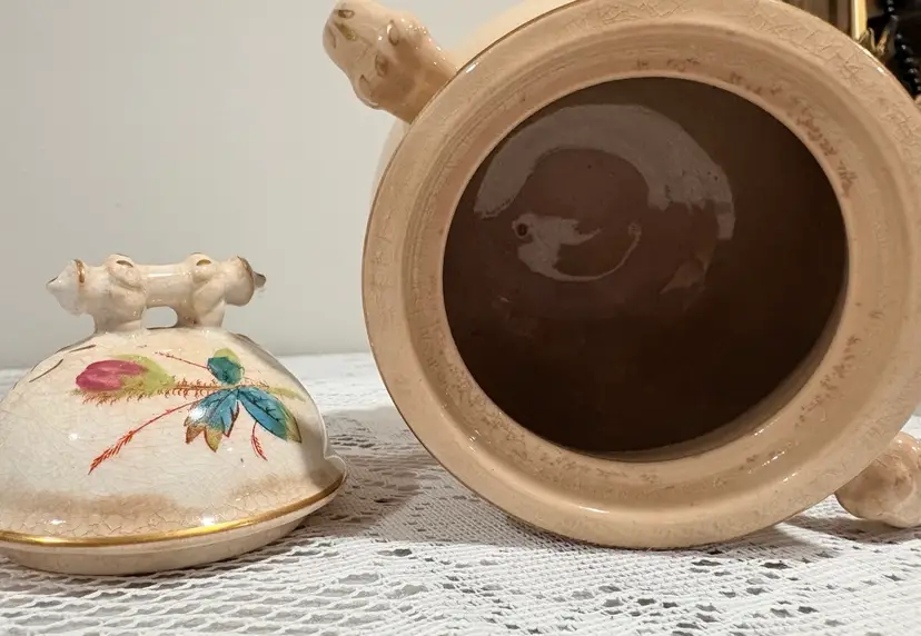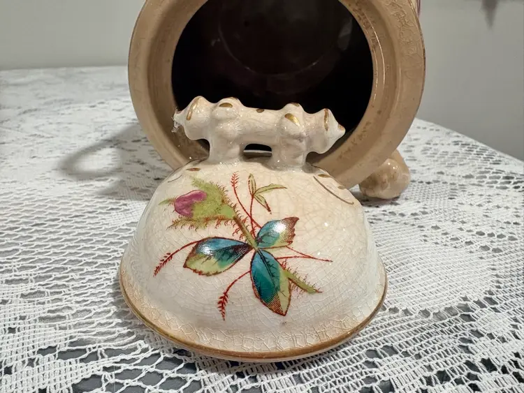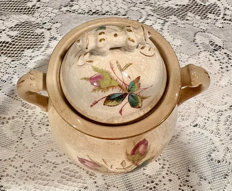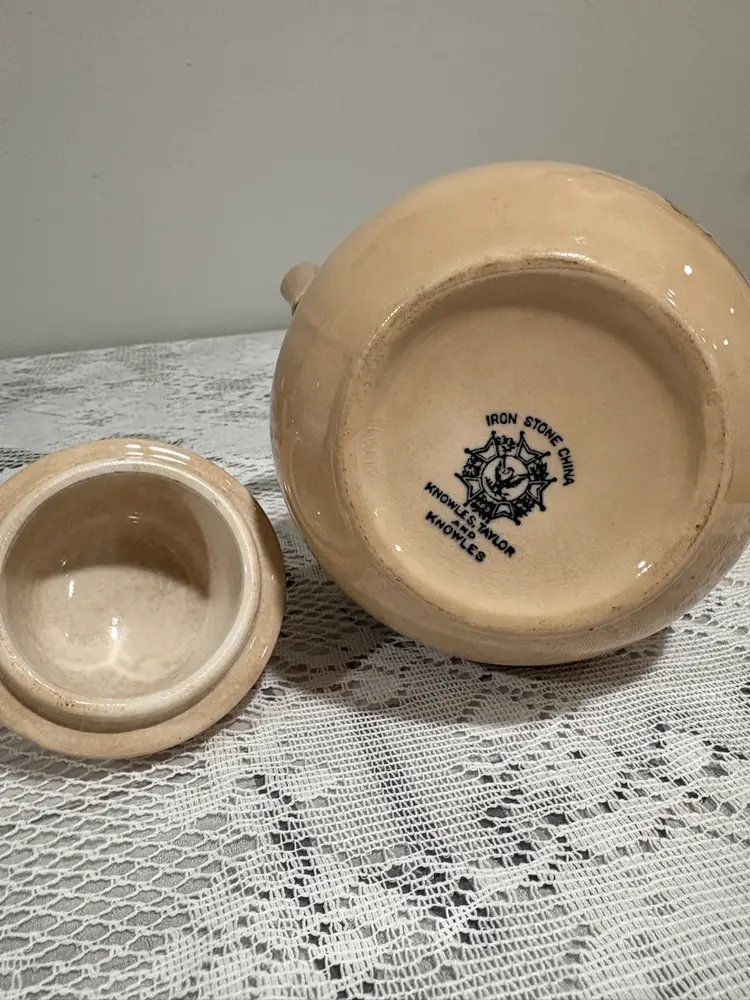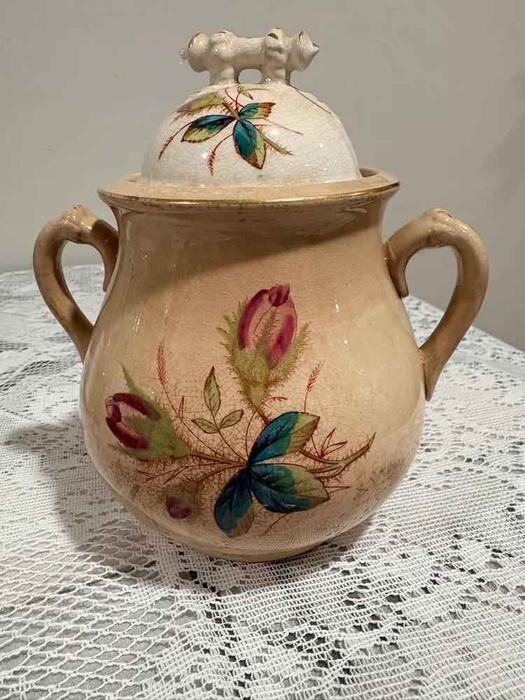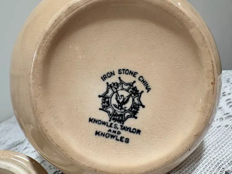 This vintage ironstone biscuit jar with a lid and handles by Knowles & Knowles English porcelain.