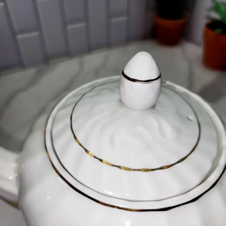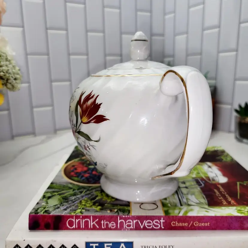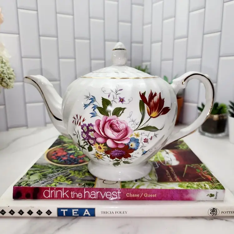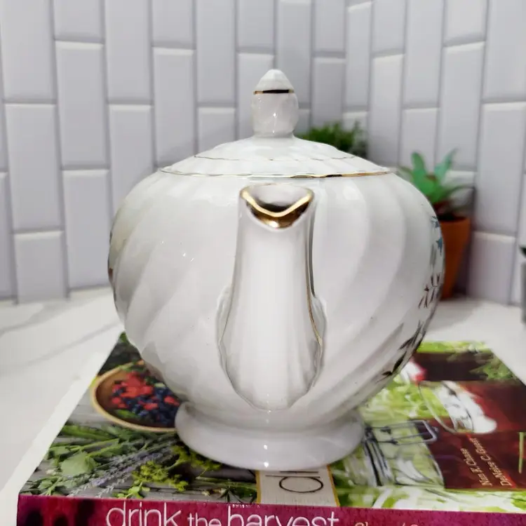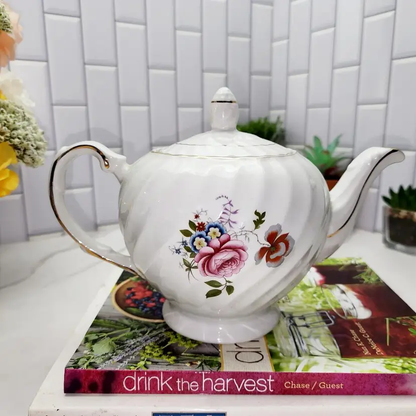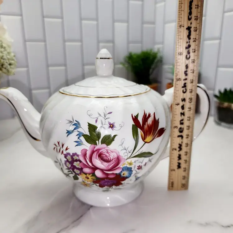 White ironstone 4 cup teapot with Floral Designs of Pinks, Yellows, Purples & Blues. Flowers include Roses & Pansies. Gold details. The body of the pot has scrolling and other embossed details the give it Life. Styling/Decore/Vibe: Elegant, Shabby Chic, Retro, & Vintage. Pattern: 727 (discontinued) Made by: Ellgreave a division of Woods & Sons England. Conditioned: Pre-owned, Good. Slight fading of the gold. No chips, cracks or crazing.