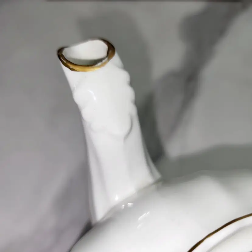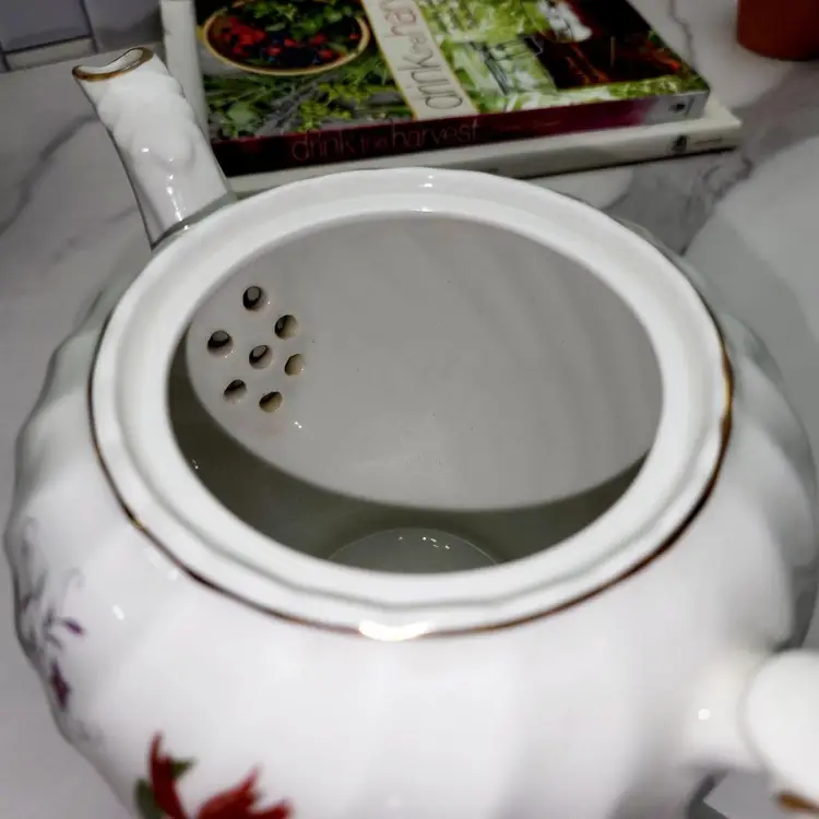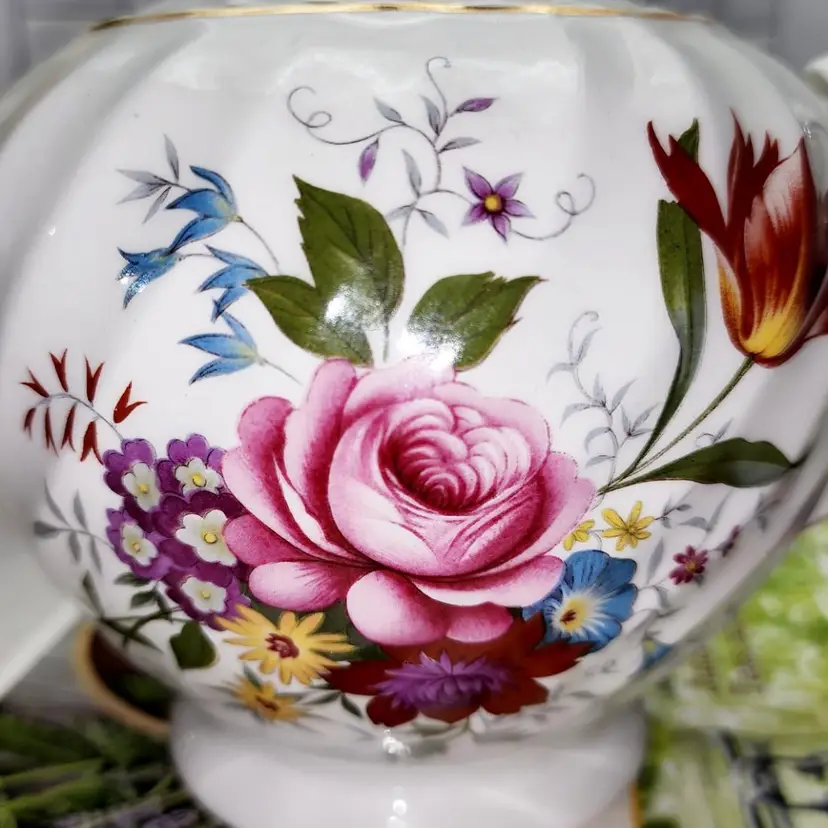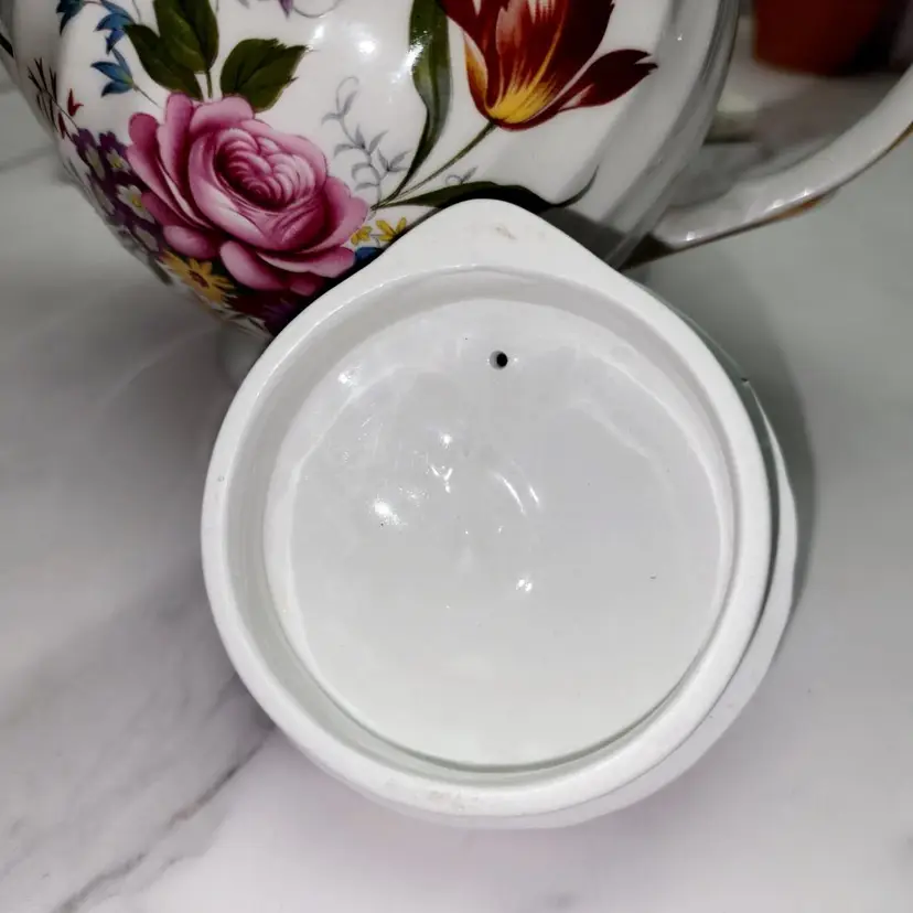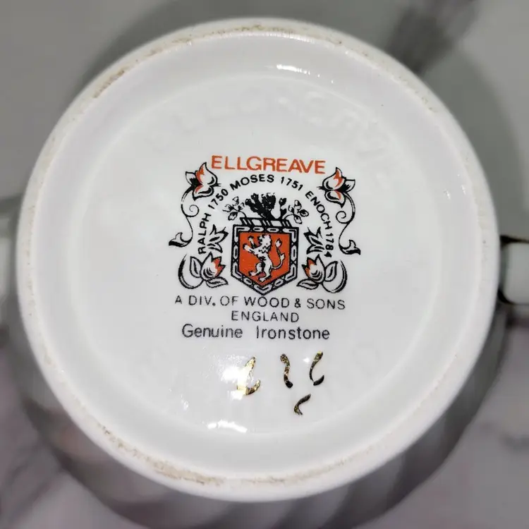 White ironstone 4 cup teapot with Floral Designs of Pinks, Yellows, Purples & Blues. Flowers include Roses & Pansies. Gold details. The body of the pot has scrolling and other embossed details the give it Life. Styling/Decore/Vibe: Elegant, Shabby Chic, Retro, & Vintage. Pattern: 727 (discontinued) Made by: Ellgreave a division of Woods & Sons England. Conditioned: Pre-owned, Good. Slight fading of the gold. No chips, cracks or crazing.