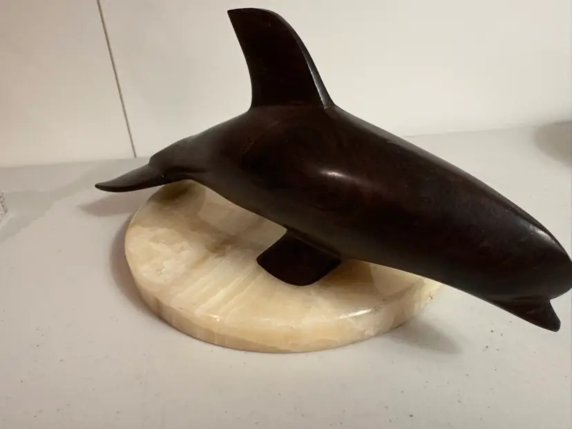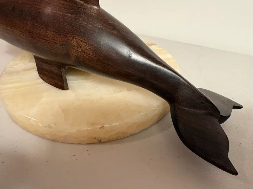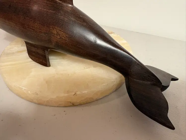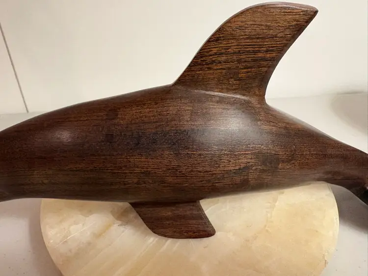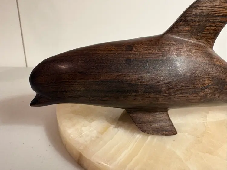 Carved dolphin circa 1970s sculpted from iron wood (an extremely dense wood, resembling rosewood in color and grain, challenging to carve with such detail). Elegant dolphin, which balances on the front fins, giving the rest of the body and tail an elevated / floating appearance. Nice texture and wood grain.