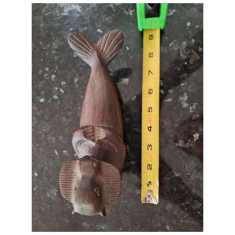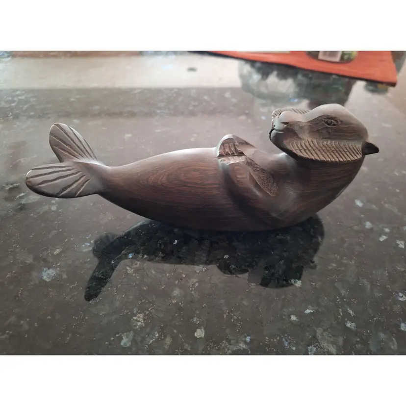 Handcarved dark Ironwood Sea Otter is signed/ marked on bottom. A Vintage item. Natural variations to the wood itself are present due to carving. No obivious cracks or chips however detailing on face, paws & flipper may be rougher in places but as this is hand made it I feel only adds to the character of the piece. This is solid and a nice weight. Please refer to all pictures for detailing and approx measurements.