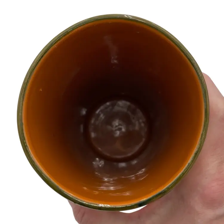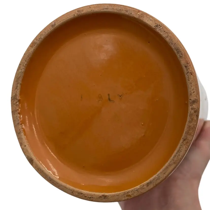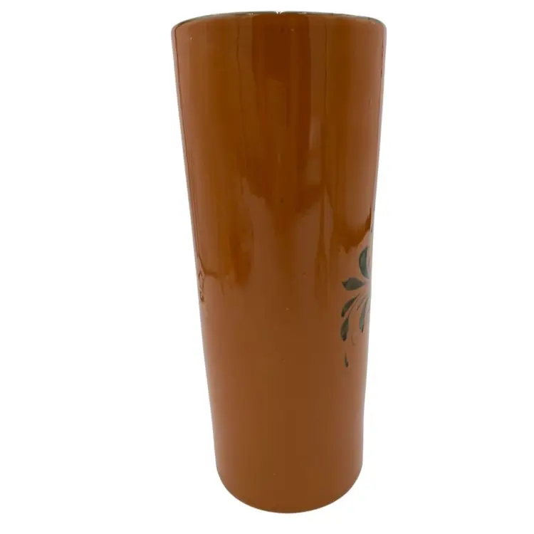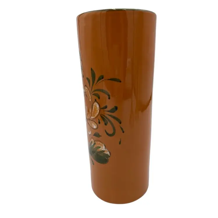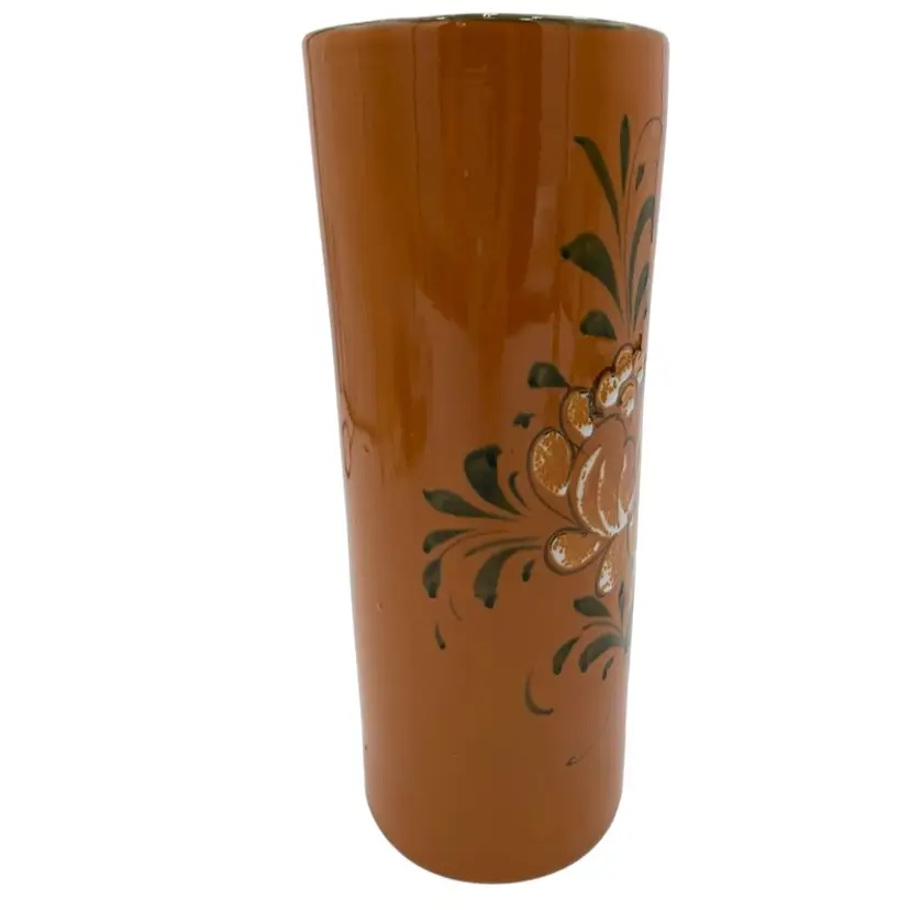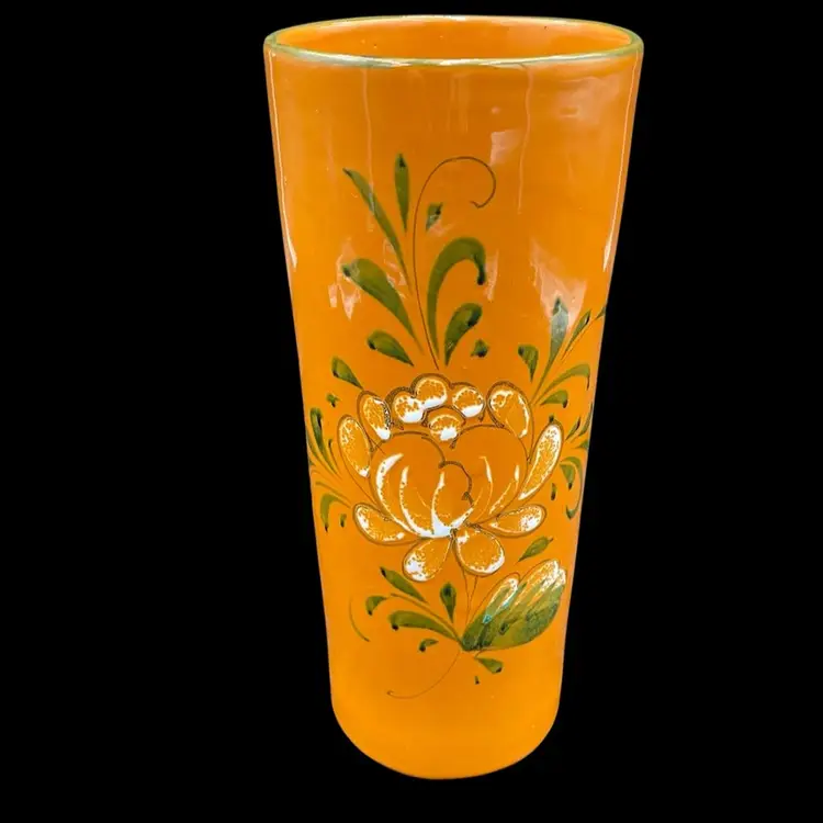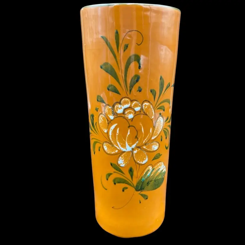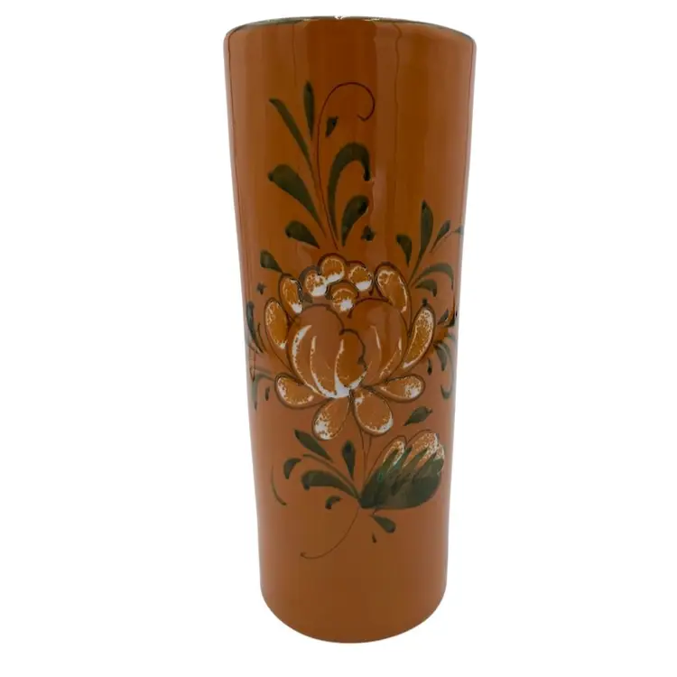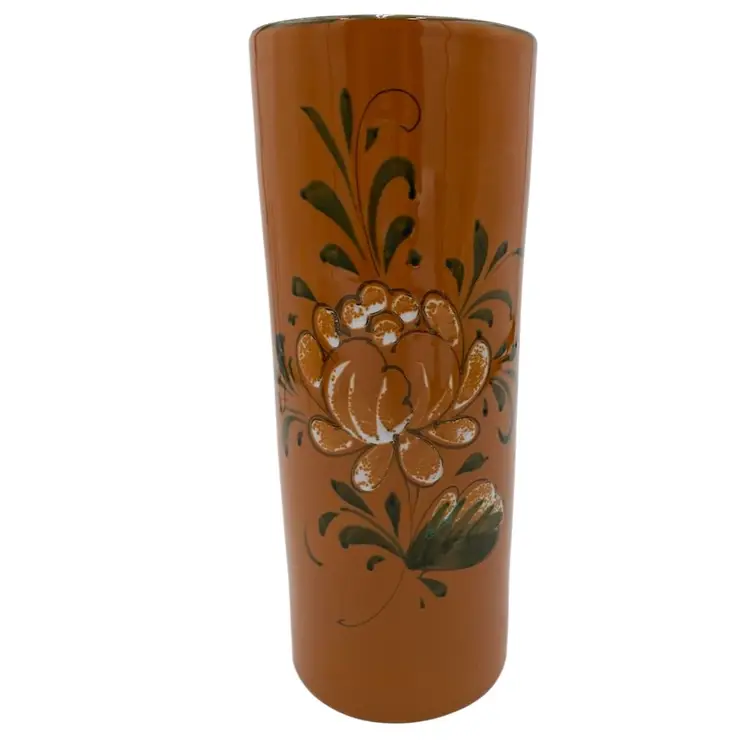 This beautiful vintage Italian art pottery cylinder vase features a stunning orange color with a white peony-style flower and greenery along with a green rim. The hand-painted design adds a touch of elegance to any room's decor. Measuring 9.8 inches in height and 4 inches in width, this vase is perfect for displaying flowers or as a standalone decorative piece. Crafted in the mid-20th century using traditional pottery techniques, this vase is an original piece. The glossy finish and printed backstamp add to its authenticity. This vase is a must-have for any collector or lover of vintage pottery.