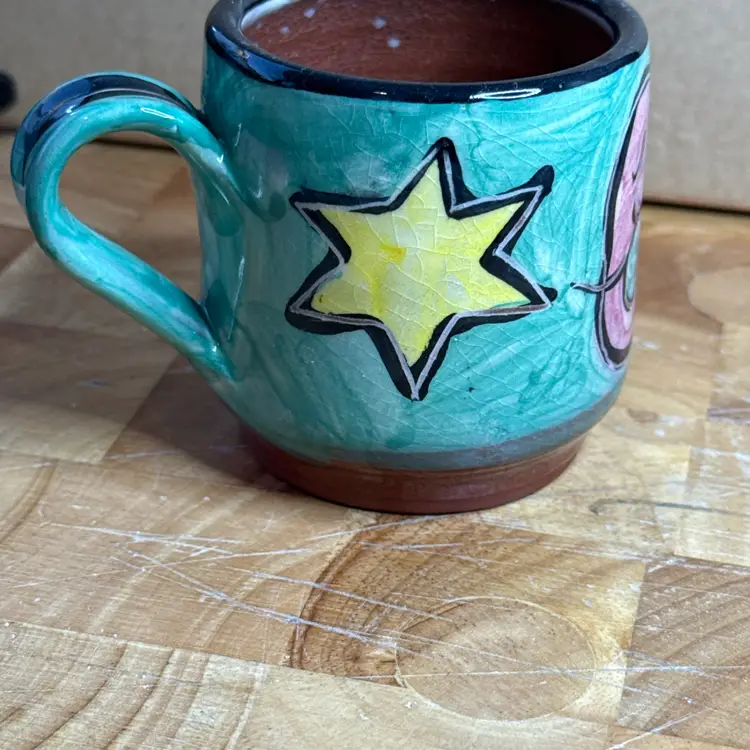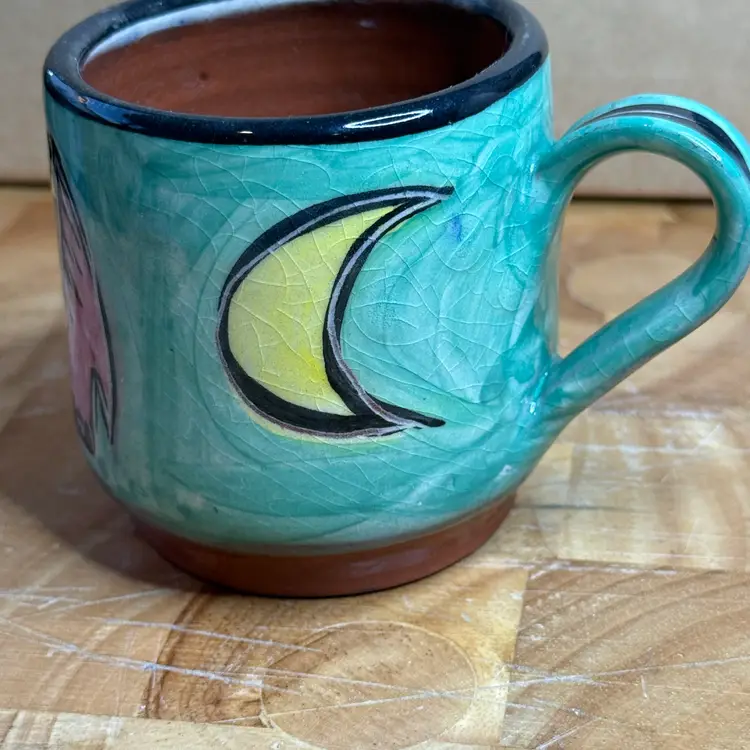 This vintage mug, crafted by CREAL (Creazioni Artistiche Laiche), is made from earthenware and finished with a soft turquoise glaze that feels like sky meeting earth. It’s about 3in. Each brushstroke is slightly unique, a reminder that it was shaped and painted by human hands, not machines.