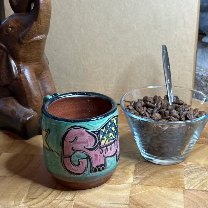 In a quiet hillside village in Italy, where the mornings begin with birdsong and strong coffee, there lived a gentle elephant known for bringing calm to every home he visited. Painted by hand onto warm terracotta clay, he carries a blanket of golden patterns said to hold tiny wishes for slow mornings and peaceful thoughts.