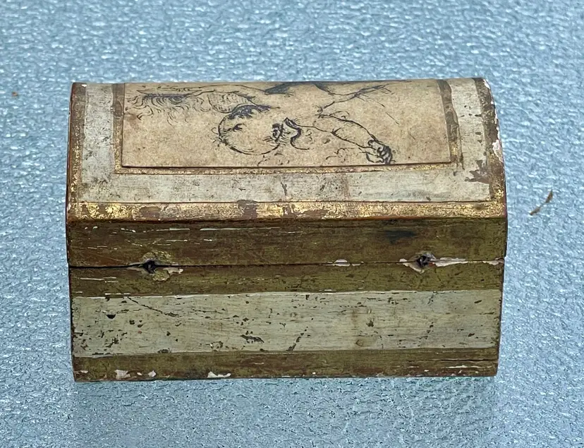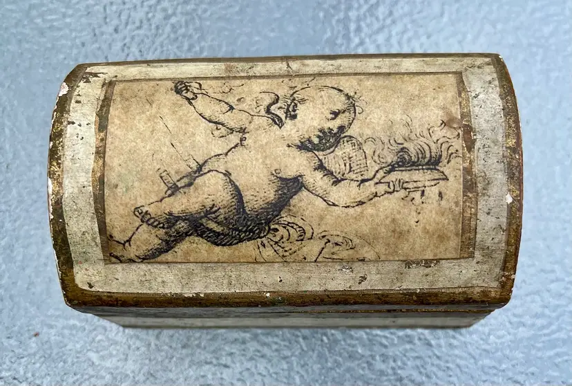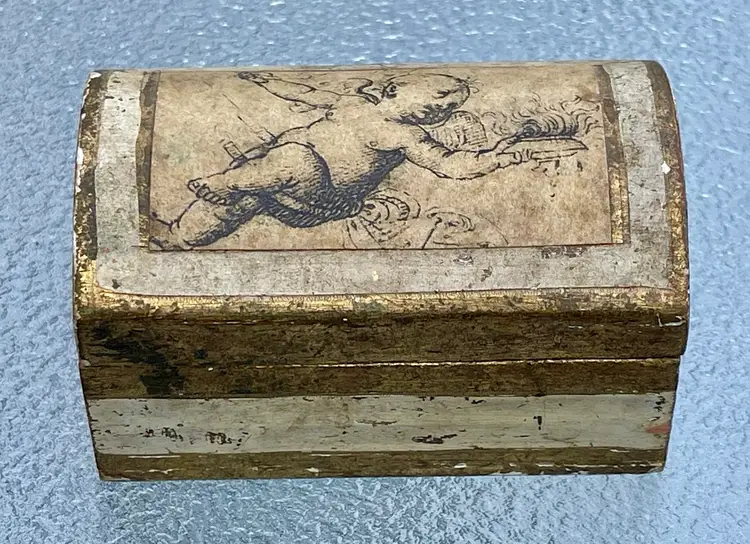 This vintage Italian Florentine decorated gold leaf wood box from Italy features an angel with a gold leaf finish, making it a stunning decorative collectible for any occasion. The small trunk-shaped box is made of wood with an antique Italian style, perfect for adults who appreciate handmade pieces from the 1970s. The hinged closure and intricate details make this original piece a unique addition to any collection, embodying the Periods & Styles theme in a timeless design.