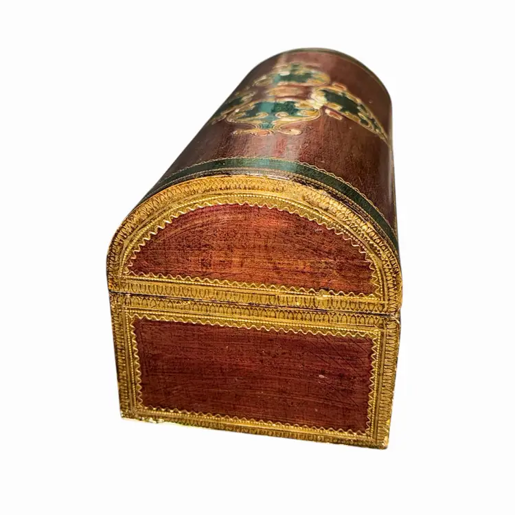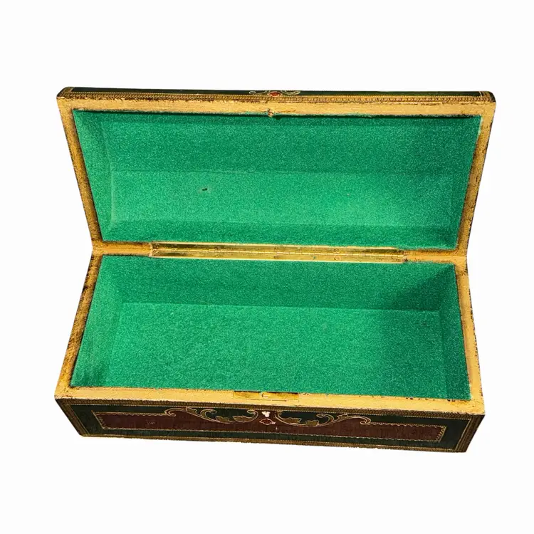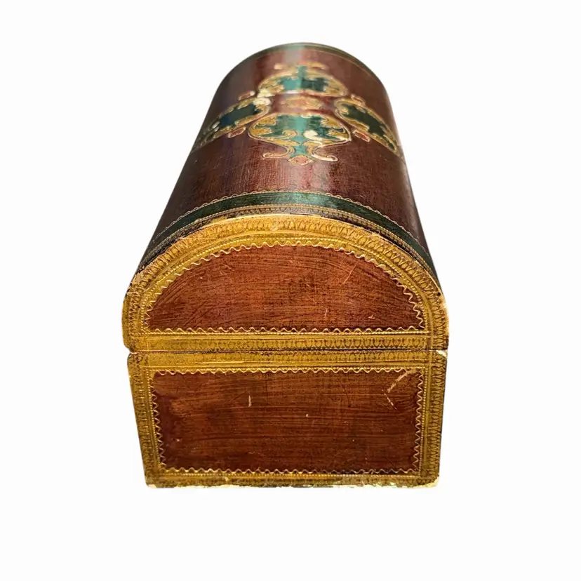 Beautiful vintage Italian Florentine jewelry box featuring classic red, green, and gold gilt detailing with ornate hand-painted accents. This piece has that timeless Florentine look that works perfectly on a vanity, dresser, or as part of a decorative display.