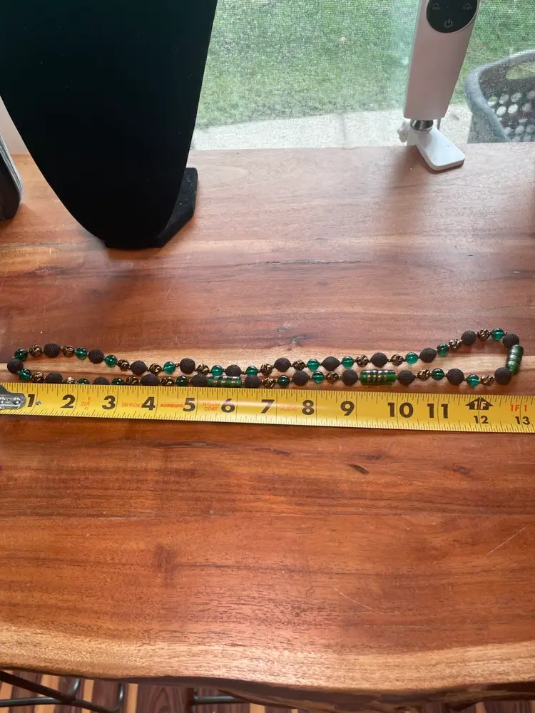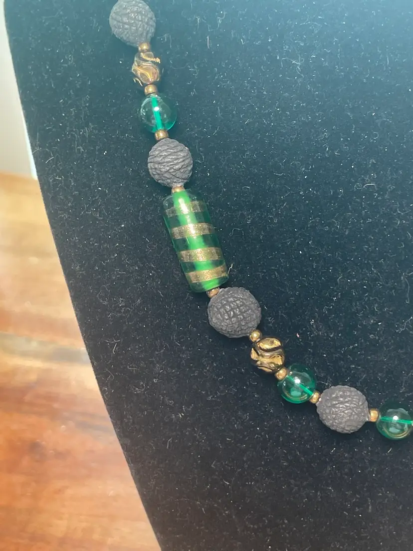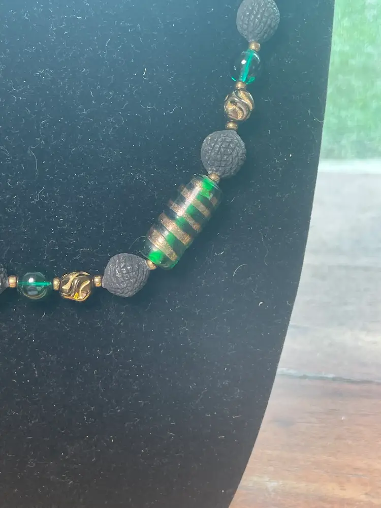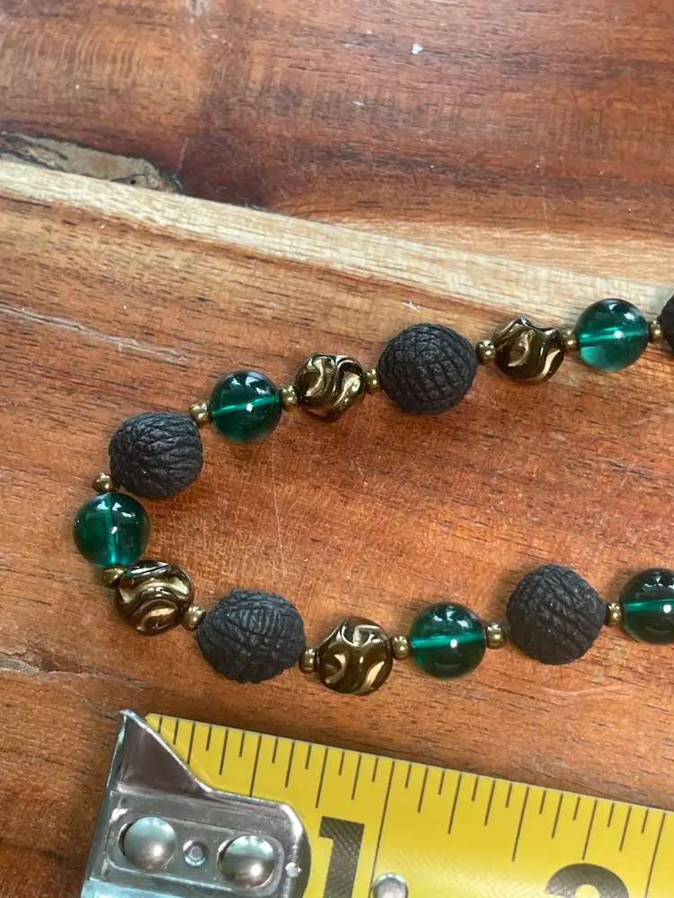 This necklace features a distinctive mix of green and black beads with gold-tone accents, potentially made with Italian or Murano glass beads. The specific design suggests it may be a vintage piece of costume jewelry.