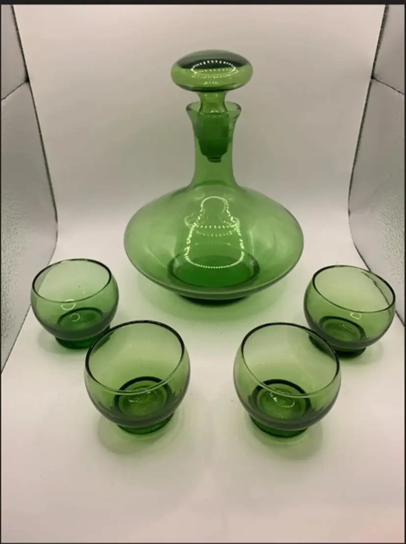 Set includes: • 1 green glass decanter • Original matching stopper (shown removed and in place) • 4 matching stemless glasses