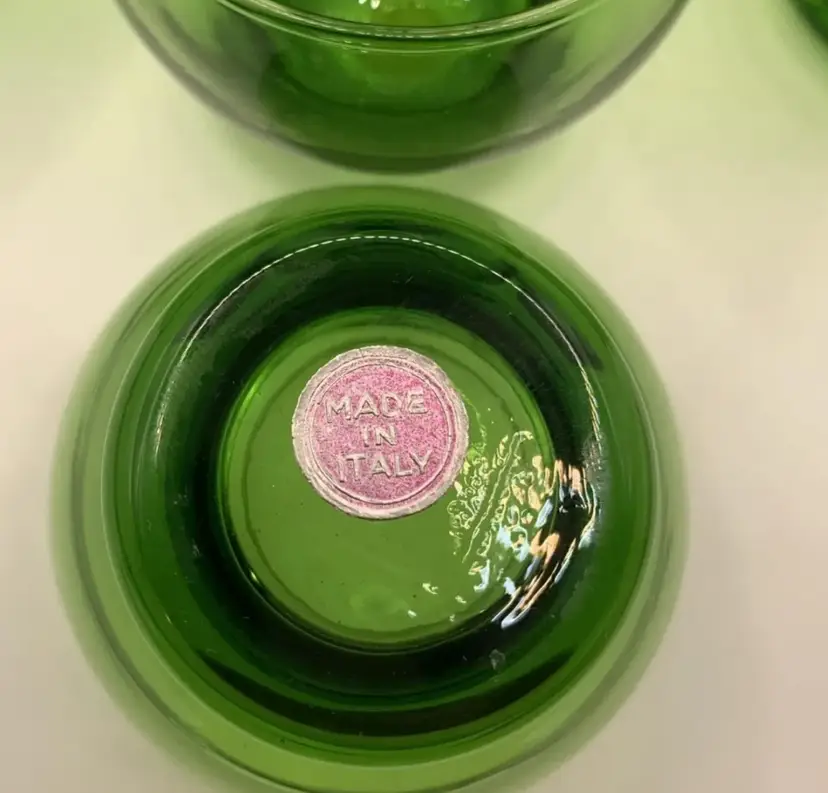 The decanter retains its original red and gold “Made in Italy” sticker on the base (see photos). Glass is plain green with no etching or decoration, making it versatile for both vintage and modern décor.
