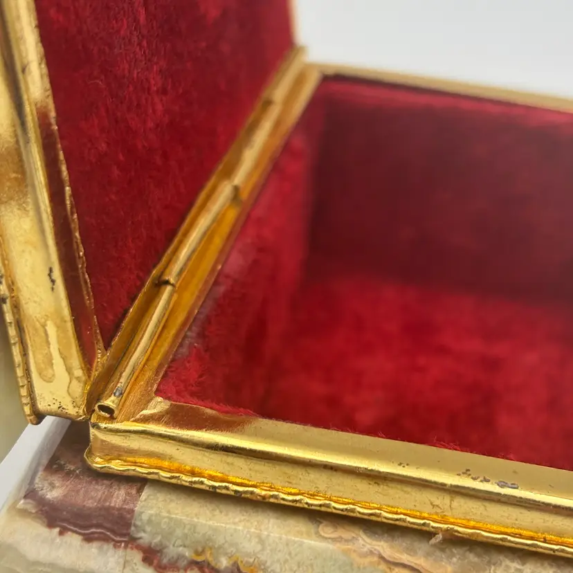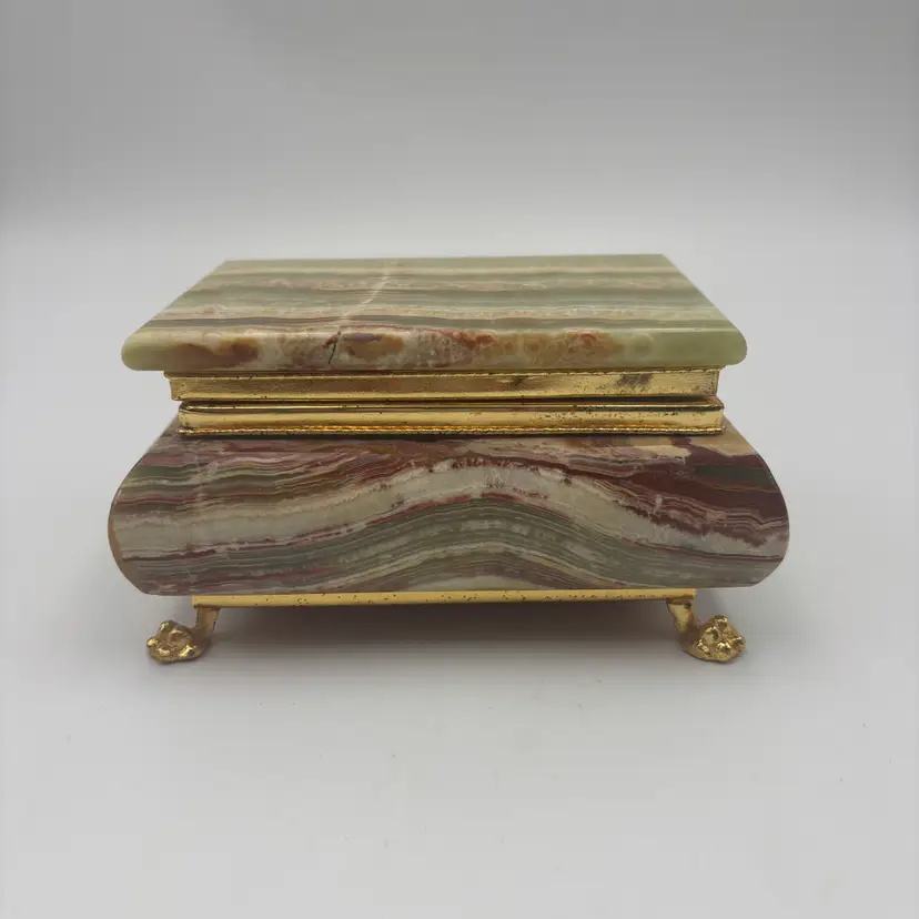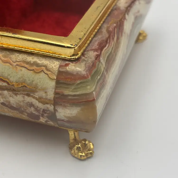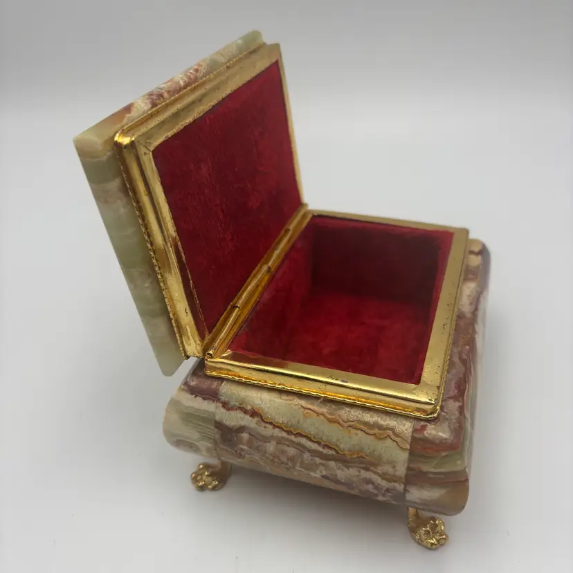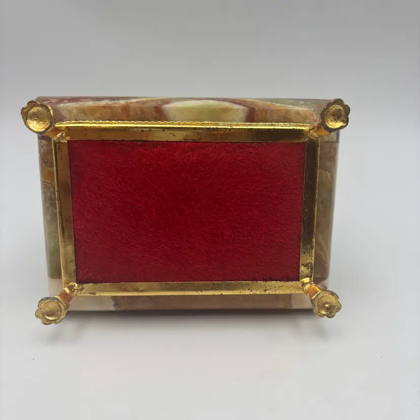 Features: it has a marbled finish, with brass metal hardware and looks like the stone is onyx. It has a felted inside and bottom.