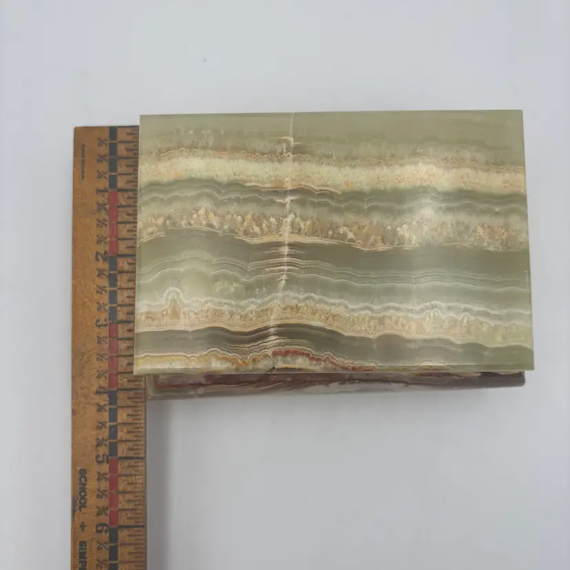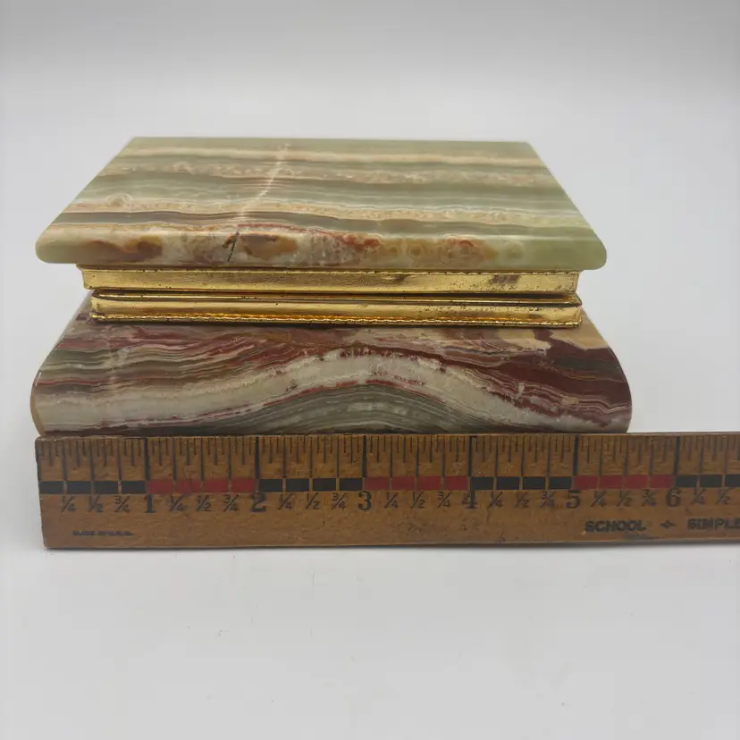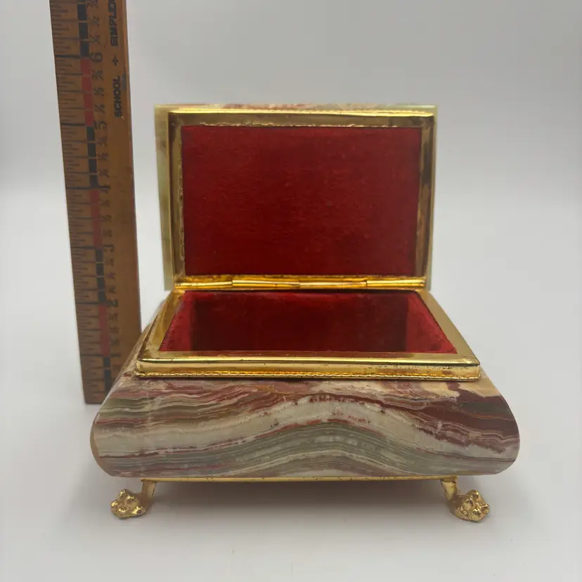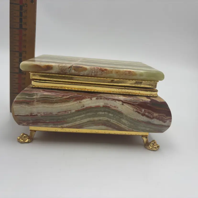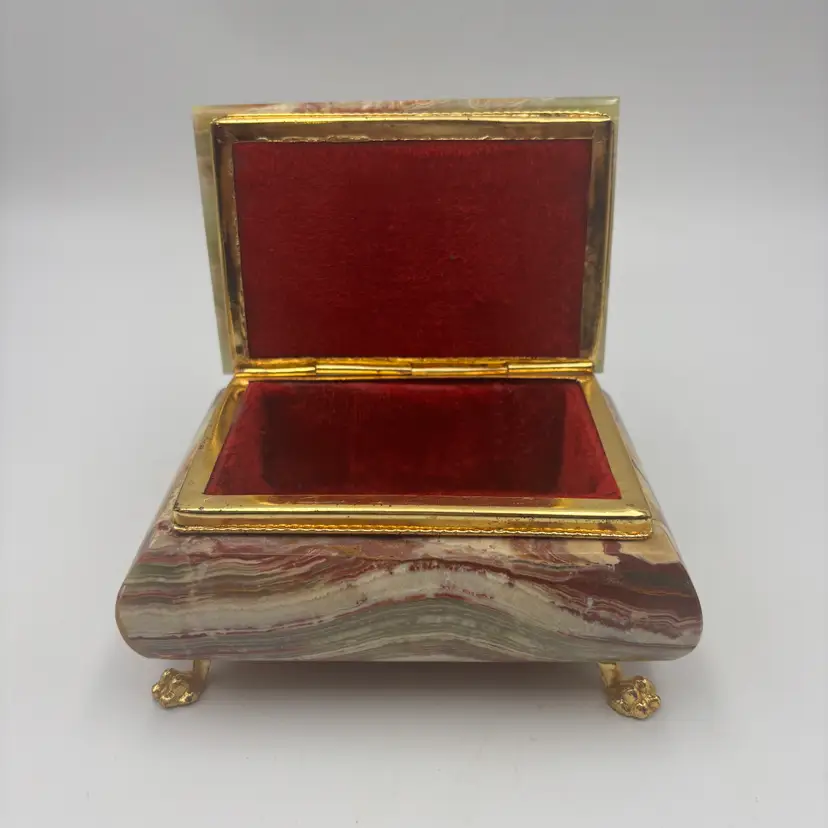 Features: it has a marbled finish, with brass metal hardware and looks like the stone is onyx. It has a felted inside and bottom.
