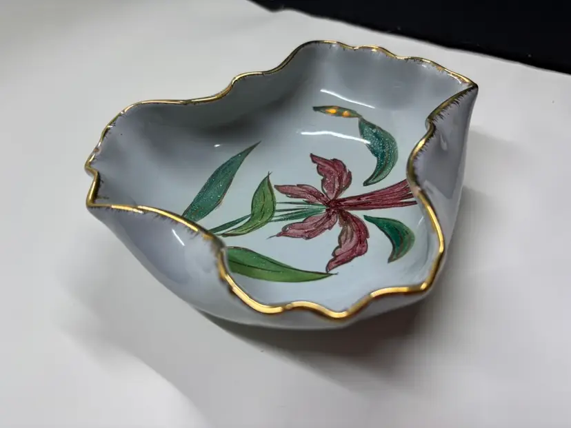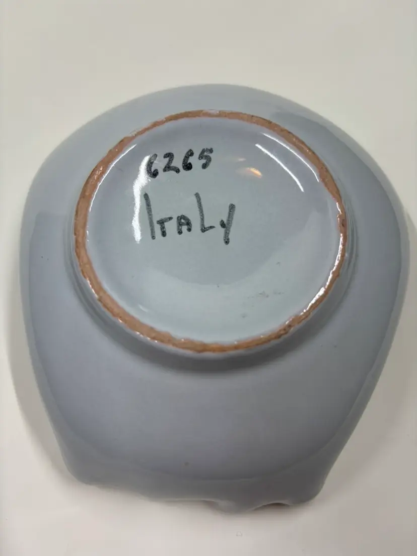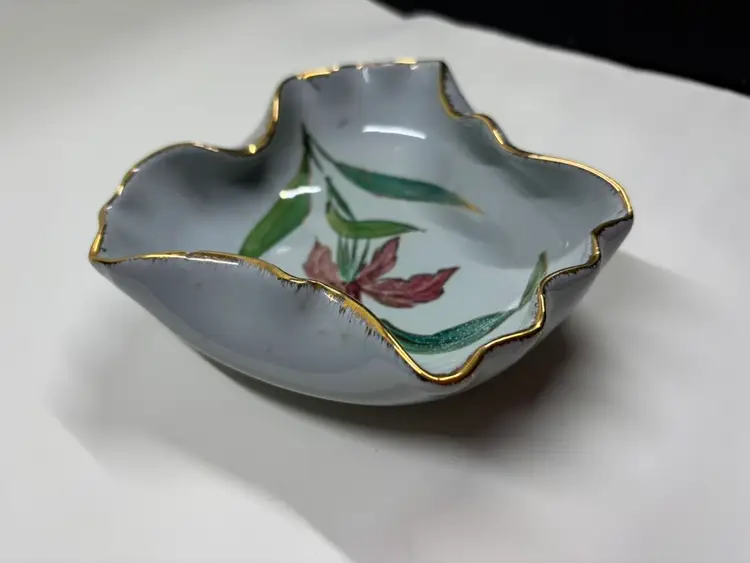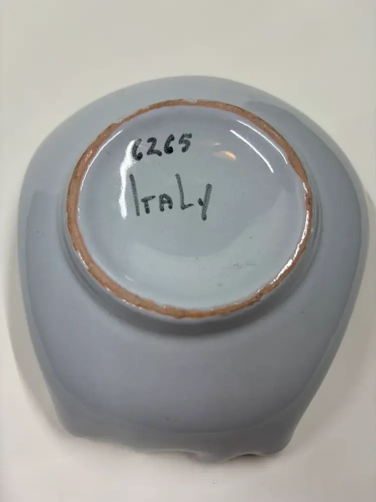 A decorative bowl featuring a distinctive ruffled, free-form edge and a grey body with a subtle lustrous glaze. The bowl is hand-painted in the center with a floral design (likely an Iris) and accented with heavy, raised gold gilt on the rim. The underside is marked with the handwritten model number "6265" and the country of origin "ITALY". This type of bowl was very popular for use as a candy dish or table centerpiece in the mid-20th century. The ceramics were often created in major Italian pottery districts like Deruta, Nove, or Florence. The bowl is approx. 5.5" and does have 2 fleabites on the top gold edge but do not effect its use or detract from the design.
