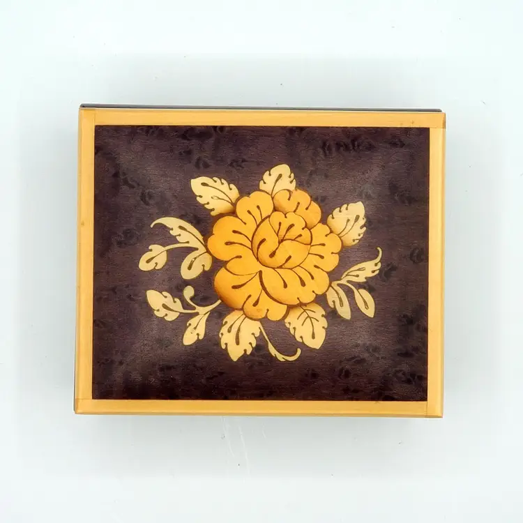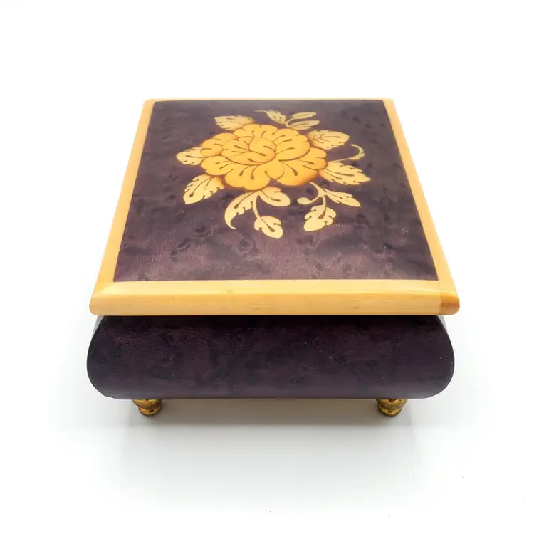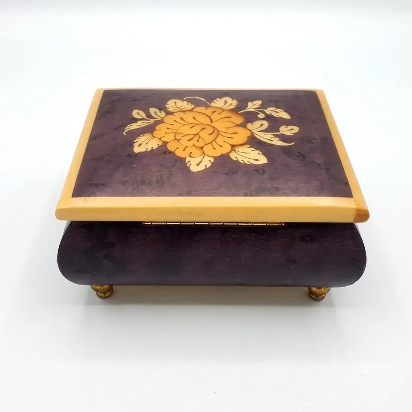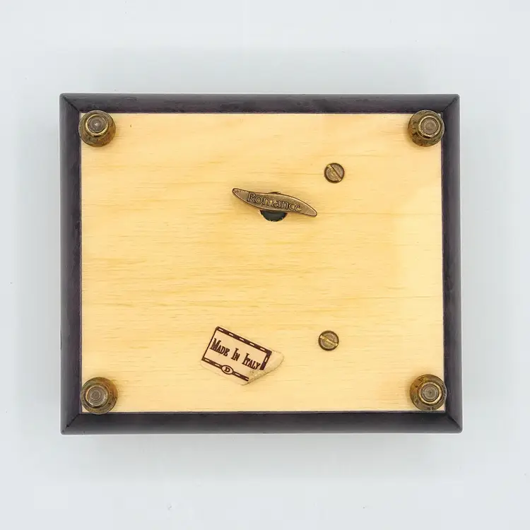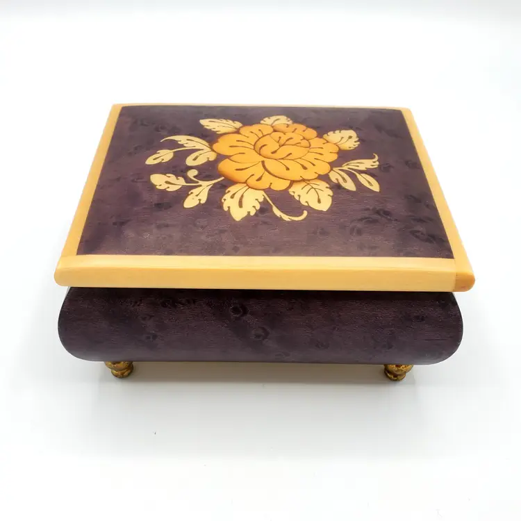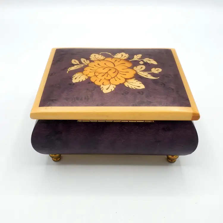 This sweet little jewelry box features Swiss movement and the song "Amazing Grace." The music plays perfectly. The box itself has no damage. However, the plastic that covers the music element comes out and is also replaced easily into its slot. Overall, this jewelry box is very clean. It measures approximately 4.5"L x 4"W x 2"H. Thanks for looking!