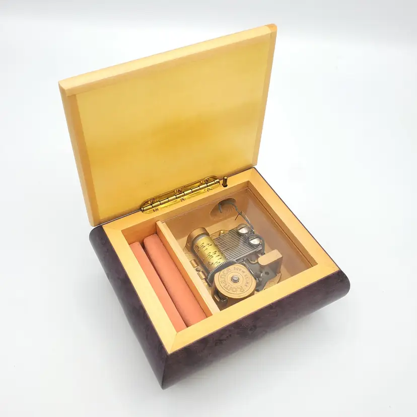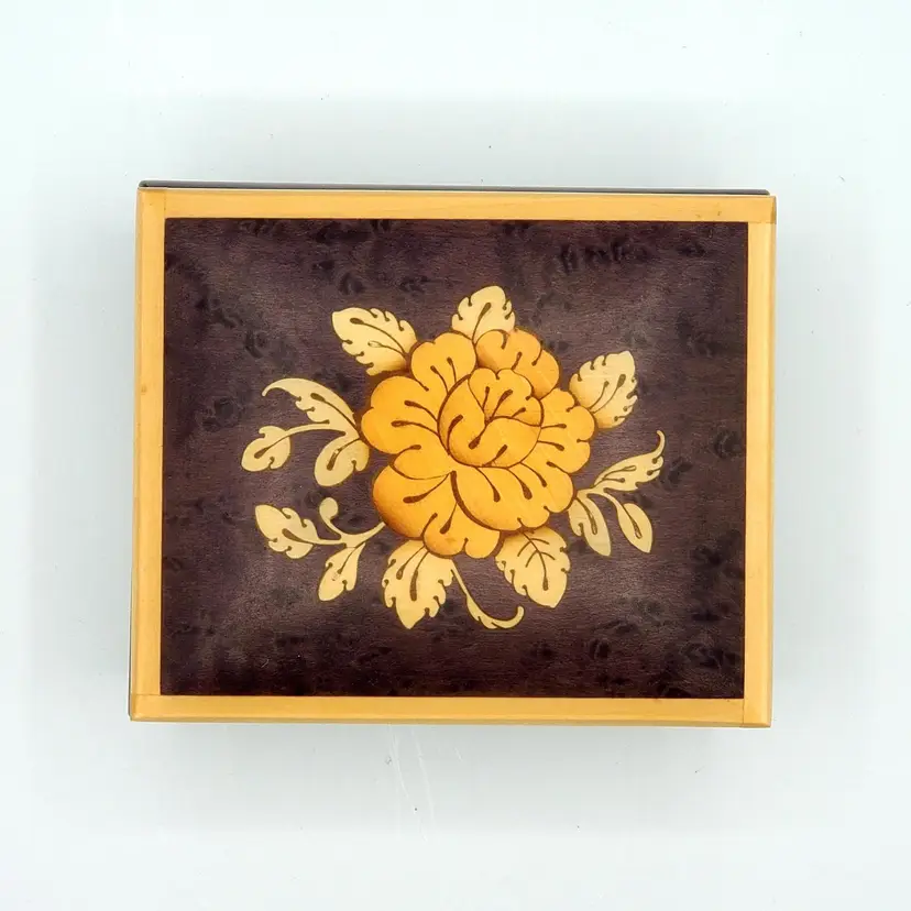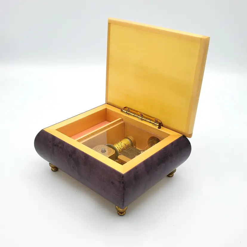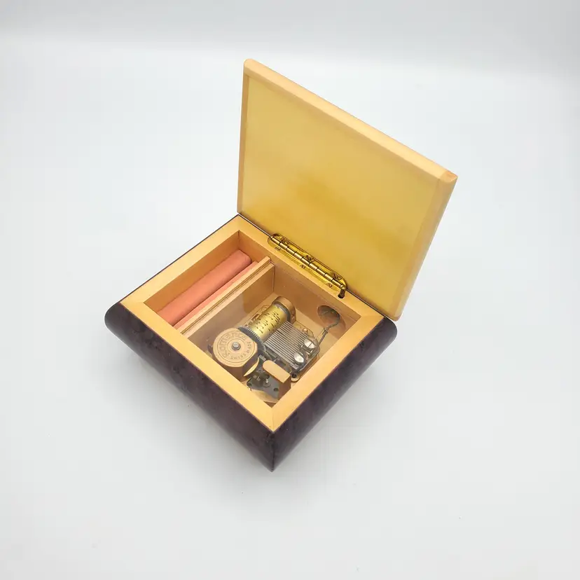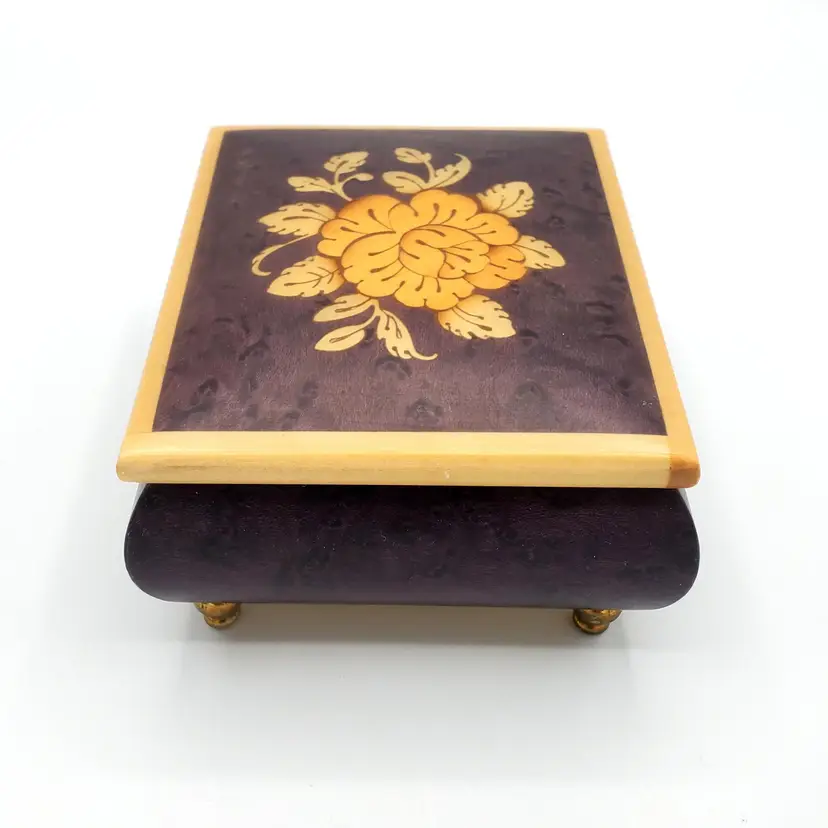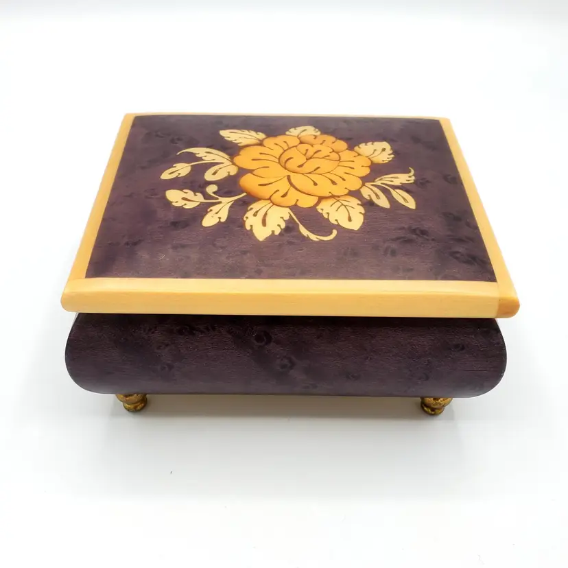 This sweet little jewelry box features Swiss movement and the song "Amazing Grace." The music plays perfectly. The box itself has no damage. However, the plastic that covers the music element comes out and is also replaced easily into its slot. Overall, this jewelry box is very clean. It measures approximately 4.5"L x 4"W x 2"H. Thanks for looking!