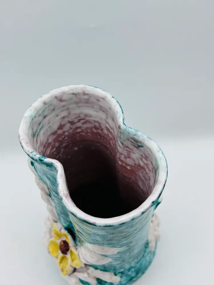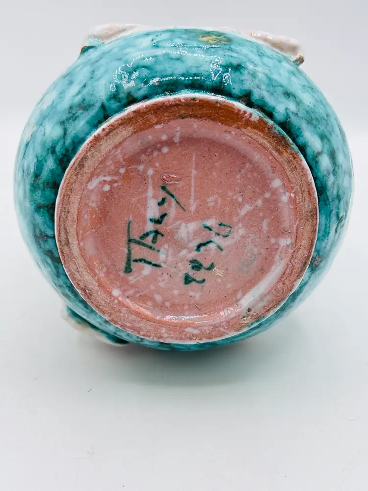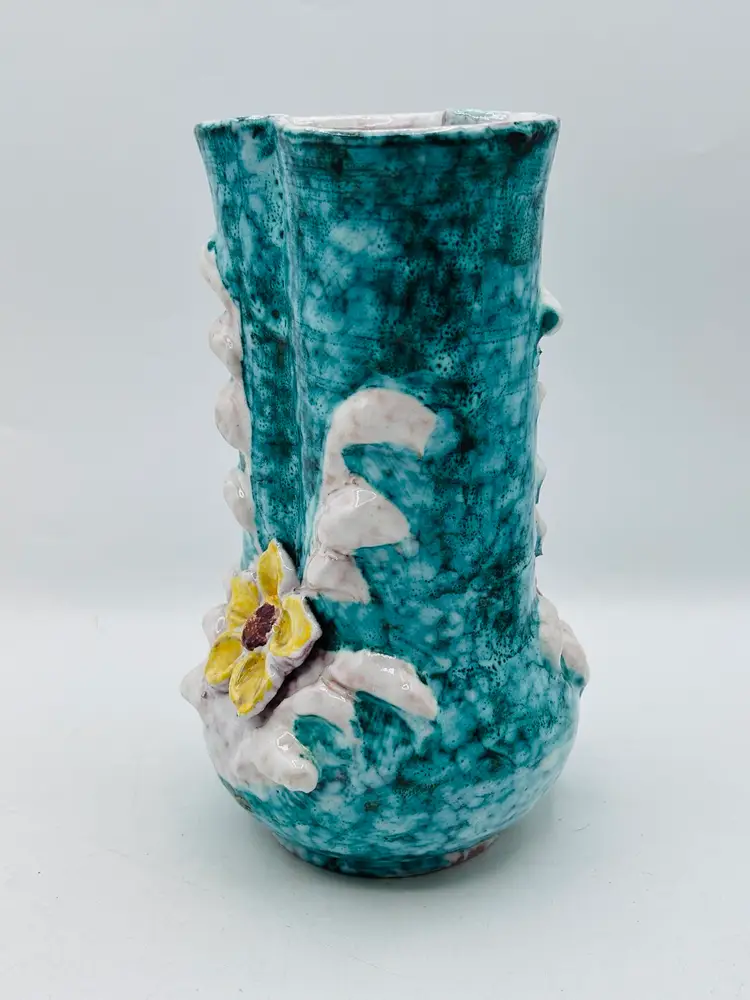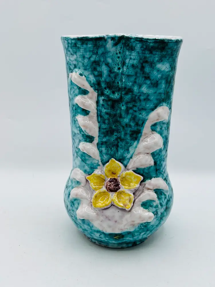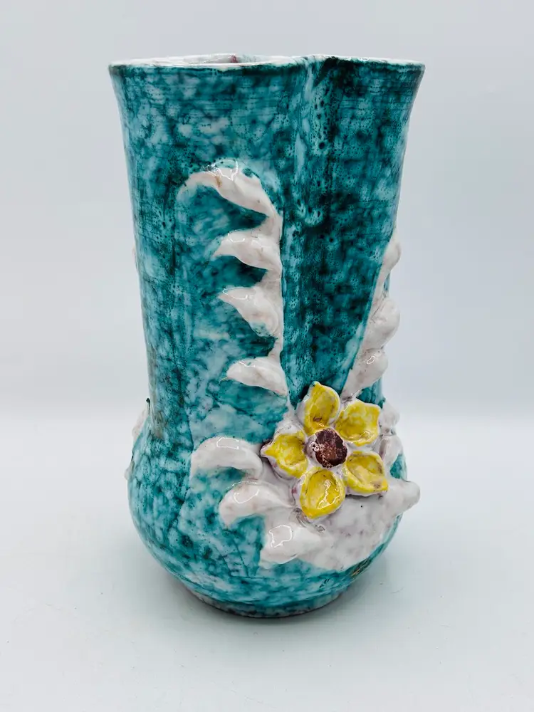No damage no flaws and amazing condition. Applied flower is a gorgeous touch to this beautiful vase..