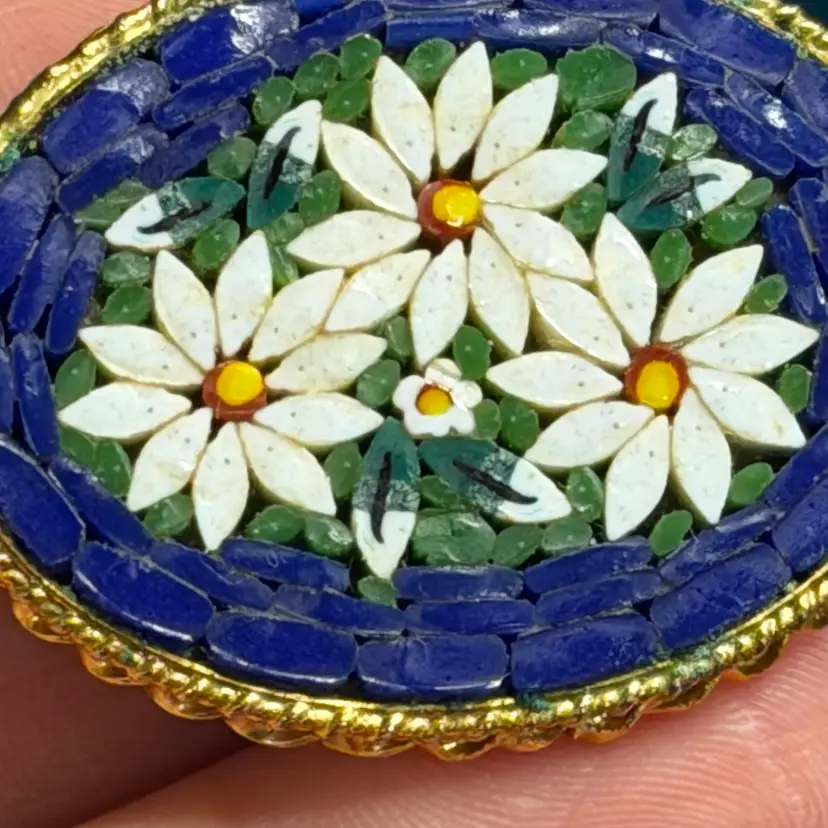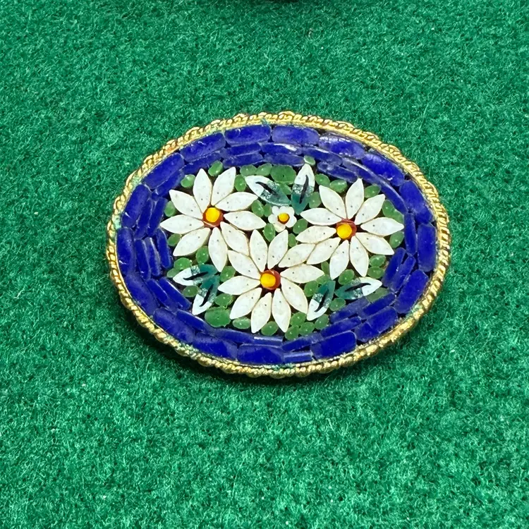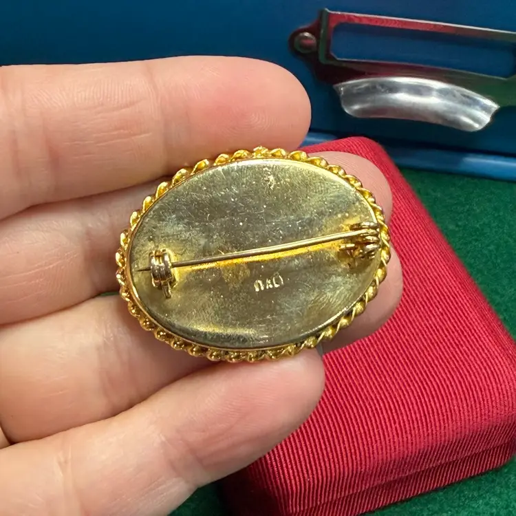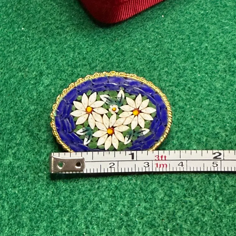 This charming brooch is in good condition with all cane pieces present. It is about 1-7/16 inches long.