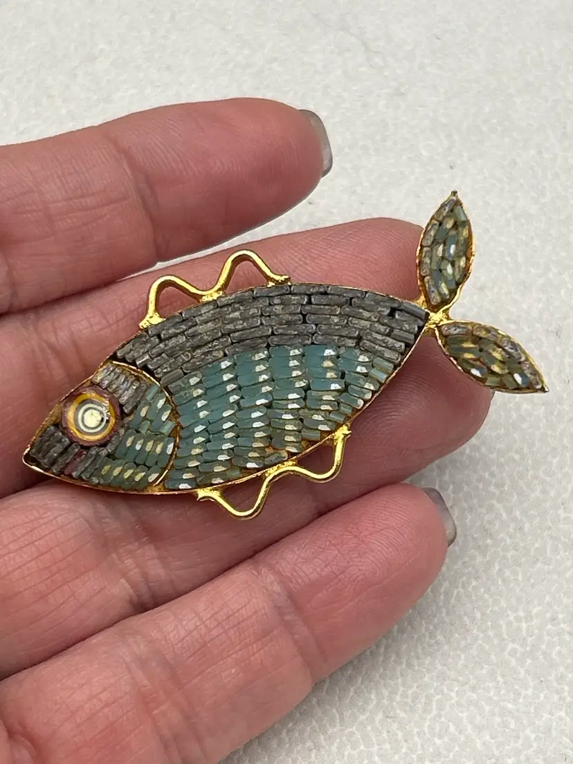 Notable Details • Vintage Italian micro mosaic fish brooch • Measures approximately 2 inches • Hand-set colorful glass tiles • Fun figural fish design • Marked Made in Italy • Gold tone/brass-tone setting • Secure vintage pin clasp • Great collectible conversation piece