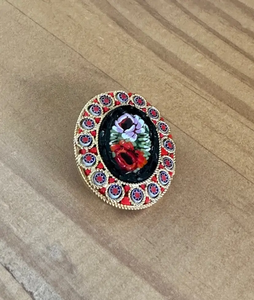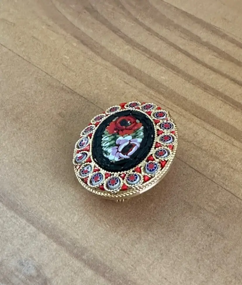 This Vintage Italian Micro Mosaic Floral Pin Oval Brooch is a stunning piece of vintage jewelry that exudes elegance and charm. The intricate floral design, crafted with multicolor micro mosaic detailing, makes it a perfect accessory for various occasions such as Mother's Day, weddings, anniversaries, birthdays, and more. The oval shape adds a touch of sophistication to any outfit, making it a versatile and timeless addition to any jewelry collection.