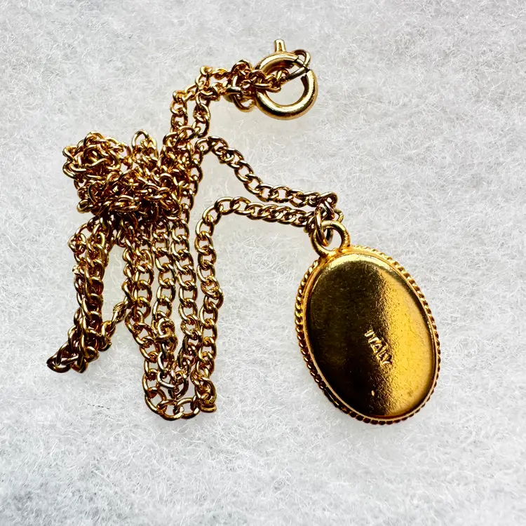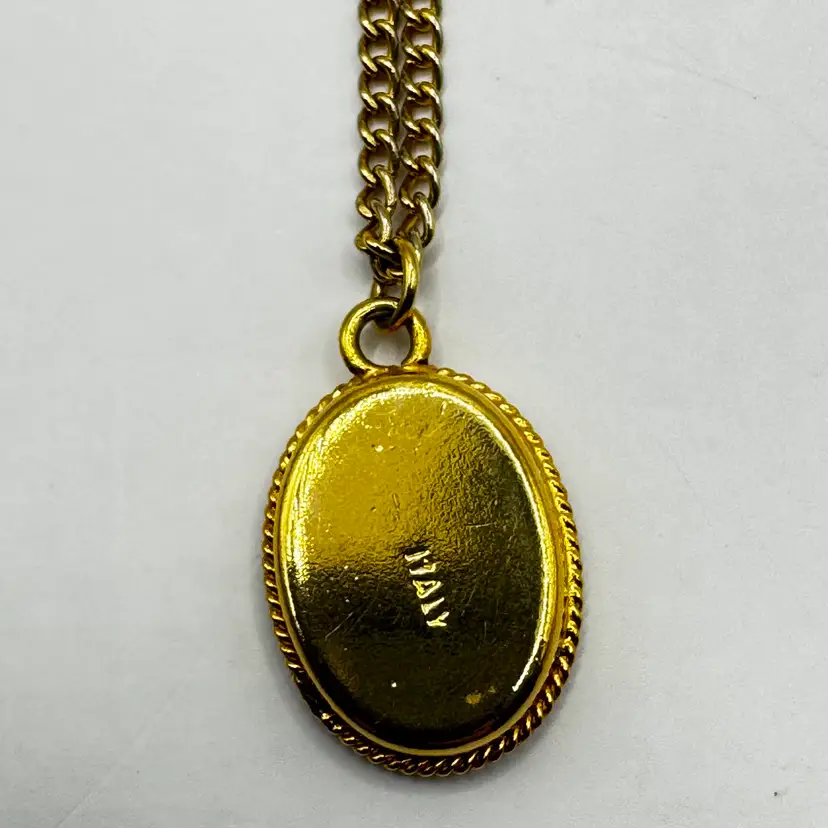 Vintage Italian oval micro mosaic single flower pendant and necklace. Absolutely beautiful. Gold rope wrapping around the outer edge. Center green background with one yellow flower and tow leaves on each side, has pearl white wrapping around the flower. Stamped Italy on the back of the brooch. Measuring 1”. Necklace measures 8”.